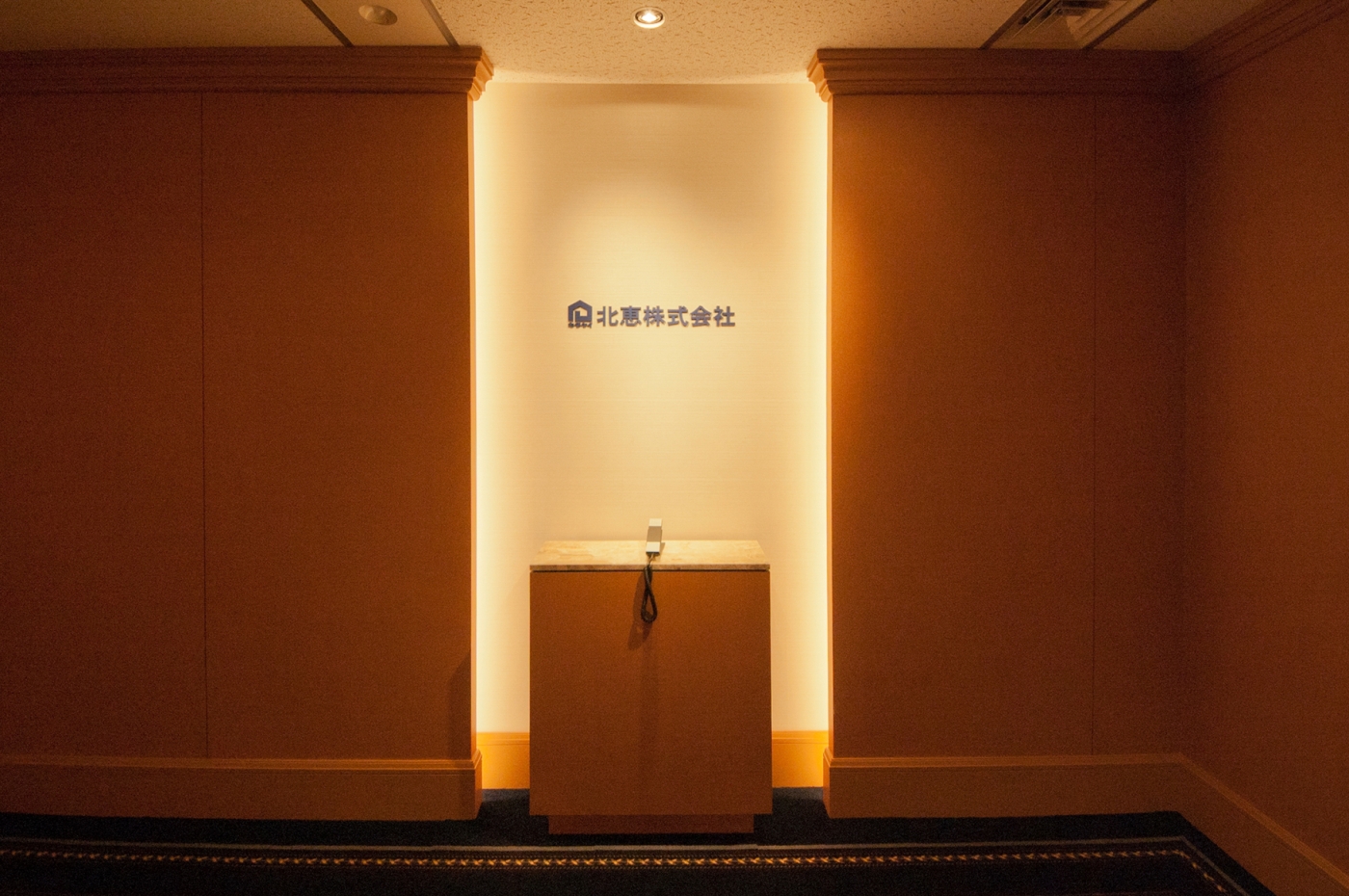帝国ホテルタワーにオフィスを構える北恵様。「エレベーターホールから統一感を持たせたデザイン」というご要望の中で、風合いの良いカーペットや、ホテルなど高級感を出す際などに使用する木製の面材、ブラケットランプなどを用い、ホテルの廊下を表現しました。素材や色味、石の種類まで、こだわりの詰まった空間に仕上がりました。「大切なお客様へのおもてなし」をテーマに、住まいの総合サプライヤーとして信頼感と安心感を与える、温かなオフィスが誕生しました。