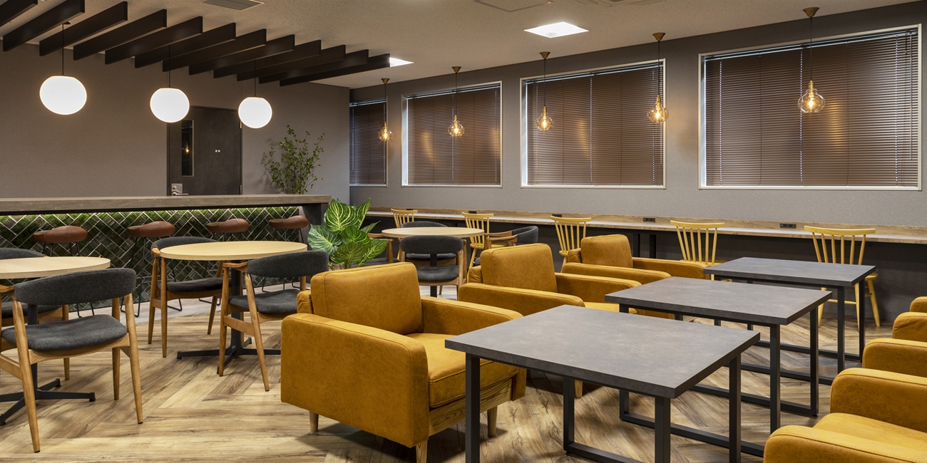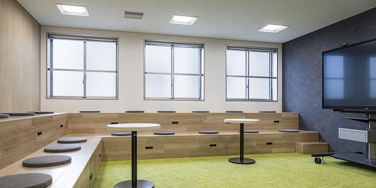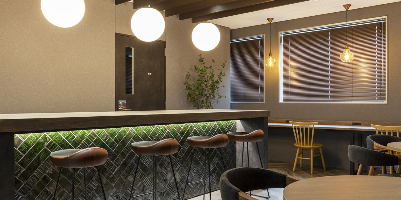 トヨタとレクサスの販売チームが初めて協業する店舗のバックヤードとなるオフィススペースの開設プロジェクト。営業スタイル変革へのチャレンジや、新しいチーム体制の構築を目指しオフィスをデザインしました。コンセプトは『融合=FUSION』とし、風通しの良さやコミュニケーションの活性化を大切に、新しい価値の創造を目指した空間となっています。1階のエンジニア控室では、業務効率を上げるため隣接する整備工場への動線を考慮し、収納什器などの配置を綿密に設計しています。2階のワークスペースでは、販売チームの垣根を越えて自然と交流が生まれるよう、オリジナルでデザインした大型テーブルや、床上げで目線が変わる工夫を取り入れました。カフェスペースは、グリーンとブラウンのタイルをあしらったカウンターがアクセントとなる、洗練されリラックスできる空間となっています。