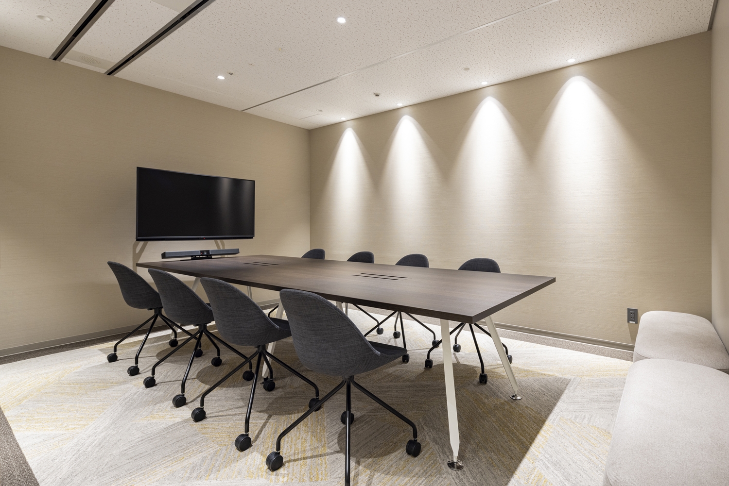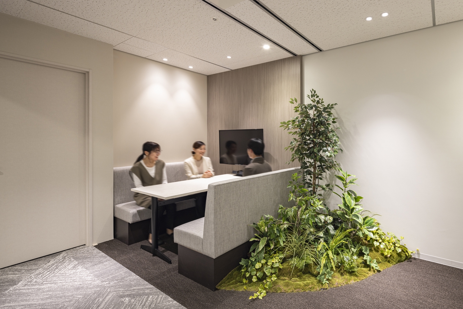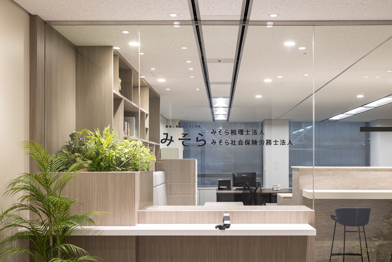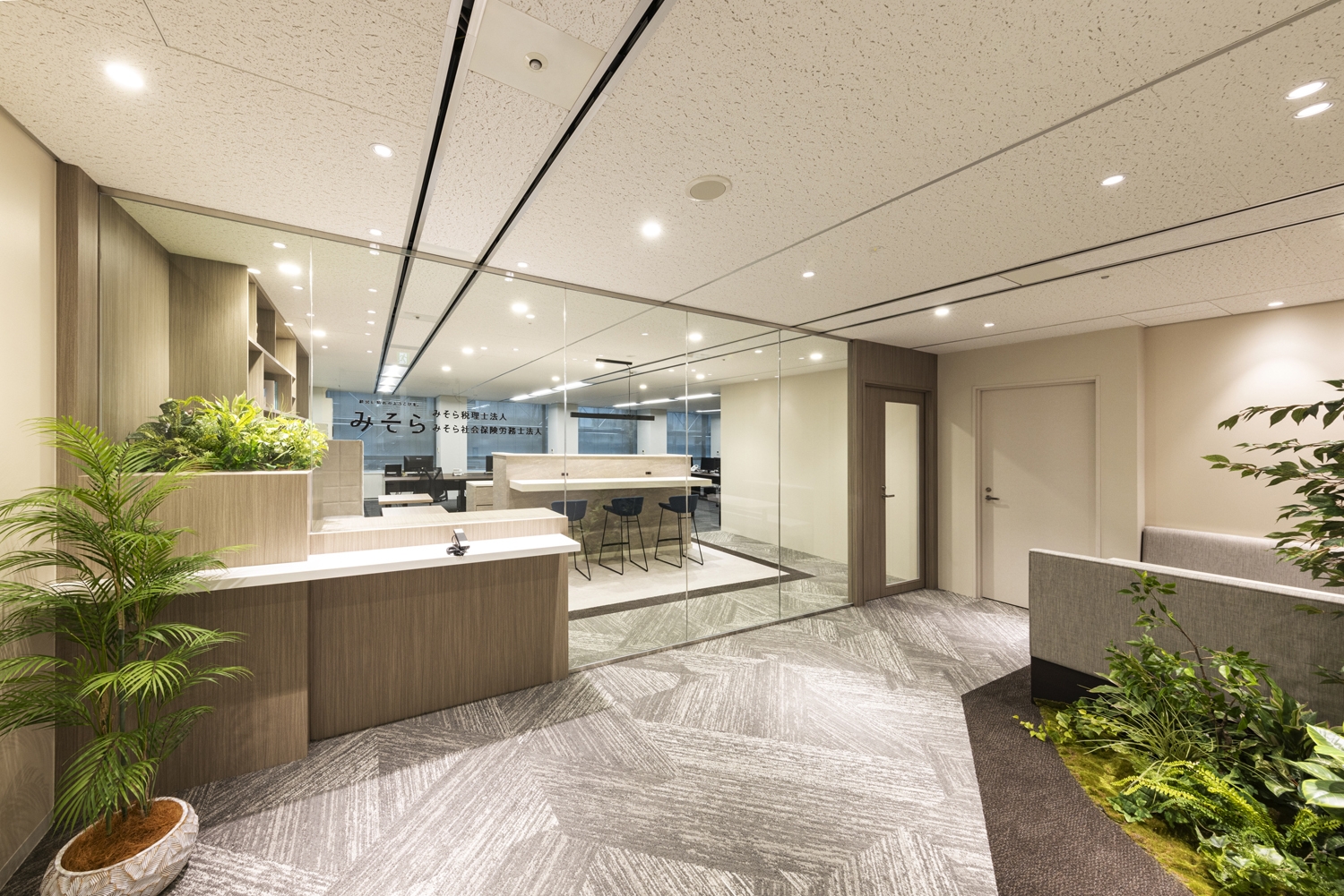 大阪オフィスの採用強化を目的としたオフィス移転。神戸オフィス開設に続き、今回で4回目のプロジェクトとなりました。今後のオフィスづくりの基盤にもなるようなコンセプトを検討し、みそら税理士法人様という企業と「求職者」「クライアント」「従業員」それぞれを「結ぶ」場と定義し、『結ぶオフィス』をコンセプトに掲げました。ワークスタイルを従来の固定席からフリーアドレスへ変更し、カフェスペースを中心に配置させたり、執務エリアに他拠点を投影するサイネージモニターを設置したりと、社員同士のつながりをより強める仕組みを導入しています。エントランスはガラスを使用し抜け感を意識したデザインにし、訪れたお客様にもひと目で温かさや繋がりを感じていただけます。アースカラーを中心に使用し、安心感・信頼感を表現しました。全社員採用を掲げ人の温かさやアットホームな社風を重要視するみそら税理士法人様のビジョンにリンクしたオフィスとなりました。