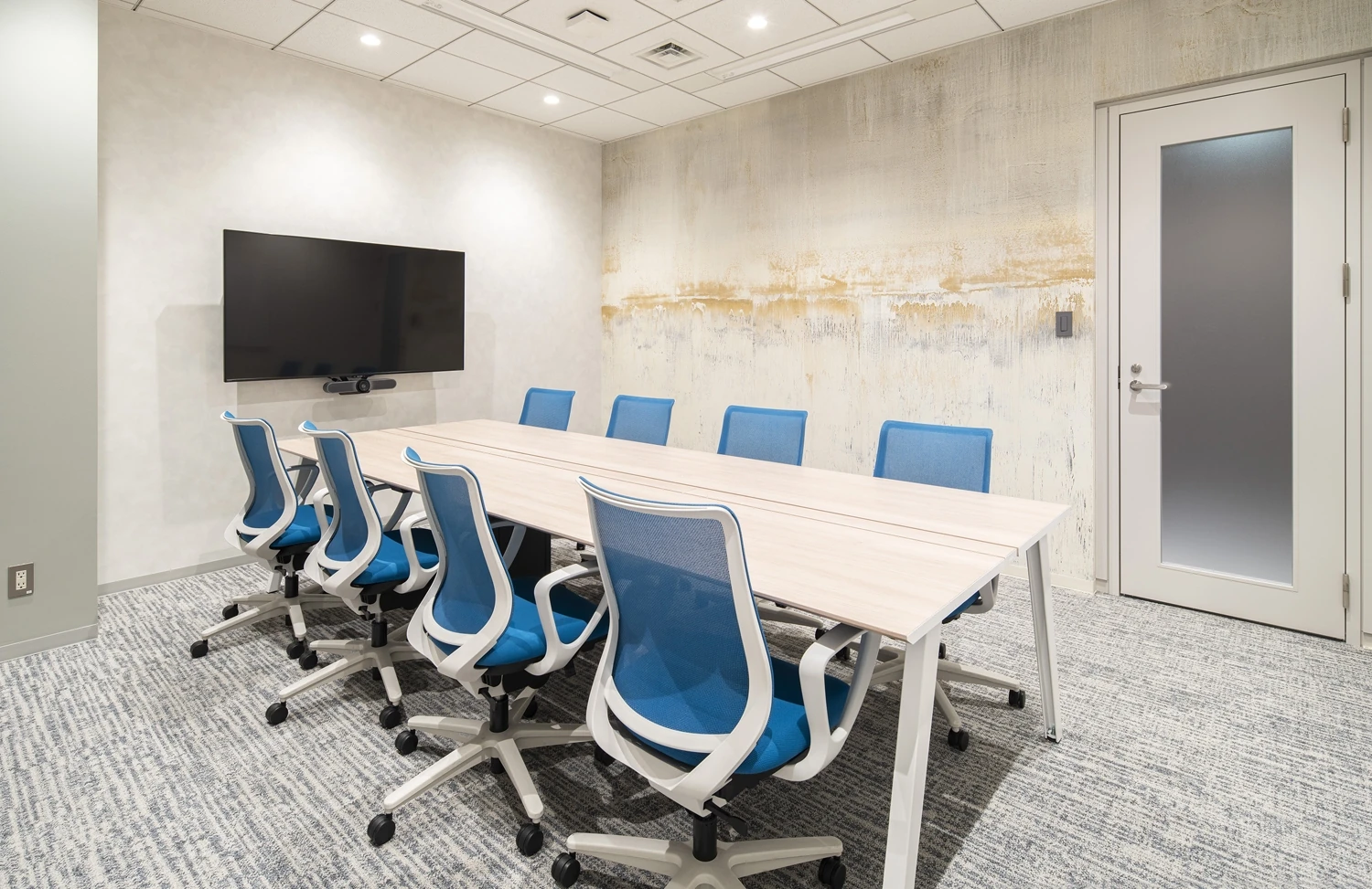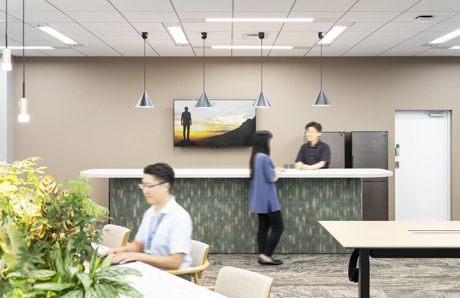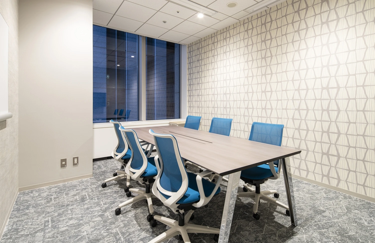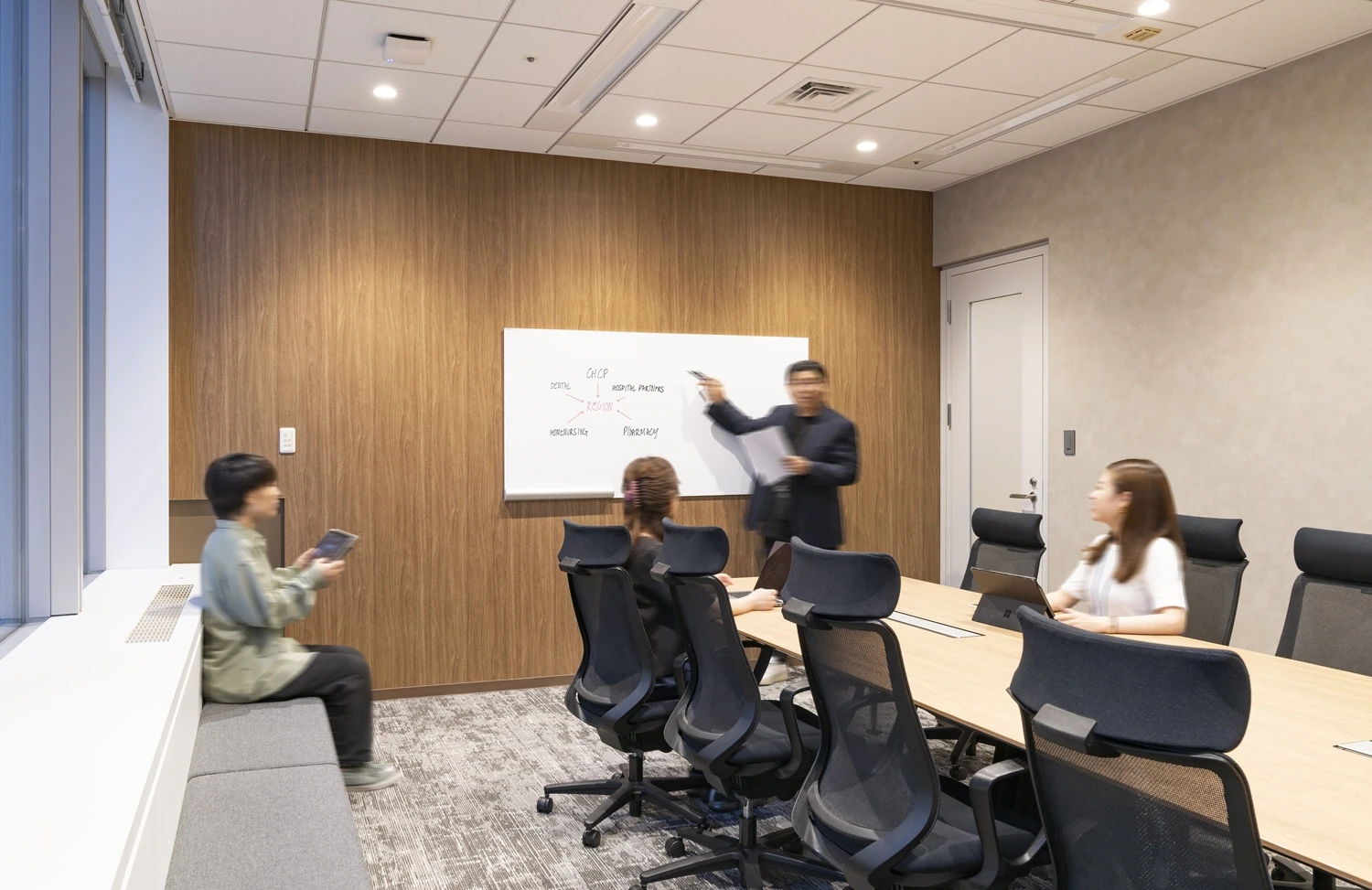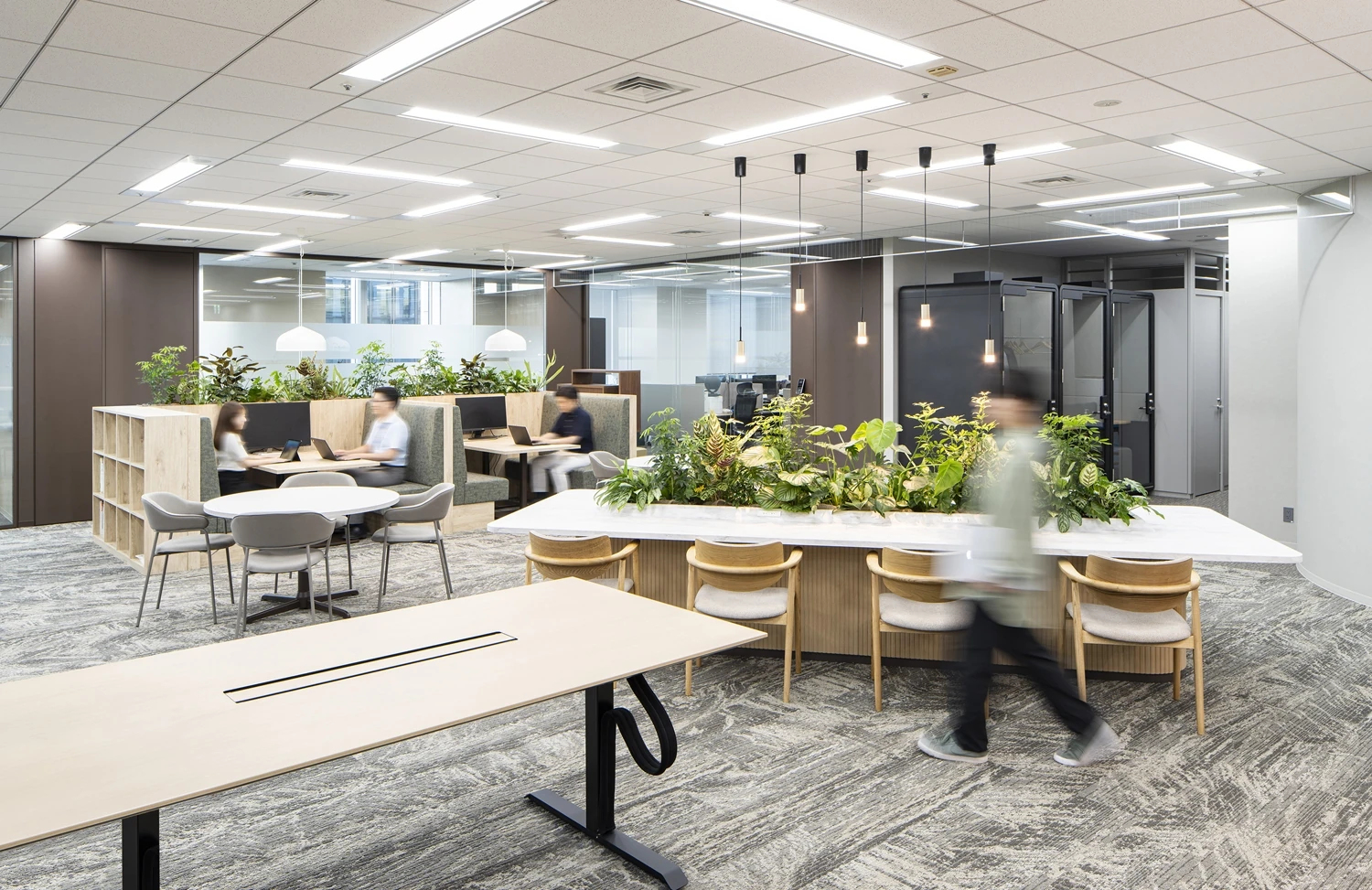以前のオフィスに引き続き、今回はグループ会社の統合移転をお手伝いしました。グループ会社ごとに分かれていたフロアを1フロアに集約。会社ごとのフリーアドレスを採用してはたらき方も統一し、オープンスペースを設け異なる会社間でも自然と会話が生まれる仕組みをつくりました。エントランスは全体的に丸みや曲線をもたせ、コーポレートカラーのグレーとナチュラルな木目を中心に柔らかさや安心感を表現しています。コミュニケーション活性化を通してそれぞれの企業風土が融合し、グループ会社としての結束力が高まるオフィスが完成しました。