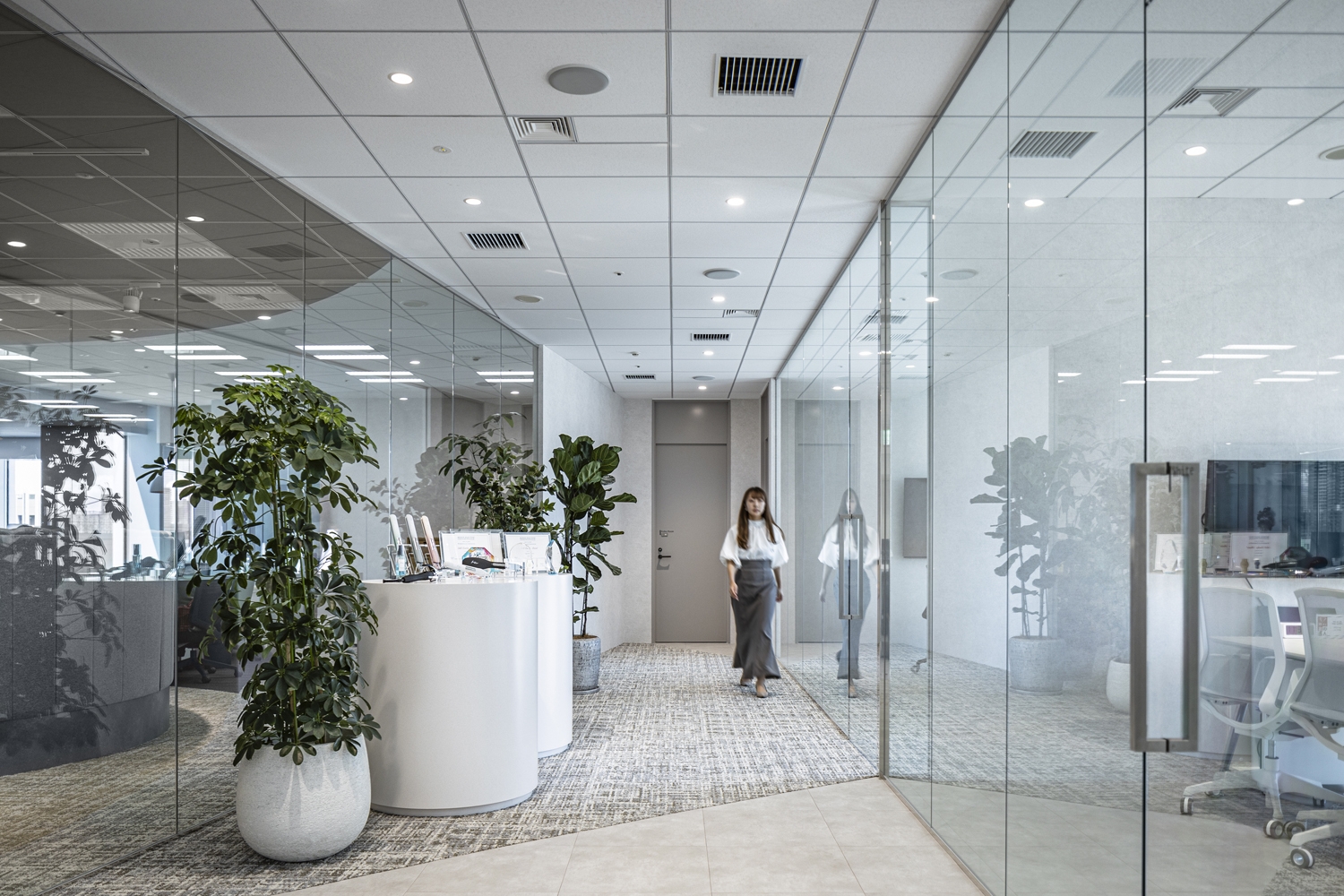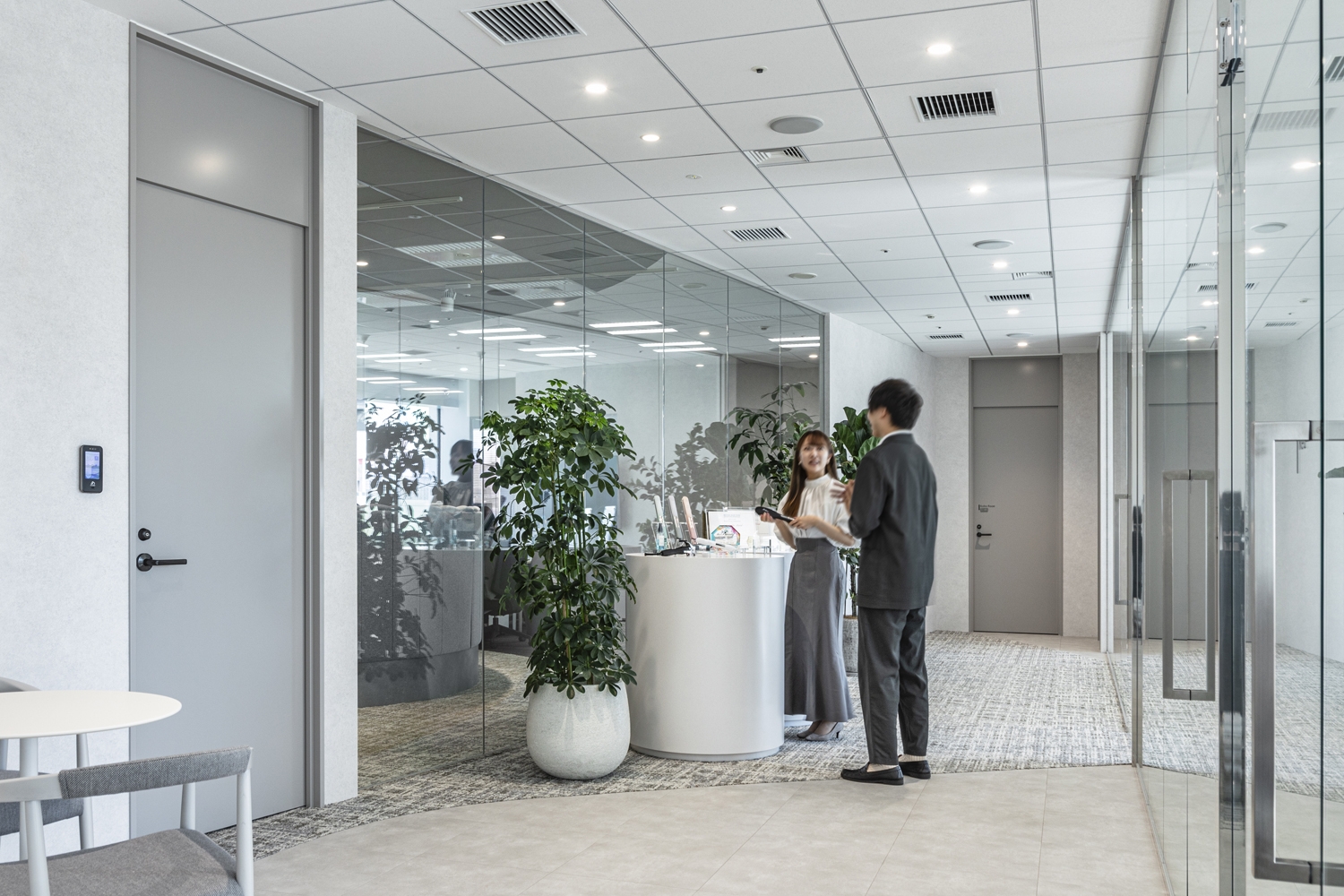 以前の東京オフィスに続き、今回も東京オフィスの移転プロジェクトを担当しました。人員の増加に伴いコミュニケーションエリアの不足が課題としてあったため、コミュニケーションやリフレッシュができるスペースの拡充を図りました。ワークスペースは、一人ひとりのパフォーマンス向上を図るため固定席での運用は継続し、今後の人員増加を見越したレイアウトとしました。エントランスでは事業ブランドの透明感をデザインし、自社製品をディスプレイすることでお客様には製品の世界観を感じていただき、社員にとってもプロダクトを身近に感じ誇りを持てる空間となりました。「新しいことを楽しみながら取り組む」という企業カルチャーのとおり、移転後は社員の皆さまが率先してオープンな打ち合わせスペースやリフレッシュスペースを使用することで、人が流動的に交わり、コミュニケーション量増加につながっています。