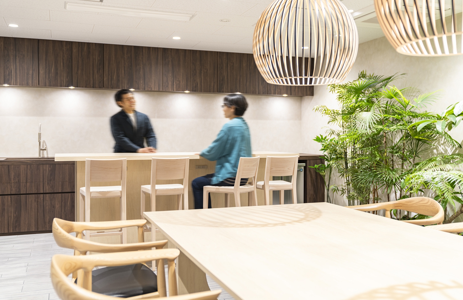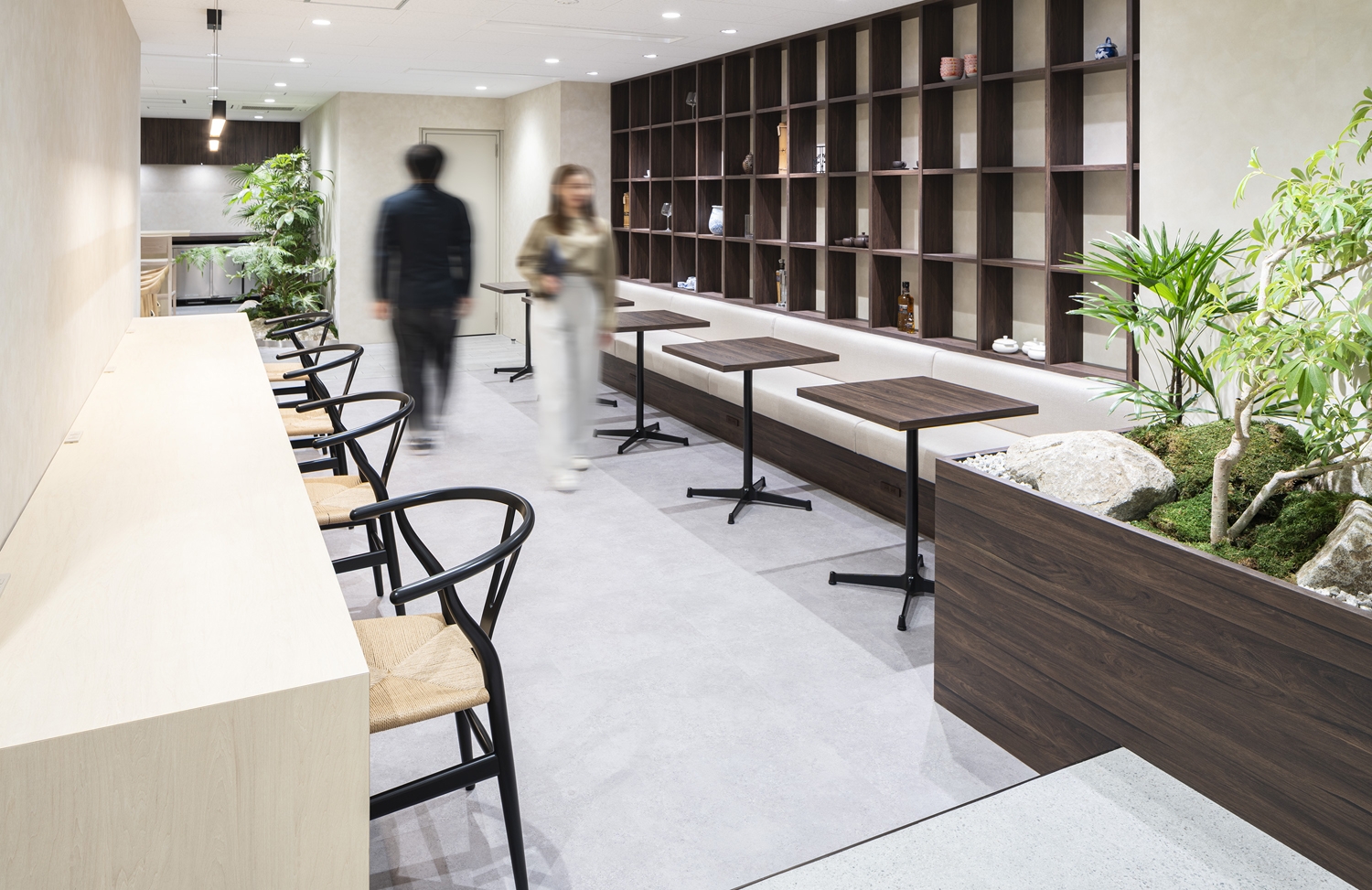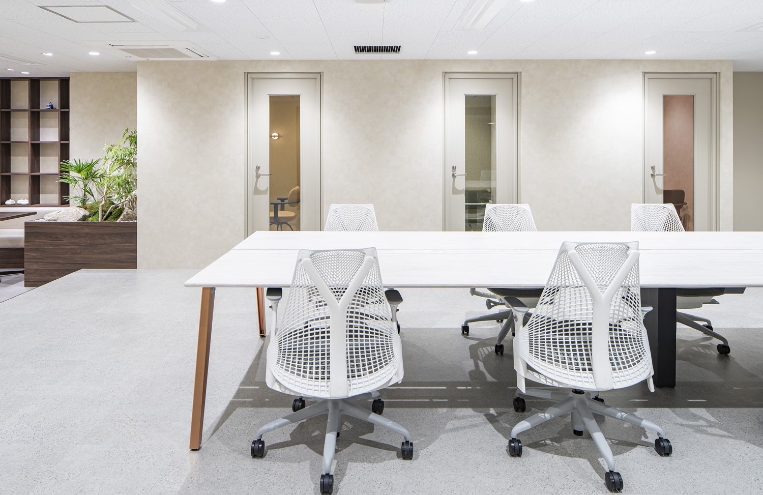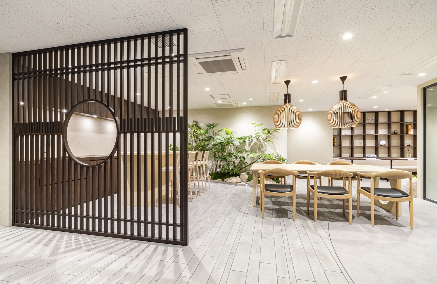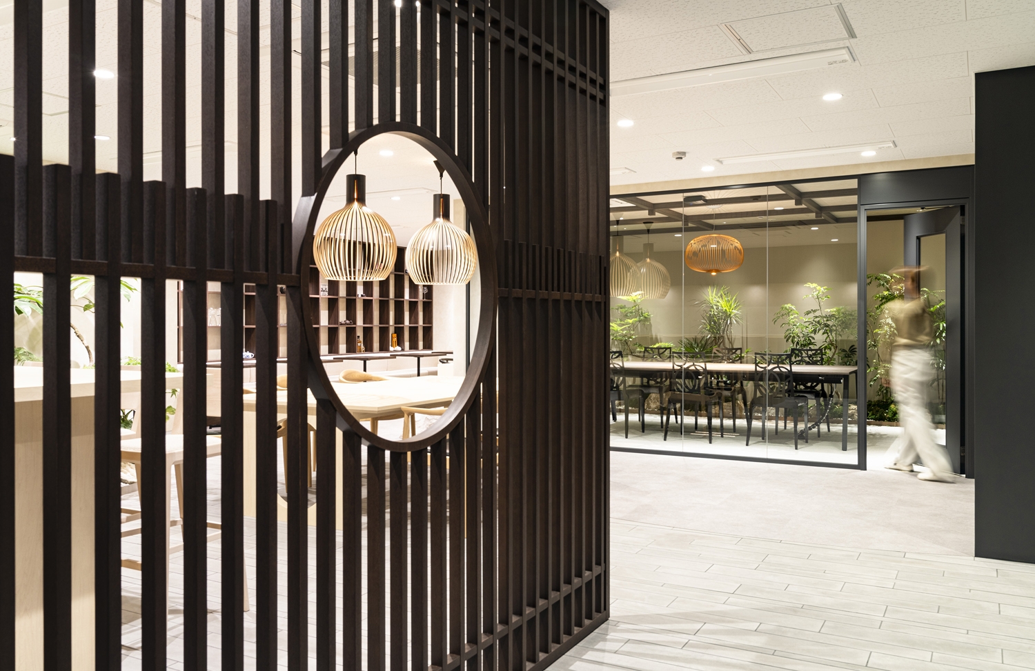 以前のオフィスのテーマ「和」テイストから拡大し、デザインテーマを「和中華」として設計しました。エントランスの壁面や造作テーブルには格子や円形をデザインに取り入れ、和中華を演出しています。4名用会議室は150cmの扉で、外からは部屋があるかわからない隠し部屋のようなデザインにしました。チェアは一つひとつ各エリアの雰囲気に合わせ、使い勝手のよいものを採用。キッチンスペースなどコミュニケーションが取れる空間と、WEBブースやカウンター席など集中して業務ができる空間をバランスよく取り入れています。