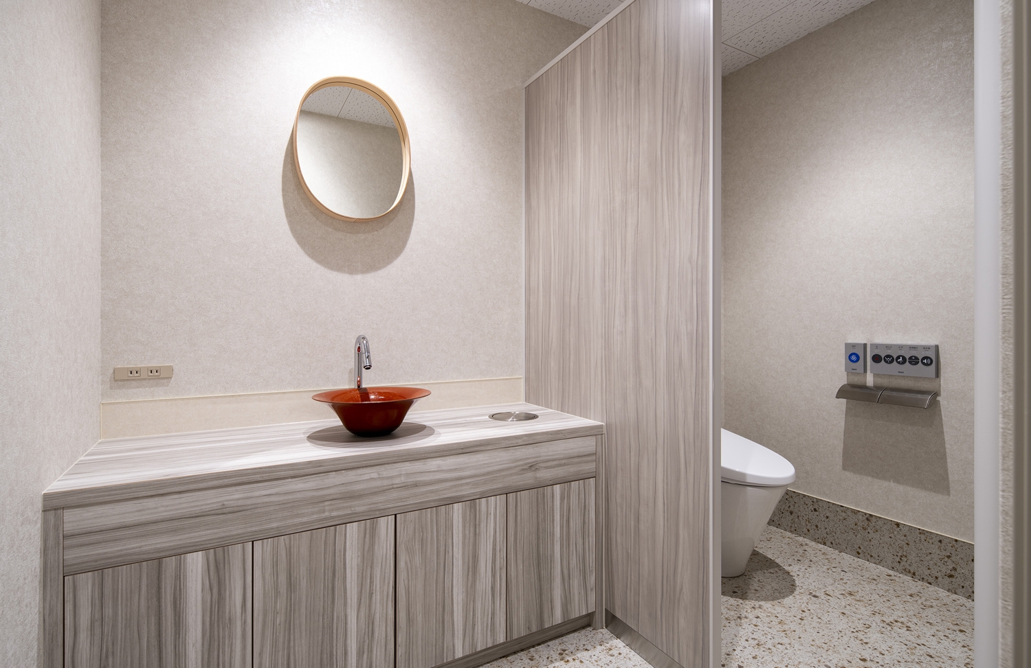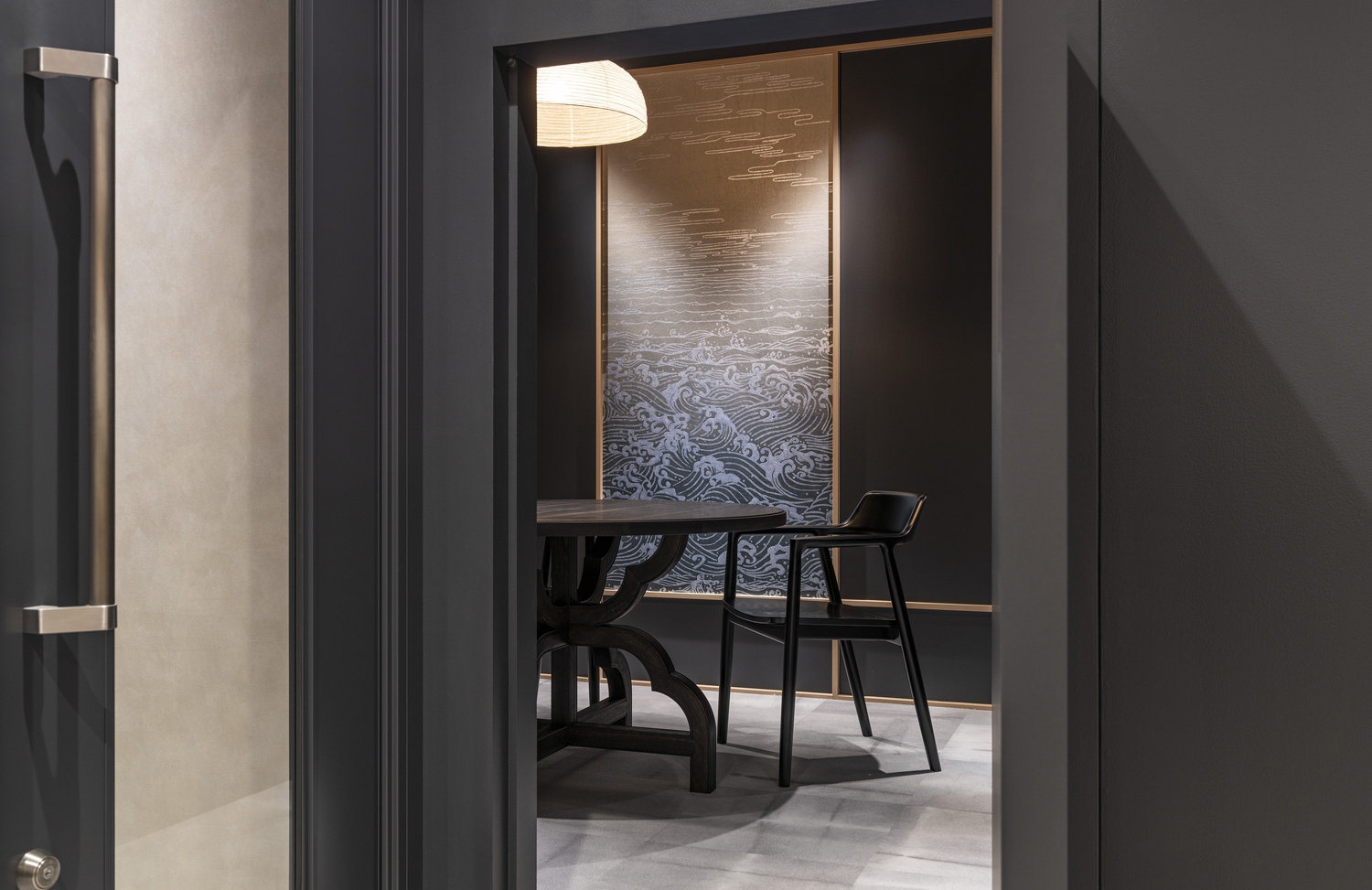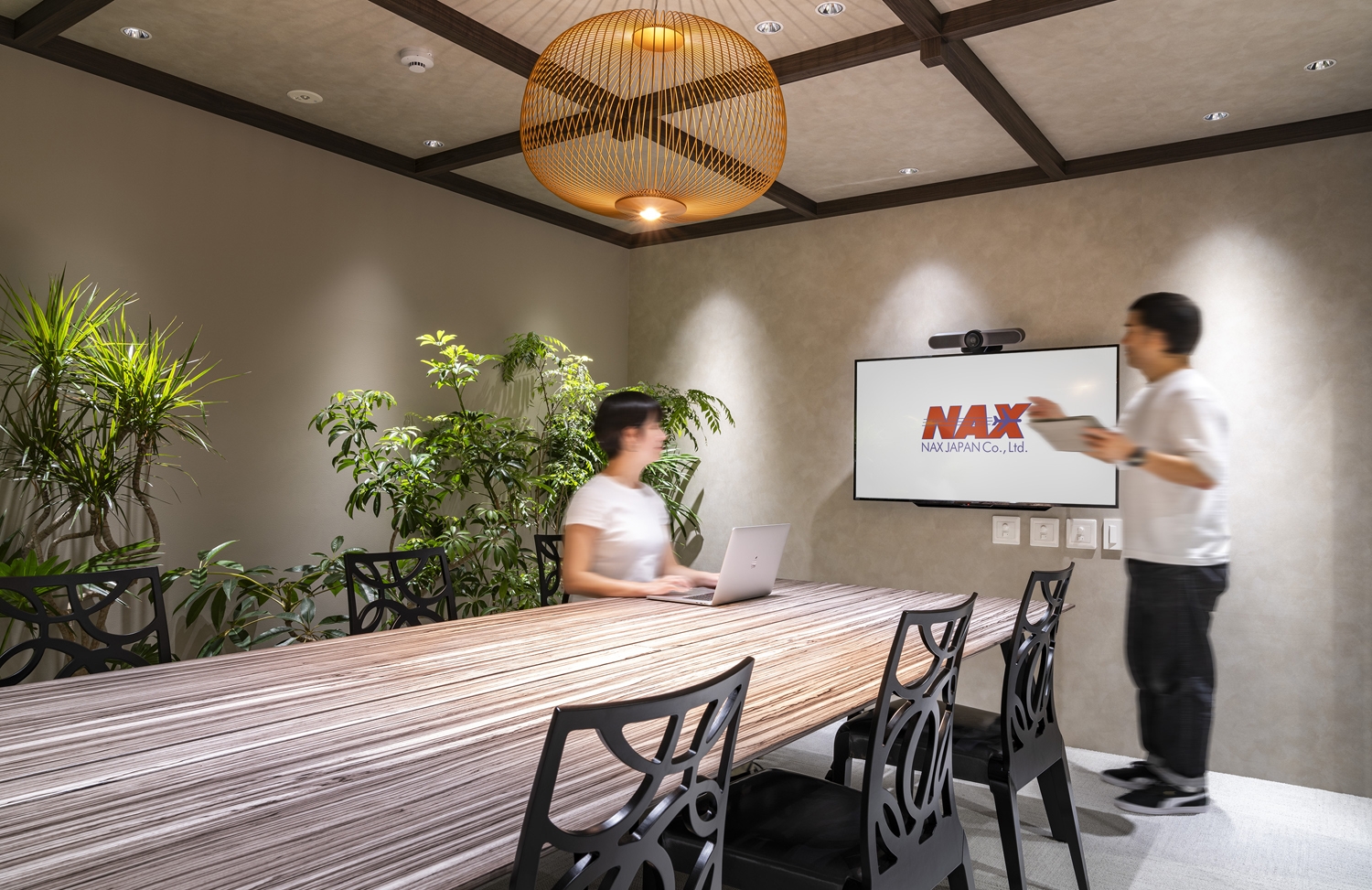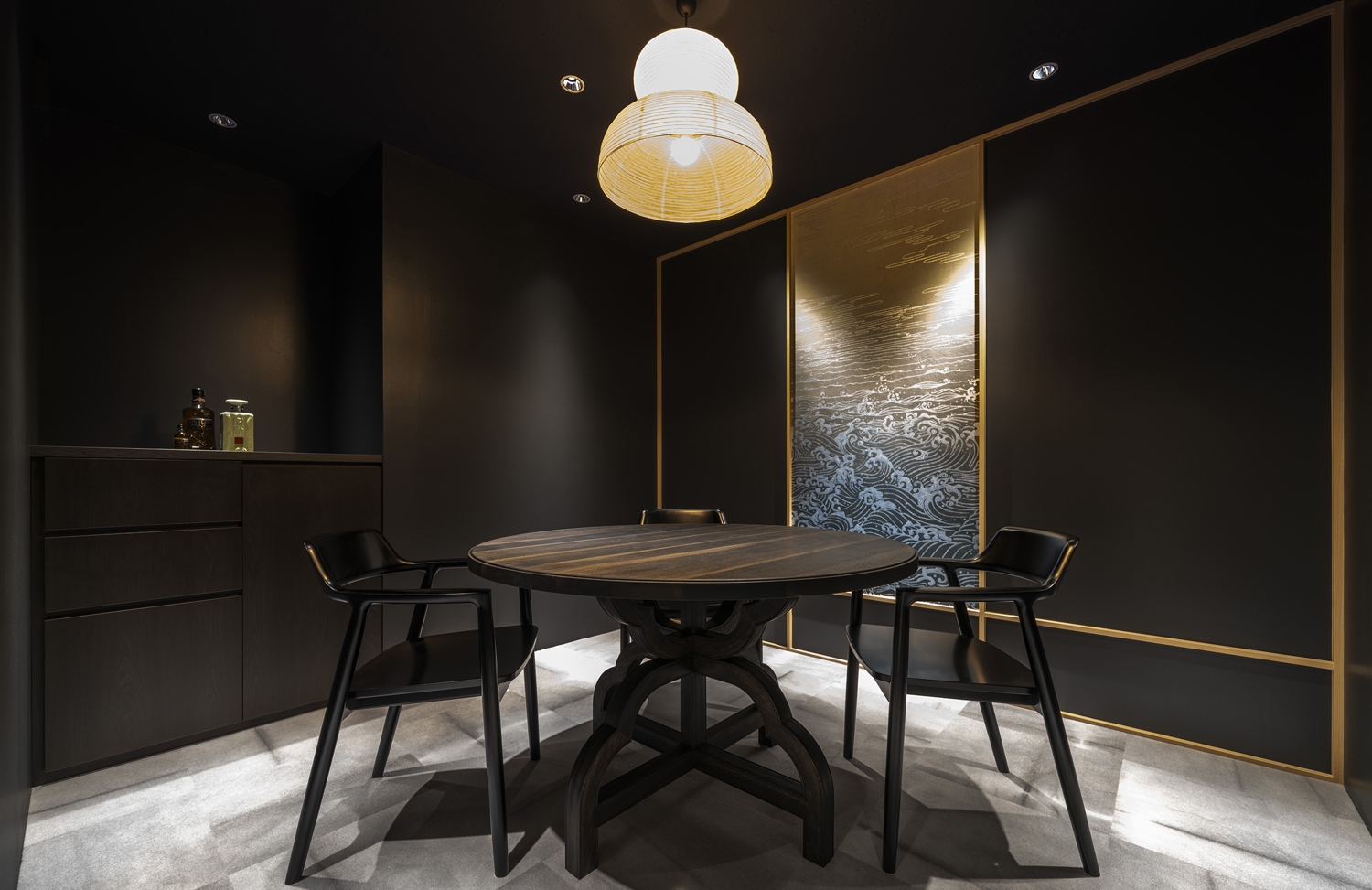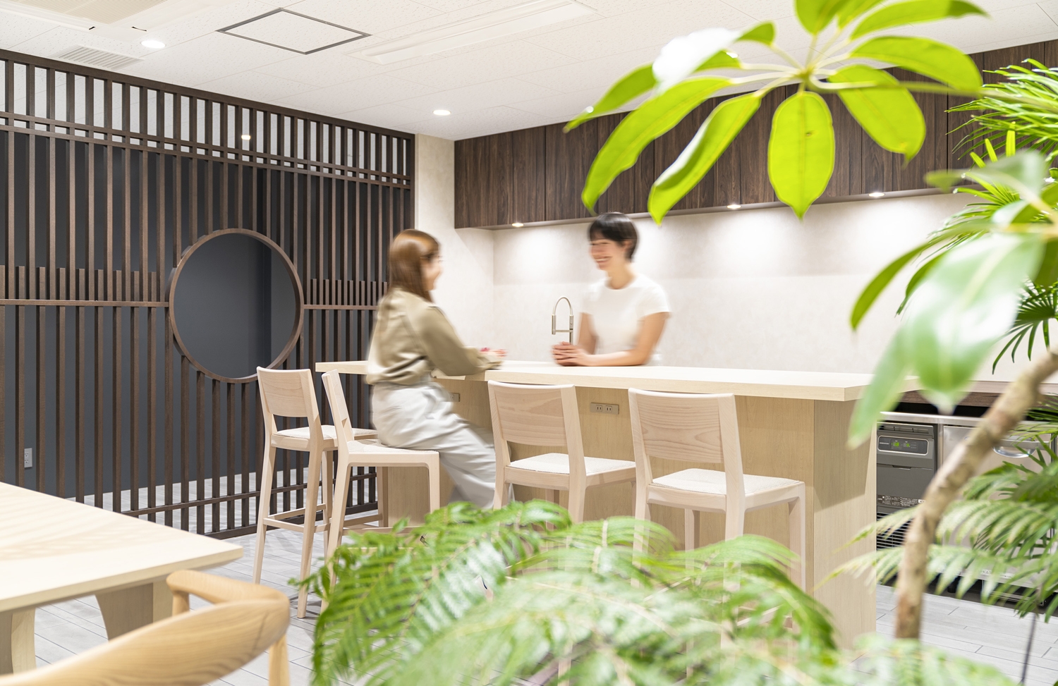 以前のオフィスのテーマ「和」テイストから拡大し、デザインテーマを「和中華」として設計しました。エントランスの壁面や造作テーブルには格子や円形をデザインに取り入れ、和中華を演出しています。4名用会議室は150cmの扉で、外からは部屋があるかわからない隠し部屋のようなデザインにしました。チェアは一つひとつ各エリアの雰囲気に合わせ、使い勝手のよいものを採用。キッチンスペースなどコミュニケーションが取れる空間と、WEBブースやカウンター席など集中して業務ができる空間をバランスよく取り入れています。