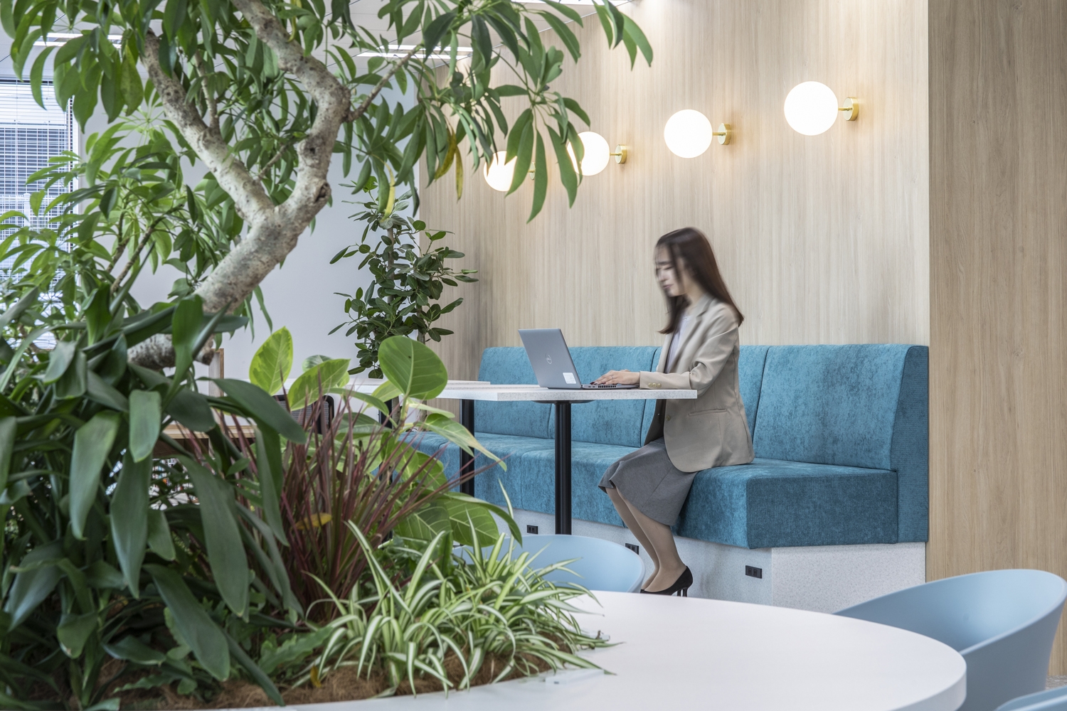 「エンジニアのためのワークプレイス」という観点でABWを基にオフィス全体を設計。一般社員も常駐先から帰社した社員も自分の居場所が見つけることができるよう、ソロワークを主体にカウンターテーブルやベンチソファなどを配置しました。社内外の打合せも多いため、会議室やブースも多く設置。採用・エンゲージメントの観点から、居心地の良さを感じられるようデザインはナチュラルな木目をベースに柔らかさや安心感を表現しています。物件の特性である開放的な窓からの採光をオフィス内に取り入れ、明るく清潔感があるように全体の色味をコーディネートしました。移転後は、社員の方も自分のお気に入りのスペースを見つけて、新しいはたらき方にチャレンジされています。