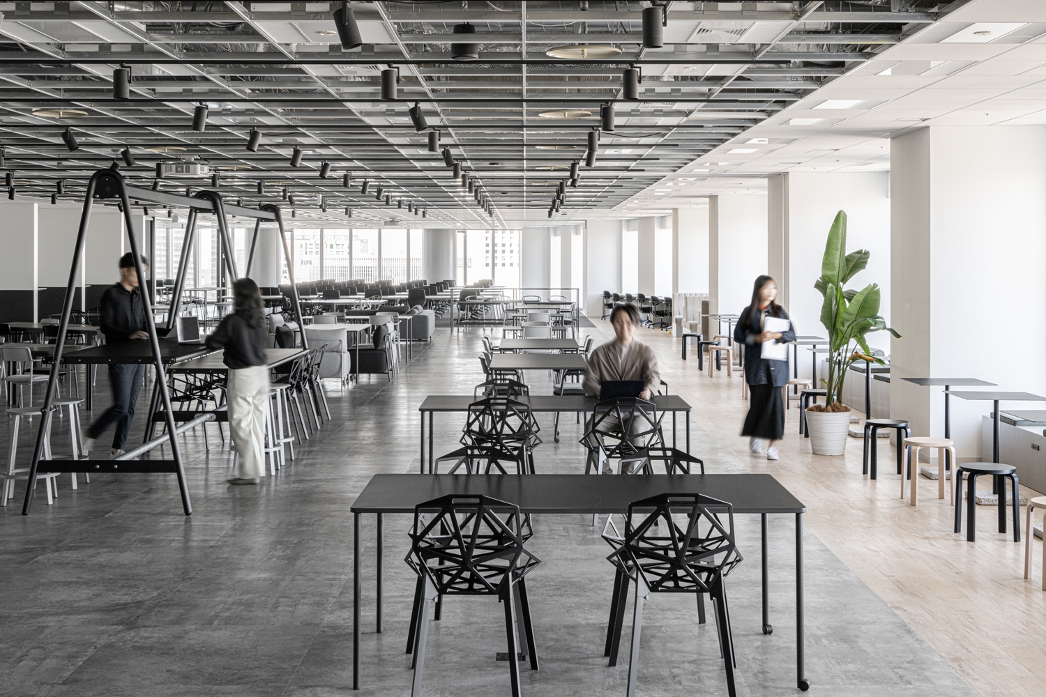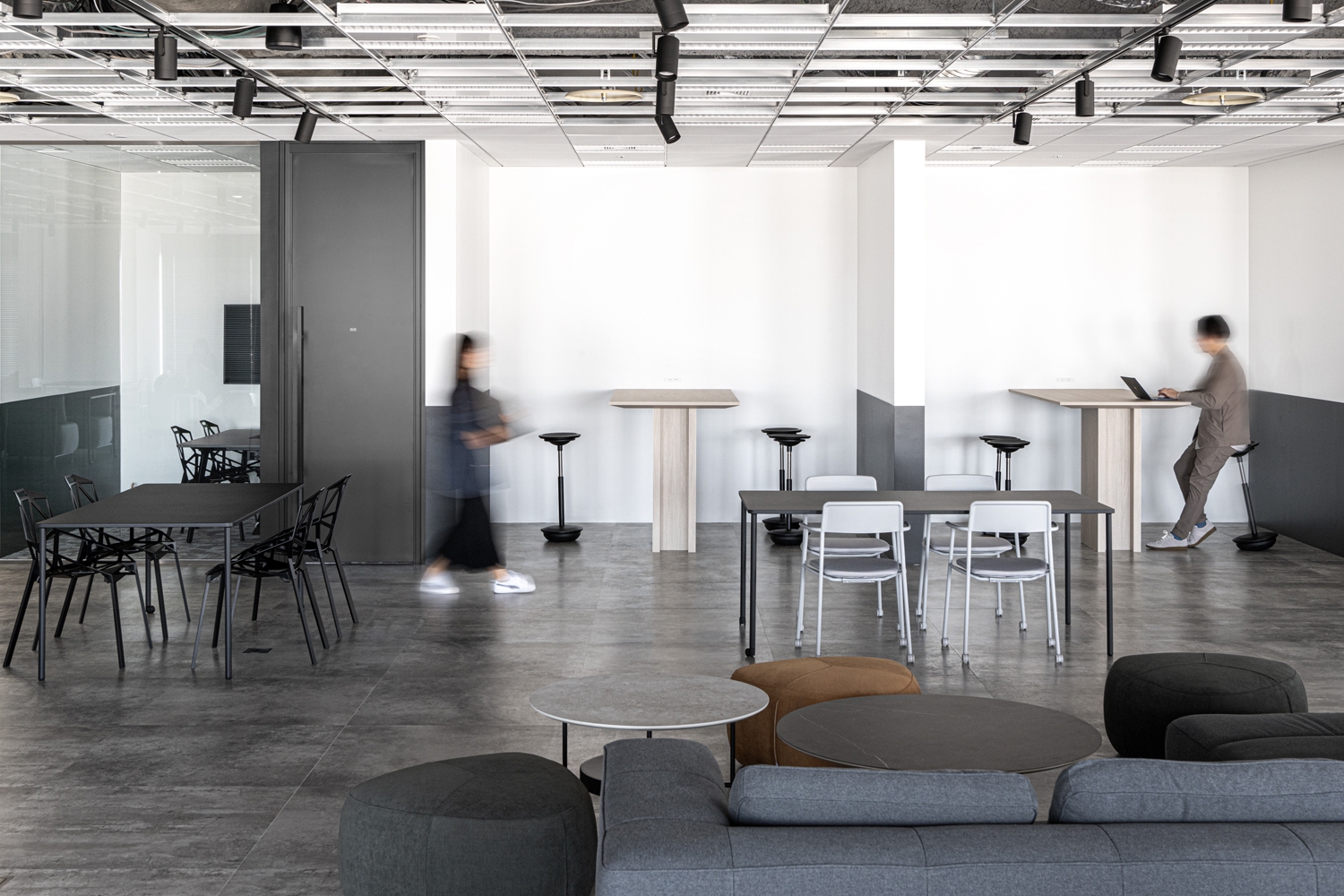 コンセプトを『TIMES ~人と人が交わる空間~』とし、コミュニケーションを通して人が交わる仕組みを取り入れました。ビルのコア側に会議室などの間仕切り壁が必要となるゾーンをまとめ、執務エリアを広い一体空間として構成しました。可動式の家具を執務エリア中心に配置することで、仕事や社内イベントなどシチュエーションに合わせてはたらきやすい空間へカスタマイズすることを可能にしています。白、黒、グレーなど無彩色の家具やマテリアルを中心に選定し、「足す」デザインではなく「引く」を意識したデザインとしました。シンプルでモードなテイストにまとめることで、多くの家具が並んでいてもクールかつ大人な雰囲気の空間になるように設計しています。