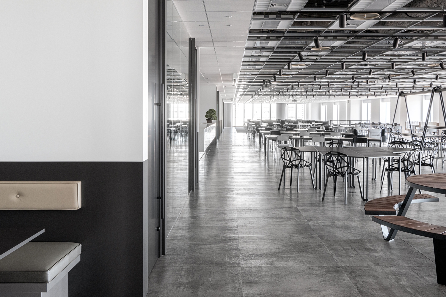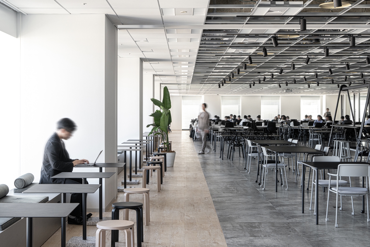 「引く」デザインにより、モノトーンで構成された執務フロア
