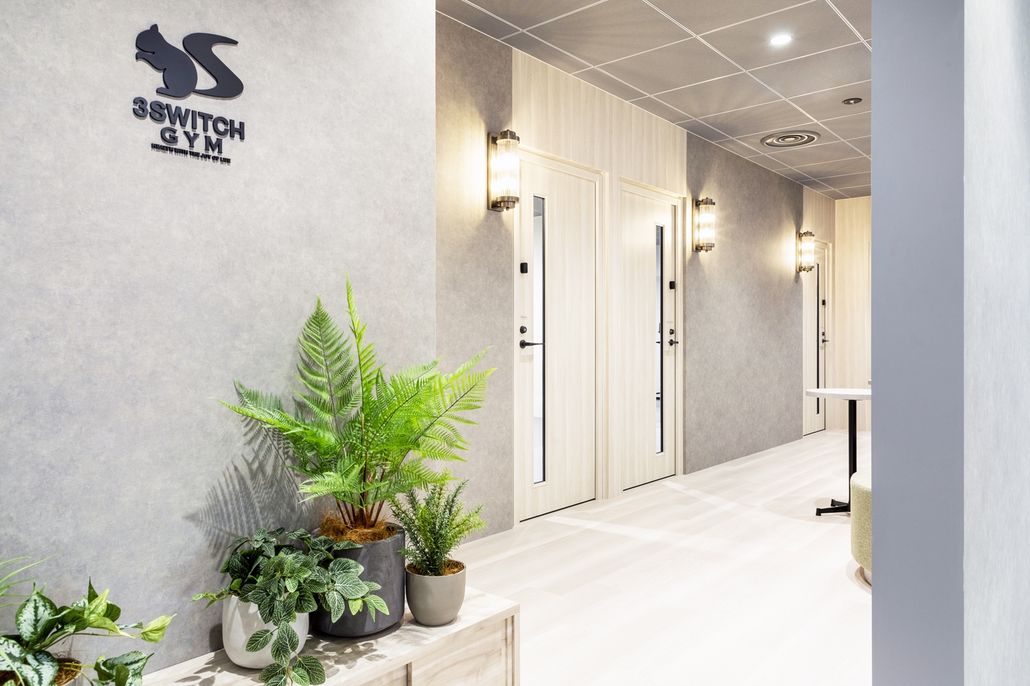 新事業であるジムサービスの発足に伴い、オフィス内にジムを併設しました。ジムエリアと執務エリアは、統一感を保ちながらも床の高さやデザインテイストを変えて異なる雰囲気を演出し、思考の切り替えがしやすい環境に。エントランスエリアでは、これから新しい事業に次々と取り組み挑戦していくという想いを直線的なデザインで表現しました。
