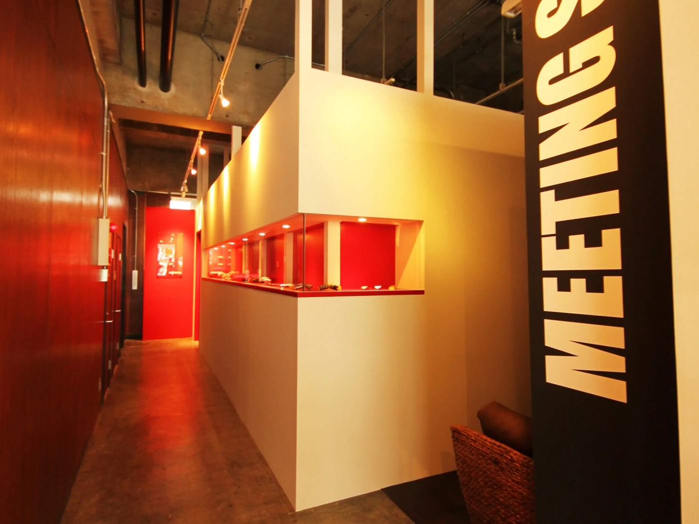 古き良きと新しさを融合した、斬新なオフィス。1階通路には商品が飾られ、コーポレートカラーの赤が素敵に演出しています。2階ワークスペースはまるでオフィスとは思えない、わくわくする空間となりました。外からのアプローチもまるでどこかの店舗のような印象を与えます。夜には照明がよく映え、とてもロマンチックです。