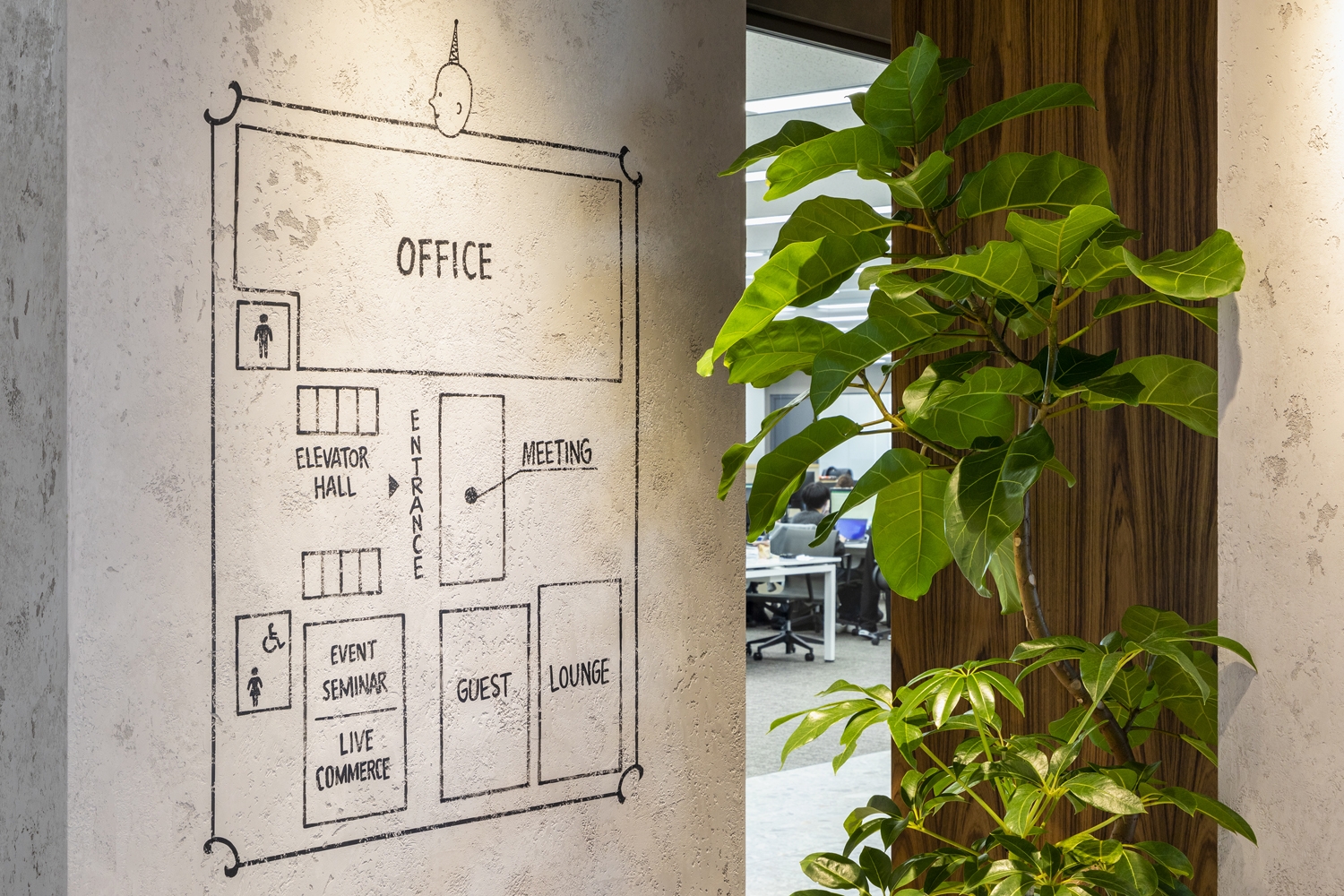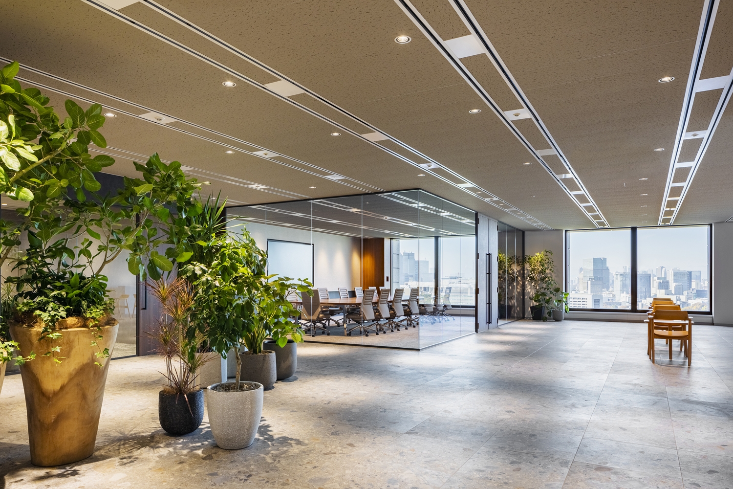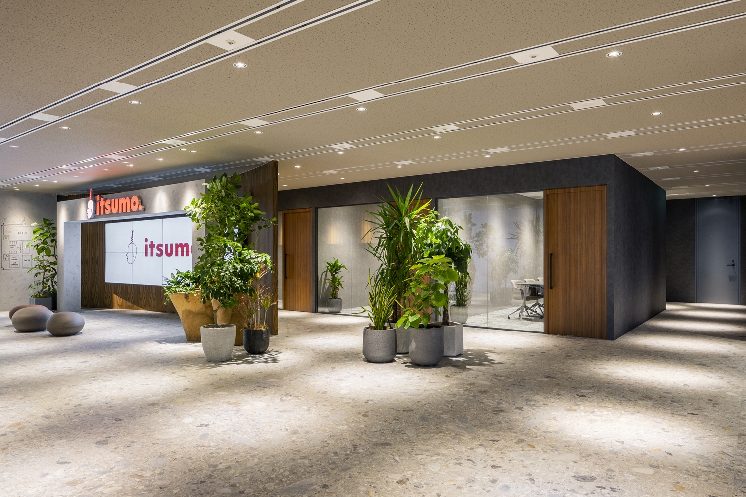 エントランスにロゴを大きくデザインした象徴的なゲートを計画し、来訪者にワクワク感とインパクトを与えられる演出をしています。セミナーやイベントの頻度が多いいつも様に見合うようなマルチパーパススペースも構築しました。エントランスのデザインの延長線上で計画し、一体感とブランディングを感じさせることができます。床材にはエリアに応じてタイルやパーケットを使用したり、アースカラーを中心としてファニチャープランを計画するなど、一つひとつのマテリアルやアイテムにもこだわりました。また、日比谷公園と皇居を一望できるビル特性を活かし、間仕切りは必要最低限にして奥への広がりと抜け感を演出できるようゾーニングを行いました。