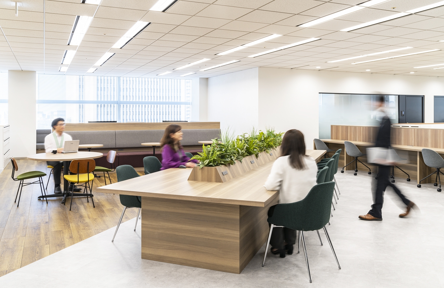 以前のオフィスの洗練され落ち着いた雰囲気は保ちつつ、都会的なデザインを取り入れた今回のオフィスは、来訪者に信頼感と安心感を与えます。レイアウトは、来客エリアと執務エリアを明確な導線で分けることで、社員が落ち着いて仕事ができる環境を構築。また、執務エリア中央にリフレッシュゾーンを設けることで、部門を超えたコミュニケーションを促進させています。