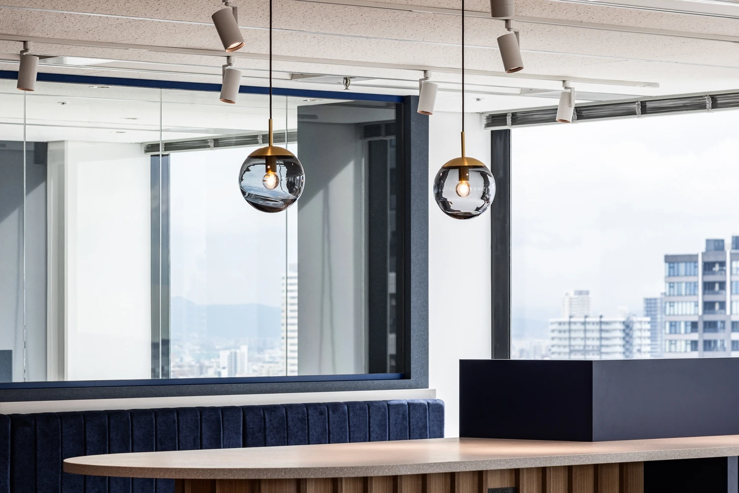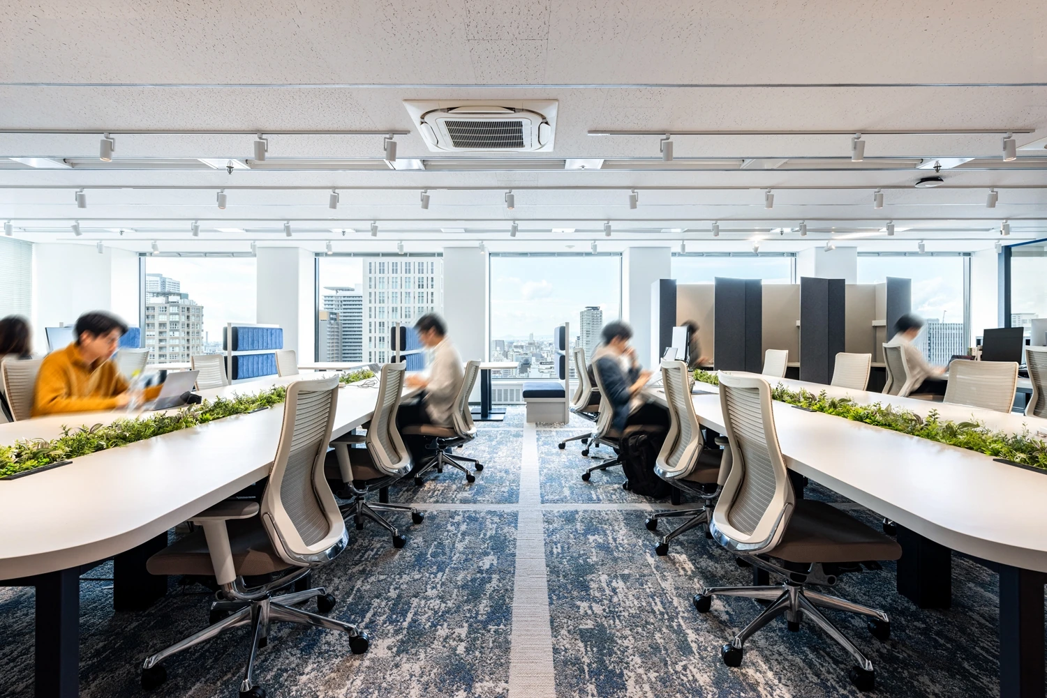 ワークスタイルは、社員が自らのはたらき方に合わせて場所を選べるABWを実現しました。オンラインブース、集中スペース、ファミレスブースの設置により、個々の作業に最適な環境を提供することができるようになっています。また、オンとオフの切り替えが可能なリフレッシュスペースの設置により、社員の皆さまがリラックスして次の業務に取り組むことができるよう配慮しました。デザイン面では、前回のオフィスデザインを踏襲しつつも、真鍮をアクセントに使用することで、より上質な空間を創出しています。同ビル内の9階から23階への移転に伴い、窓面にブースを設置し、眺望を活かしたレイアウトを採用しました。家具にはホワイトとコーポレートカラーを取り入れ、オフィス全体に統一感のあるデザインを実現しました。