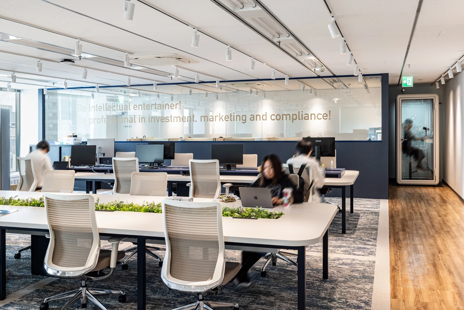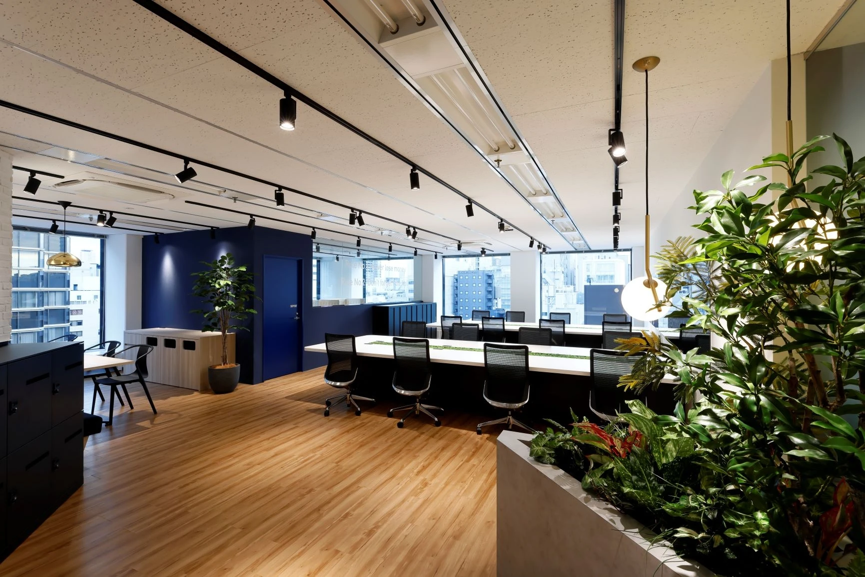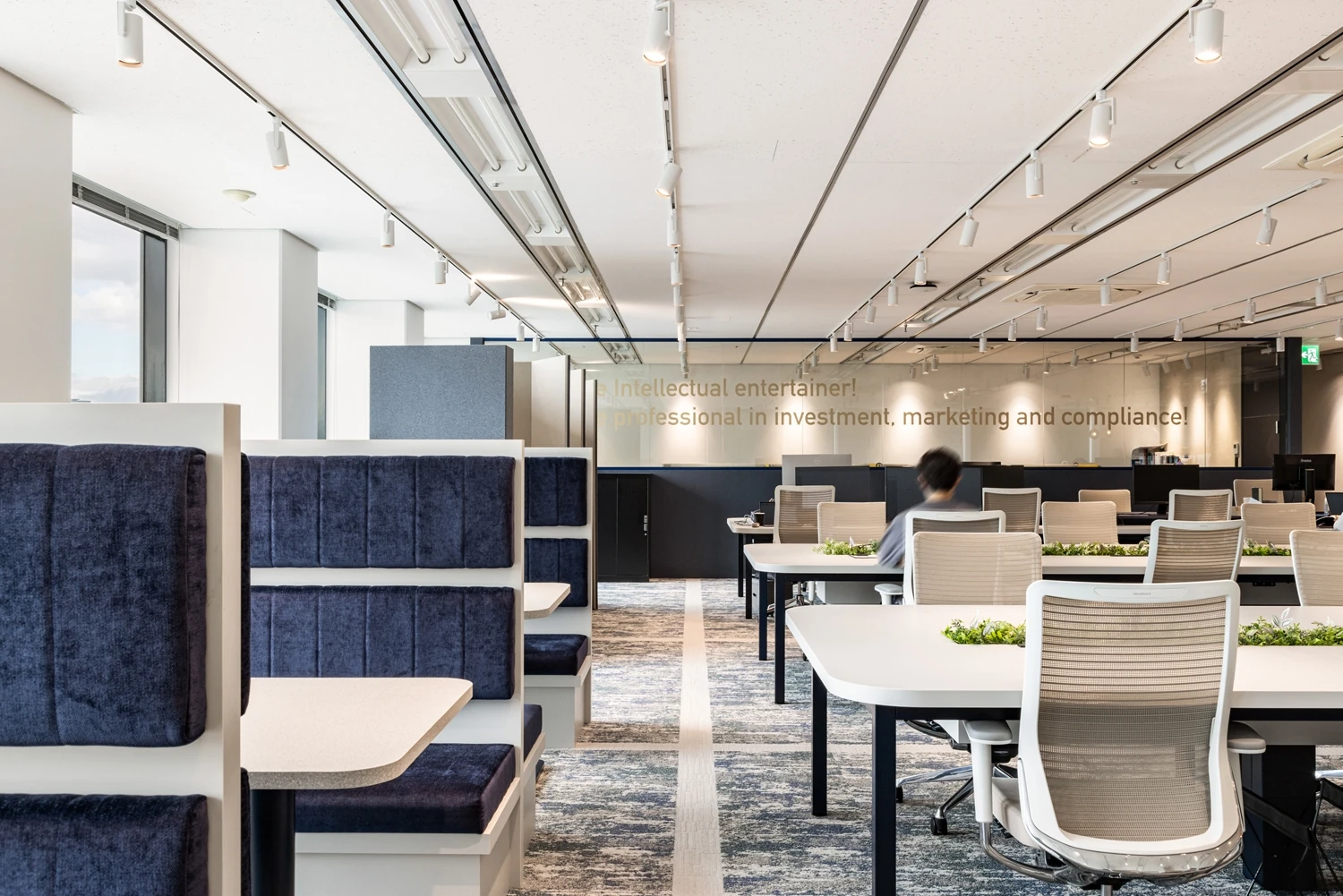 社員の皆さまが、フラットな社風の中で快適かつ効率的にはたらける環境の構築を目的としたプロジェクト。 カスタマーサポートの人員増強と会議室の不足解消を通じて、一人ひとりがその能力を最大限に発揮できるような空間を創出し、インベストメントカレッジ様のさらなる成長を支えることを目指しています。 前回のオフィスデザインを踏襲しつつも、より上質で洗練された空間を実現することで、はたらきやすさと企業のブランドイメージの向上を図りました。