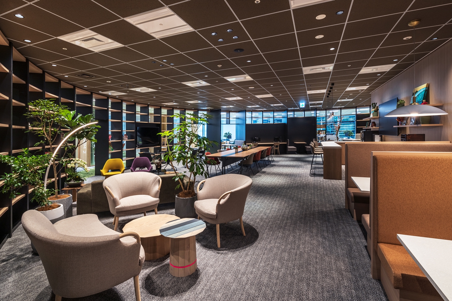 デザインコンセプトは『KIWAMI TERRACE』。区画全体をテラスに見立て、中心に本棚で囲われたライブラリーを設けました。カフェ空間のようなライブラリーは、社内外の人々とのコミュニケーションの場としてさまざまなアクティビティが行われる空間としています。ライブラリーを囲うように、自然の中にある明るいテラスをイメージした執務エリアや来客エリアを配置しました。本棚は視線が抜ける構造にすることで、2つの空間を緩やかに繋ぎ、スムーズな人の流れを生み出しながら、クリエイティブな発想を生む装置として、ディスプレイ・ミーティングスペース・ワークスペースの機能を内包しています。