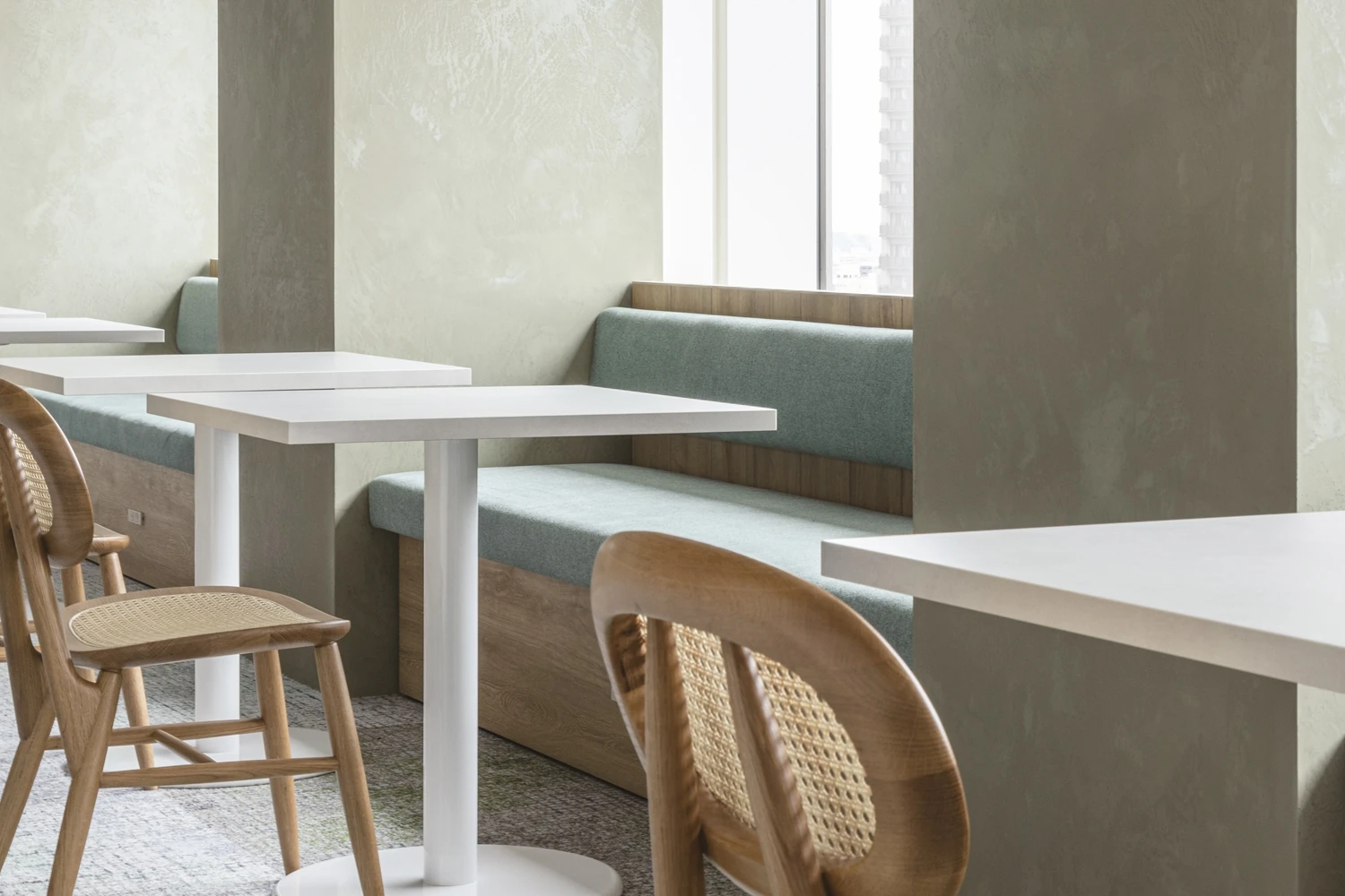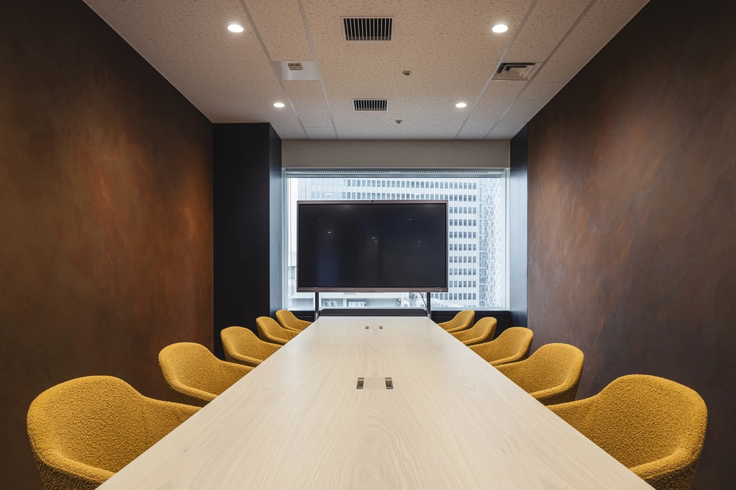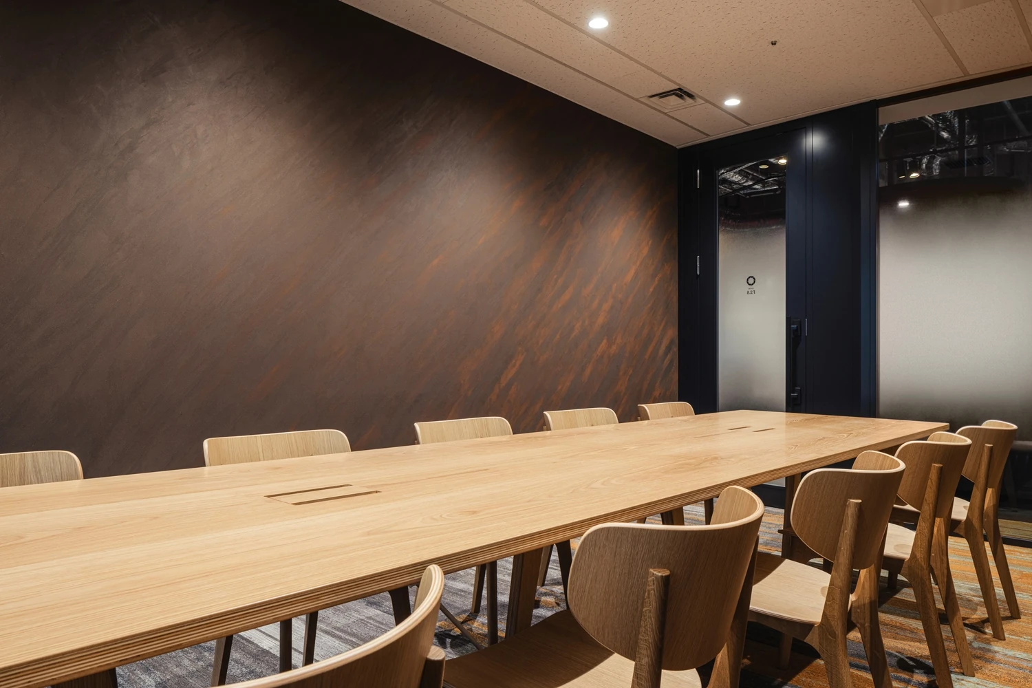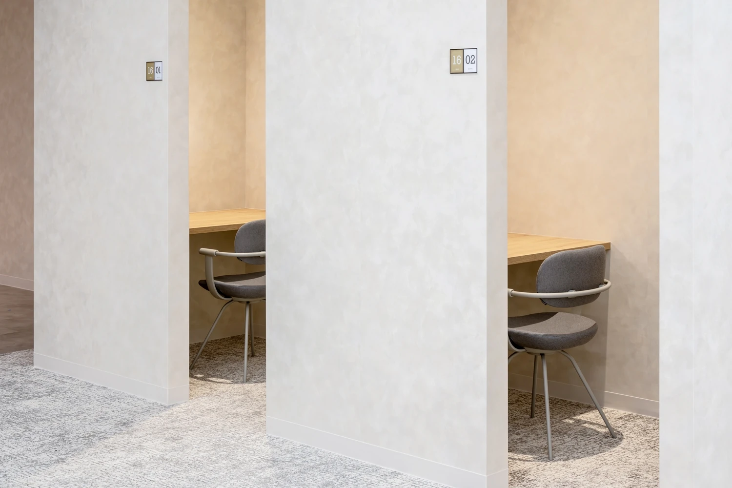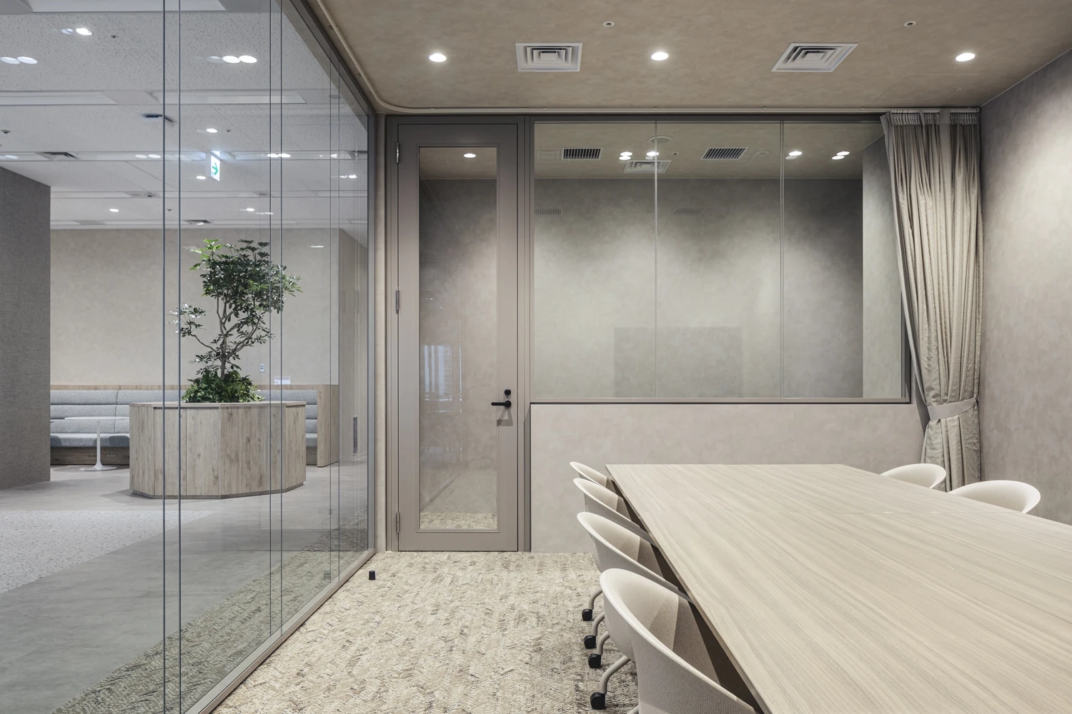 13階から16階にまたがる複数フロアのオフィス移転プロジェクト。シャッターで切り取るいくつもの物語が交差する様子を季節のうつろいに乗せて表現。 アイズの特殊塗装や海外メーカーの床材を採用し、それぞれ表情のある春夏秋冬を各フロアで演出しています。 メインエントランスと会議室エリアのある15階は、フィルムカメラのスプールから着想を得たデザインを随所に散りばめました。エントランスでは、スプールに見立てた柱にLEDビジョンを設置し、映像を通してキタムラグループのブランドを表現。また、実際に販売されていたライカなどのフィルムカメラを展示し、ノスタルジーと先進性、アナログとデジタルを融合させました。エントランス会議室では、スプールに巻かれたフィルムを現像し1コマずつ映し出す様子を演出しました。 グループ会社毎にフロアを割り当てられた執務エリアは、通常業務として座るタスクチェアポイントと予約不要で自由に座れるタッチポイントの数を算出し、必要な人数構成が可視化できるようにしました。