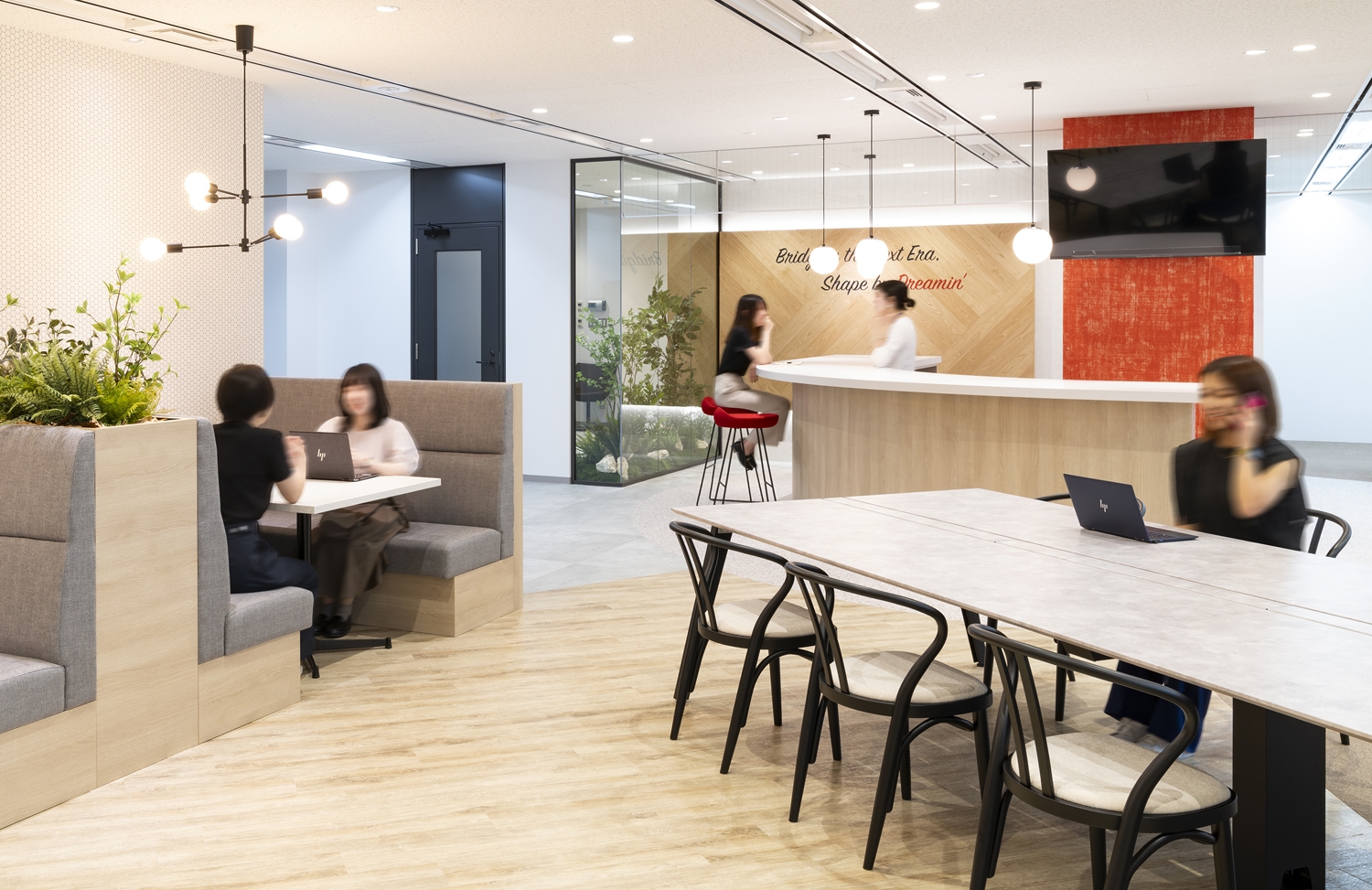 企業規模の拡大に伴い、従来のオフィスが手狭になったことによる拡大移転プロジェクト。以前は離れた場所にあった研修スぺ―スも移転を機に集約するなど、社員の働きやすい環境を整え、新卒採用にもポジティブな変化を与えることを目的に、ワクワクするオフィスを目指しました。