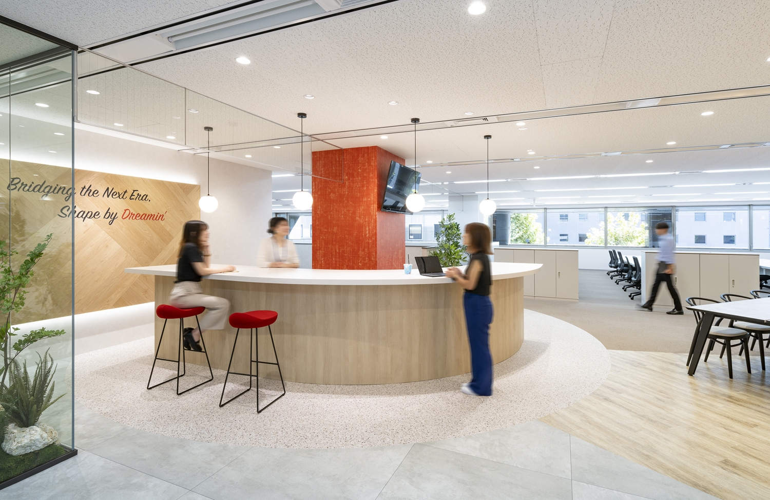 ワークプレイスのコンセプトは『Hang outータマリバー』。新たなコミュニケーションが自然に生まれ、今までにないイノベーションを起こすことができる場所として「タマリバ」。これを、仲間でふらっとでかけるという意味を持つスラング「Hang out」で表現し、若い世代に受け入れられるカジュアルさをデザインにもプラスしました。エントランスの交差する木目壁やパントリーを中心に 貼り分けたデザイン、活気のある若者たちが人や企業と積極的に交わっていく様子を表現しています。 執務エリアは固定席運用を採用し、リフレッシュスペースも設け、集中とコミュニケーションのメリハリをつけることができるようレイアウトしています。