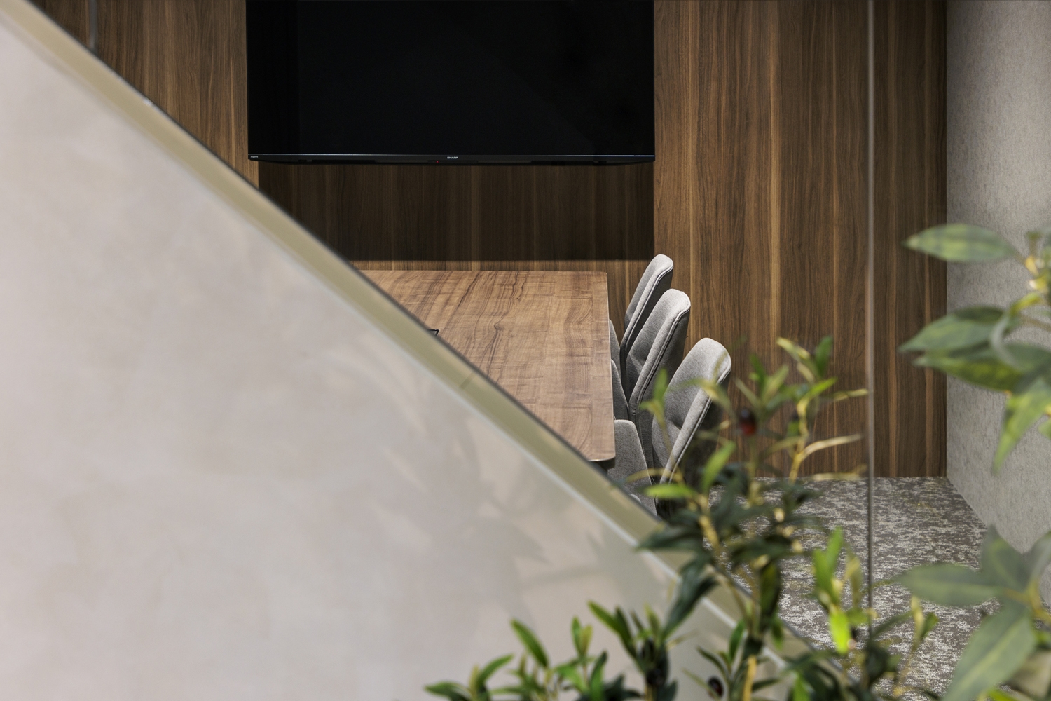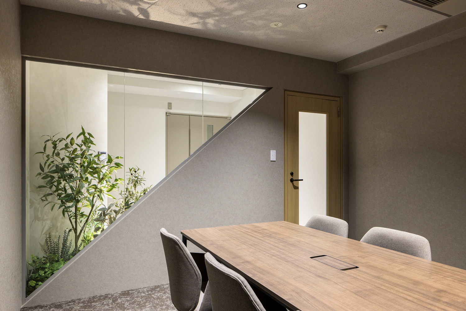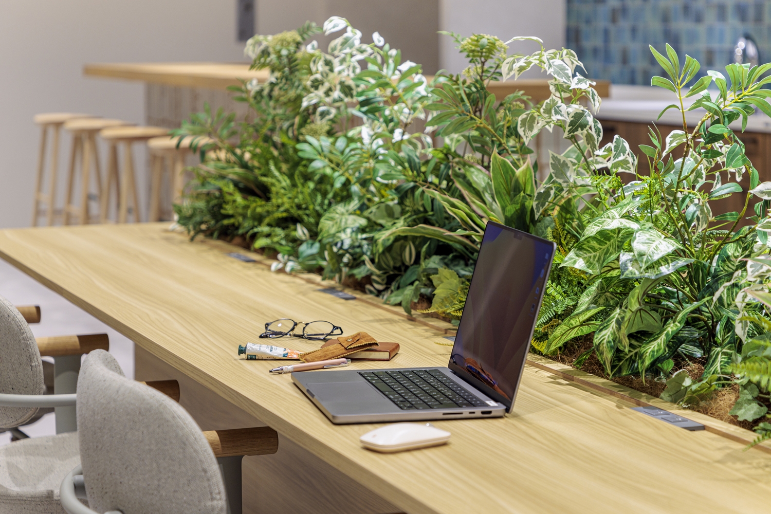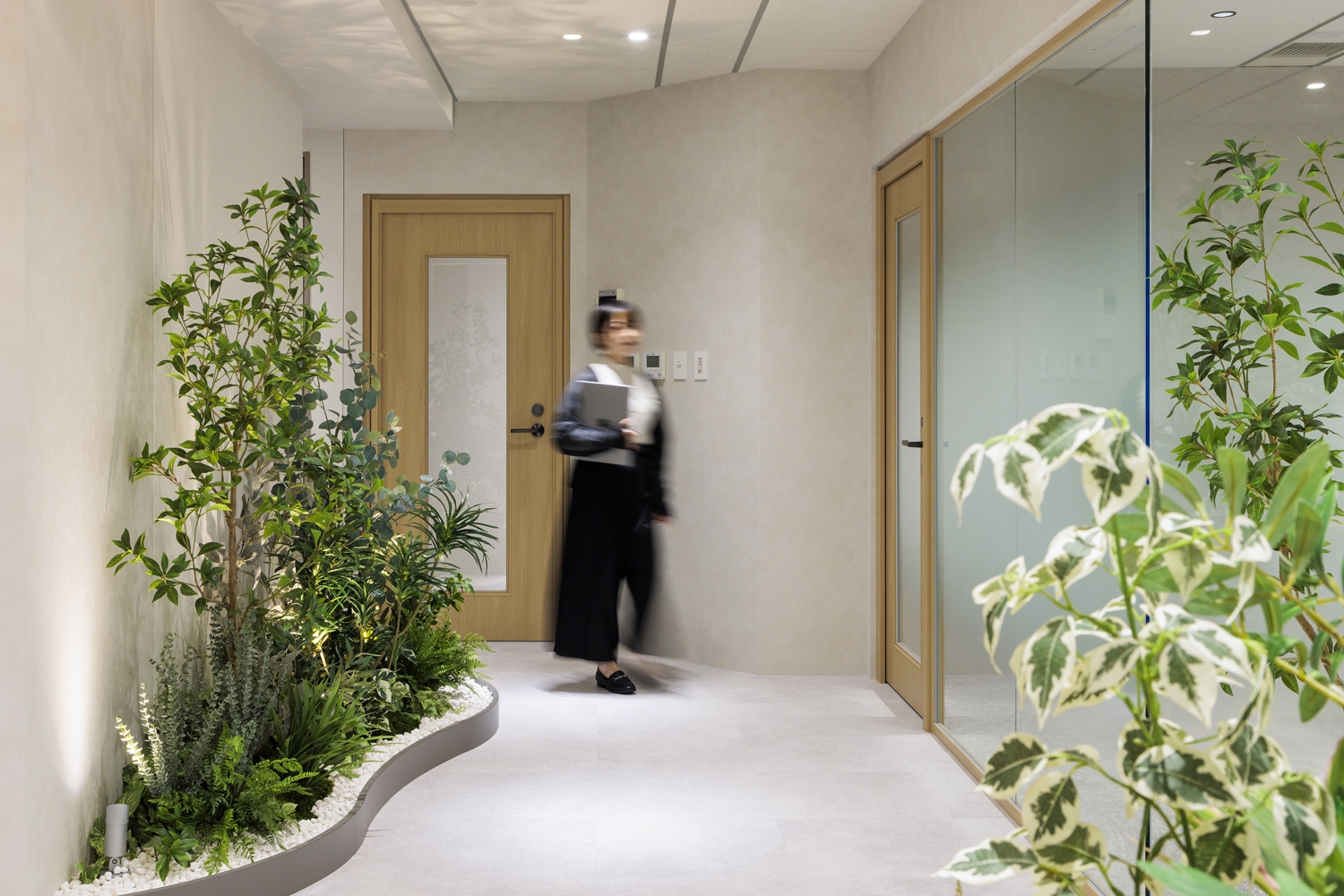 今回は、新築ビルではなく既存ビルへのセットアップオフィスの構築だったため、ビルバリューアップという側面を最大限考慮し設計。パントリーやトイレなど、入居を検討する上で重要なポイントとなる設備関係も意匠的で使いやすい仕様にリニューアルしました。 デザインは、多くの人が心地よいと感じる明るく柔らかい ナチュラルテイストにまとめました。カウンターの腰壁や、キッチンの裏などにアクセントでタイルを採用する事で、受け入れやすくも飽きのこない、特色ある空間に仕上げています。また、植栽計画はさまざまな箇所に異なる大きさのプランターを配置し、どこに目線を向けても視界に植物が入り、爽やかな気分を演出しています。