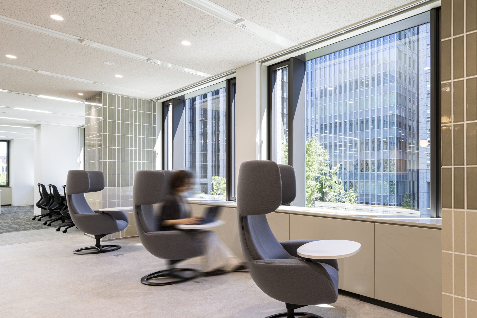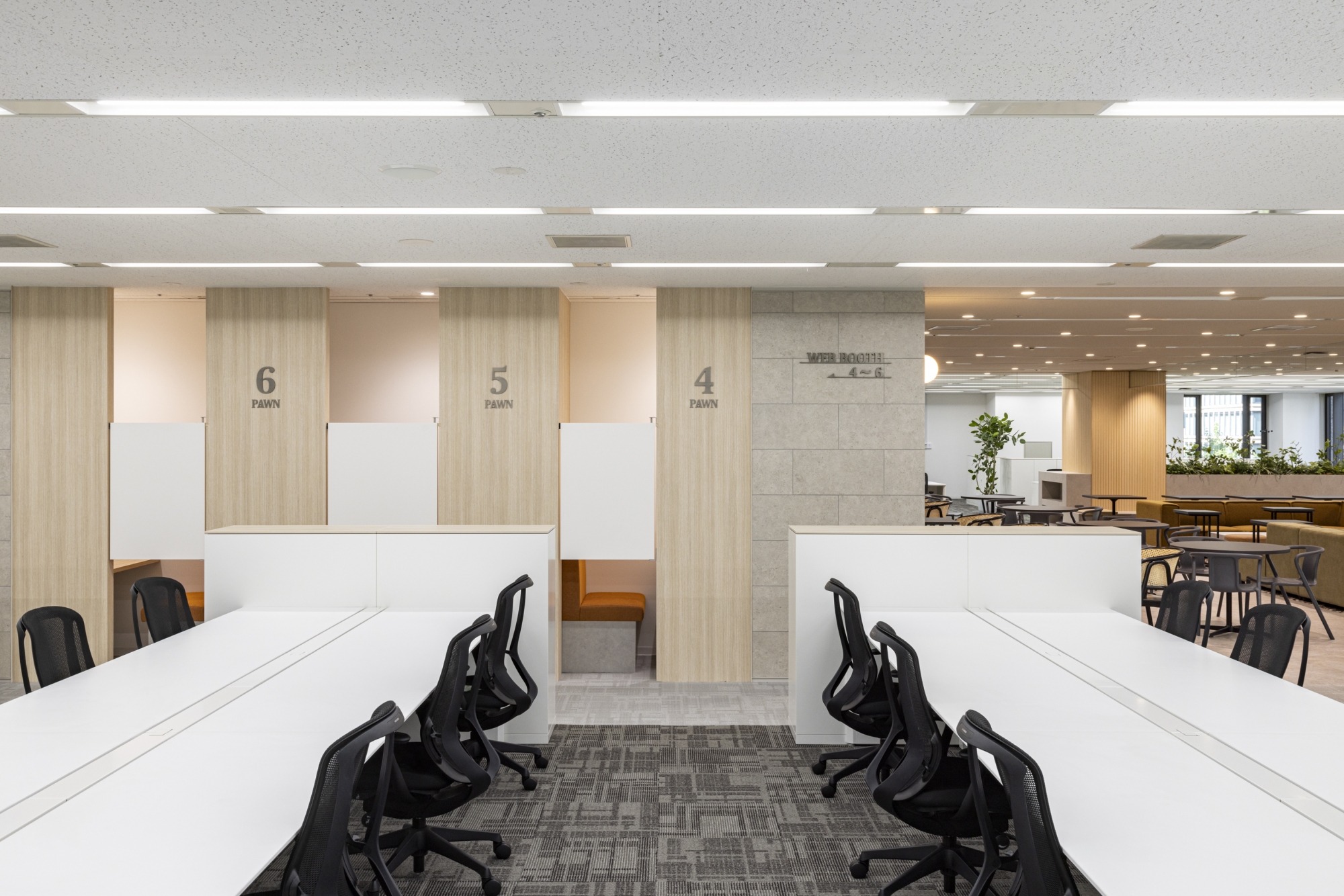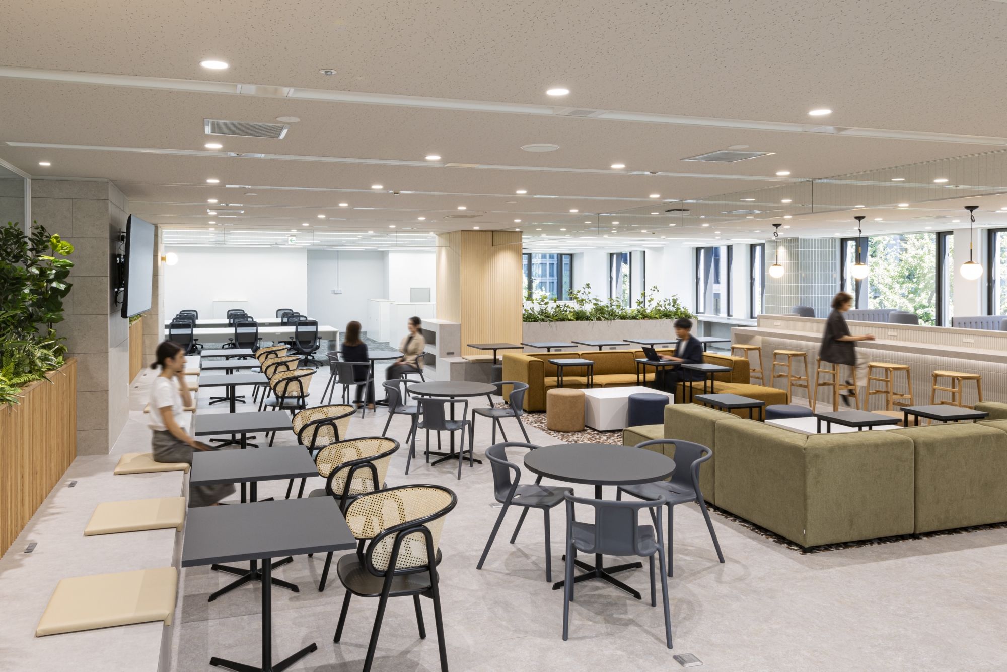 グループ企業である2社が事業継続計画対策の観点からオフィス移転を計画。元々は別の場所に本社を構えていた2つの会社の社員が、同じ場所で働くことができるような、さらには相乗効果を生みだしていけるようなオフィスが求められました。2社ともチームで取り組む仕事が多いため、組織で最大限のパフォーマンスが発揮することができ、一体感を醸成できるような空間を設計。また、交流を促すためにも出社したくなるような居住性と生産性が両立するオフィスを目指しました。