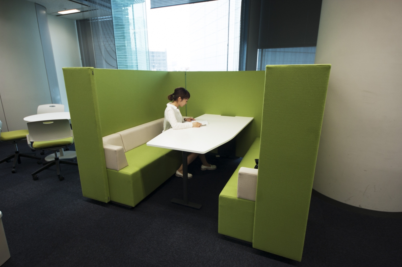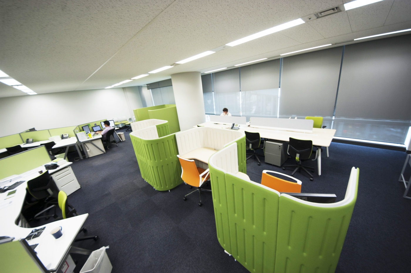 増床エリアへの新規設計デザインと既存部分の改修を担当させていただきました。 既存フロアでは、コストを抑えつつコーポレートカラーを大胆にデザインすることで、シックだったエントランスが明るく爽やかに生まれ変わりました。コーポレートイメージのリングを、グラフィックシートで大きくエントランスに入れることで、企業イメージがより伝わりやすくなっています。ワークスペースは、今後フリーアドレスを取り入れられるとのことで、一人で集中できるスペースや吸音性のあるブース型のミーティングスペースを入れるなど、新しい働き方の提案もさせていただきました。