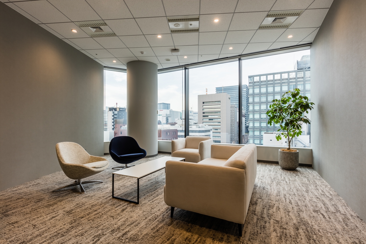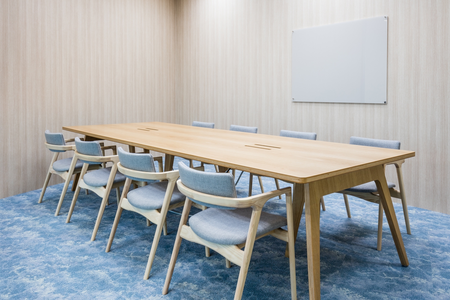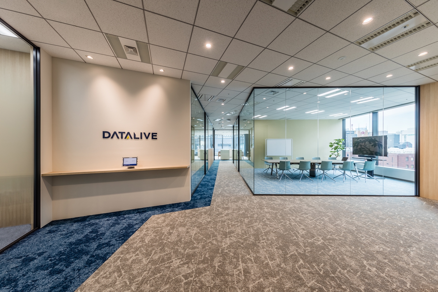 新しいオフィスではブランディングの強化・カルチャーの醸成・暗黙知の共有という3つのキーワードをもとにそれぞれの目的が相互に作用し、掛け合わさって最大の効果を得る事を目指しオフィスを構築しました。コンセプトは『LIVE【×】』。【×】は乗(じょう)を表し、データライブ様の”LIVE”が持つ「生き生きとした」「日々の生活」「躍動感」といった要素を、新しいオフィスに掛け合わせることで指数関数的に好影響をもたらし「Work×LIFE integration」を体現することを目指しました。来客エリアは通路をあえて細長くとり、会議室との境界壁にガラスを採用する事で開放感と奥行きを感じられるように工夫。執務室はメインのワークデスク群の周りに回遊動線をしっかりと確保し、その周りにオープンミーティング席を配置する事で、個人ワークと社内のコミュニケーションの切り替えを効率的に行うことのできるレイアウトにしました。コーポレートカラーが引き立つよう、マテリアルは極力色の数を抑え、ポイントで木目柄を採用することで親しみやすさや安心感を与えられるようにデザインしています。