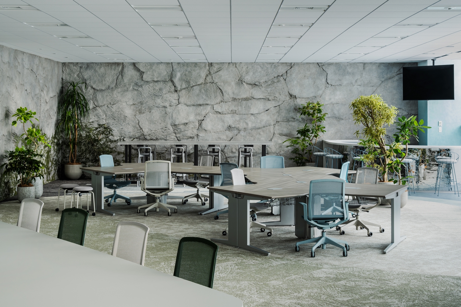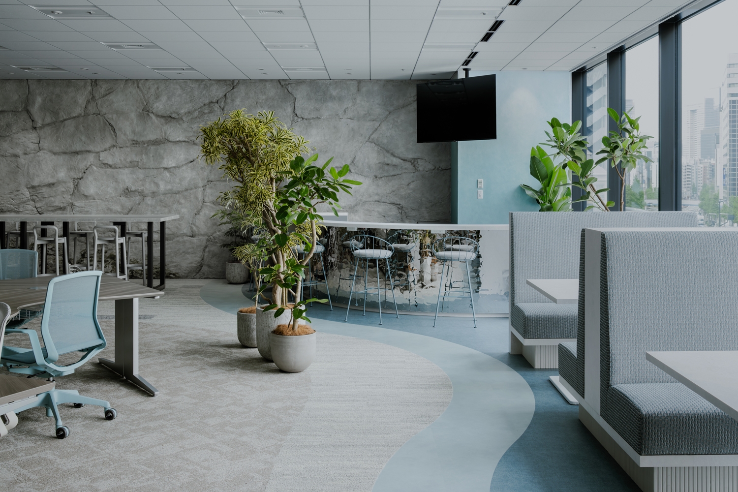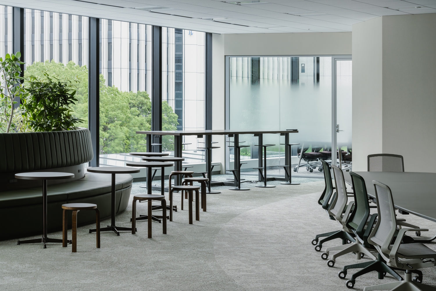 オフィスコンセプトは『巡り、愛でる』。仕事をする時間も仲間とまるでハイキングをしているように、生き生きと健康的に働きながら移り変わる景色や自然に心をはせ、日々新たな発見ができるような「心の豊かさ」を大切にできるオフィスを目指しました。バリエーション豊かな座席を設けることで、その日・その人にあった働き方を選択できるように工夫しています。会議室を利用するまでもない打ち合せ用に、ハイテーブルを執務室内に2ヵ所設置。1日の中でも気分転換になるようなウェルビーイングな働き方ができるようにレイアウトしています。コンセプトワードとしても挙げた「巡る」ことができるオフィスになるよう、メイン動線をあえて曲線的にすることで有機的なオフィスを設計。また、エリアごとに「マウンテン」「オアシス」「ジャングル」などのテーマを決め、そこに合わせた色味や素材・家具を選定することにより、オフィスの中にさまざまな自然との調和を楽しむことができる空間を構築しました。