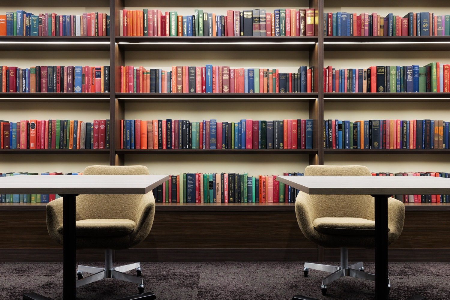 3つのスタジオを配置することで防音性能が高めつつ、それぞれ印象の違うデザインを施すことでさまざまな用途での撮影に対応できるようにしました。ダイレクト出版様らしさを視聴者に伝えることを目的として設定したコンセプト『DIRECT STUDIO』を空間で表現するため、最も大きいスタジオの壁面には、ダイレクト出版様の出版している本を並べ「ダイレクト出版様らしさ」を演出。撮影中はモニタニングルームから撮影風景が見えるようにガラスを使用したり、出演者が撮影以外の時間に活用できる控室も用意しました。また、照明や通信環境、AV機器なども一から提案し、唯一無二のスタジオをつくりあげています。5階には、ポップな配色の会議室空間をポスターのように見立て、大胆なタイポグラフィで構成されたグラフィックを配置。壁面には著名人の英語による名言を大きくレイアウトし、アイキャッチとしての役割を持たせながら、リズミカルで躍動感のあるデザインに仕上げました。6階ではスタジオ感を演出する発光サインを設置。さらに5階と同様に、壁一面に英語の名言を大胆に配置することで、視覚的なインパクトと遊び心を兼ね備えた空間演出を行っています。