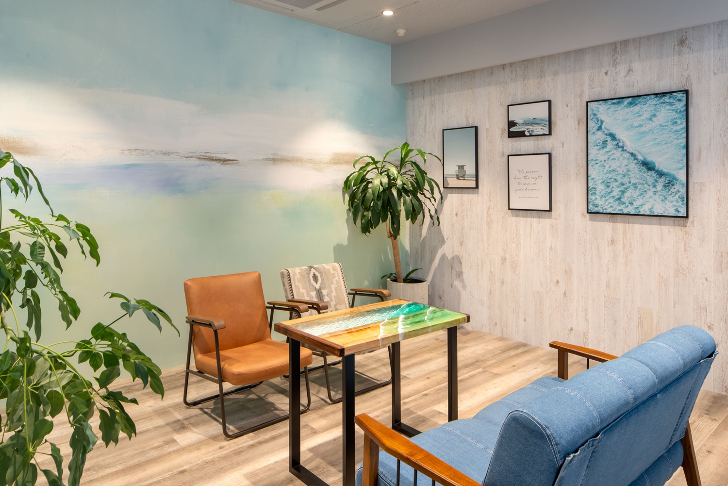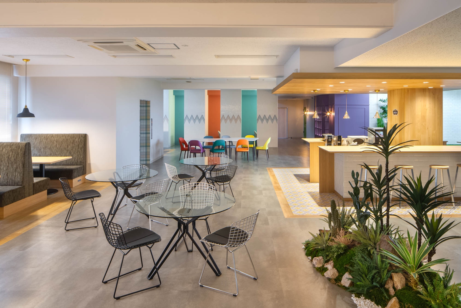 コンセプトは『FLASH』。「社員が固定概念にとらわれず働くことができる環境を構築したい」という社長の意向を反映し、社員の価値観の幅を広げ、一人ひとりを輝かせるオフィス目指しました。各会議室には「北欧」「西海岸」「バリ」「ブルックリン」という4つのデザインコンセプトを設け、それぞれの世界観をイメージした空間を設計。ラウンジスペースは公園とカフェから着想を得て、人工芝エリアやファミレスブース、カフェカウンターを採用し、柔軟な意見交換を促すことができる開放的で明るい空間にしました。フロアをつなぐ階段は各階で塗装色を変え、移動時もワクワクできるように工夫しています。