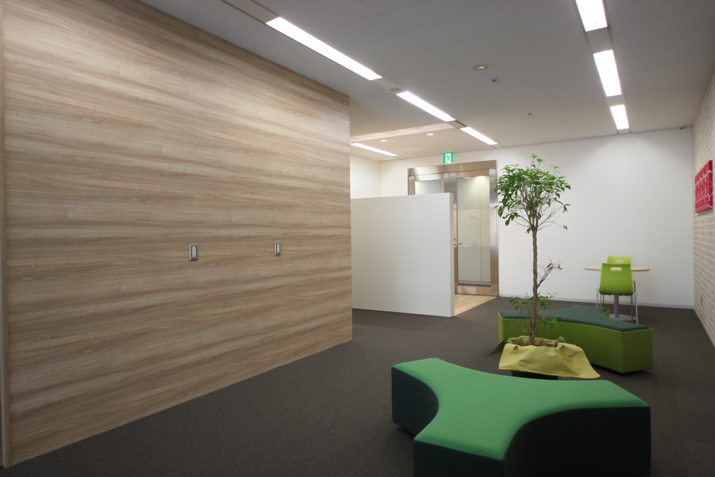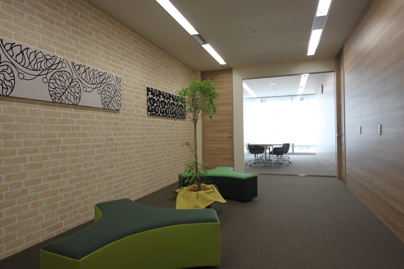キャリア相談に来た保育士のみなさんが気軽に入れるように、やさしさと安らぎを感じさせてくれるデザイン設計を心掛けました。左官職人の手作業による小手仕上げの壁と、柔らかな木目のフロアタイルは、訪れたお客様に、自然のぬくもりを感じさせてくれます。待合スペースから会議室へ向かうと、正面にはフルハイトのガラスの仕切りから降り注ぐ外光が、より明るい未来を提供するための、温かく解放感に溢れた空間を演出しています。お客様と未来をつなぎ、保育に関わる全ての人がハッピーになるレセプションオフィス空間になりました。