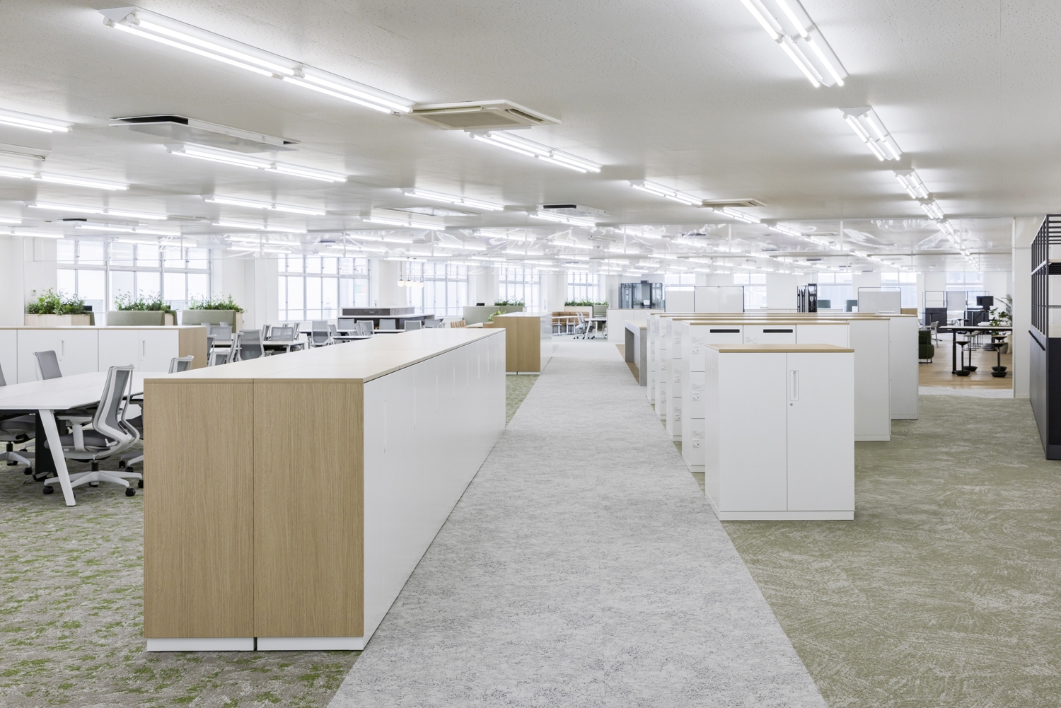 今回のオフィス構築の重要なポイントは「交流」「挑戦」「変化」 の3つ。サーベイやリサーチの中でクボタ様が求めるウェルビーイングは「人と人との交流」であることが分かり、気づきやひらめきがイノベーションにつながり、自己効力感が育まれ、社員が活き活きと働ける「WELLBEING」な環境を目指すべきゴールに設定しました。また、雑然とした印象があった旧事務所から居場所となるワークプレイスを構築することで、チャレンジ精神を育む空間になることを目指して『CROSS × FIELD』というオフィスコンセプトを掲げました。これまで以上に、コミュニケーションを活性化させていくために、さまざまな方と視線が交差するよう工夫。あえて、斜めの動線を生みだすよう什器などのレイアウトを工夫し、空間全体でコンセプトを体現しました。