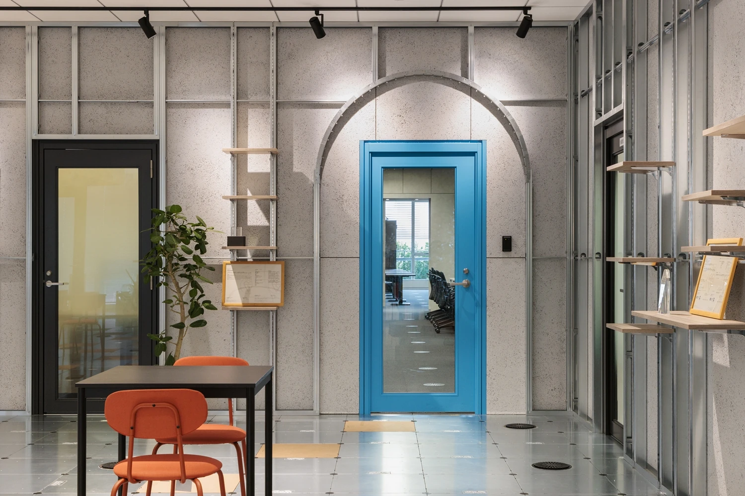 コンセプトは 『Enrich your creativity』。フリーアドレス化にともない、オフィスはオープンスペース・ワークスペース・クワイエットスペースの3つのエリアで構成。それぞれに多様な働き方に対応した選択性のある席を設けました。エントランスの隣に配置したオープンスペースは、エントランスからの広がりを意識して設計。軽やかな家具を用いることで、伊藤忠インタラクティブ様らしさを表現し、柔軟性のある空間としています。一方、ワークスペースとクワイエットスペースは収納・クローク・打ち合わせスペースを内包する機能的な仕切りで緩やかにゾーニングし、適度な繋がりを持たせました。「異素材の融合」というテーマをもとに、エントランスやオープンスペースには木とスチールを採用。さらに、LGSやOAフロアを仕上げ材として用いることで、未完のオフィスを表現し、発展の余白を残しました。これにより、社員の皆さまの創造性を刺激する空間を目指しています。
