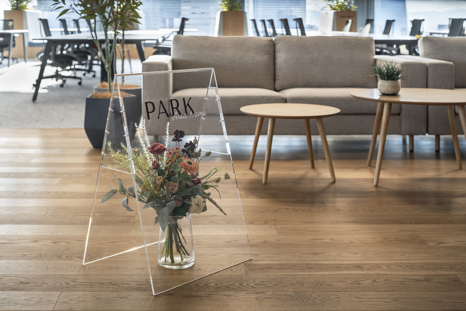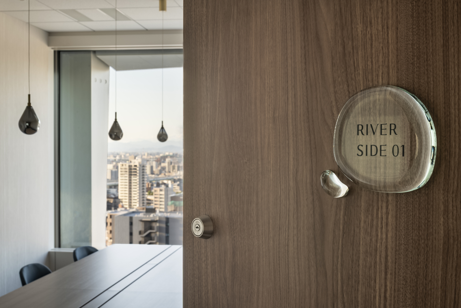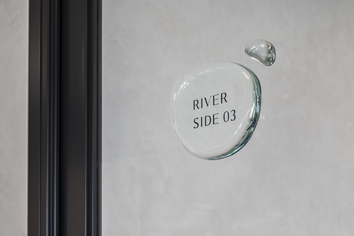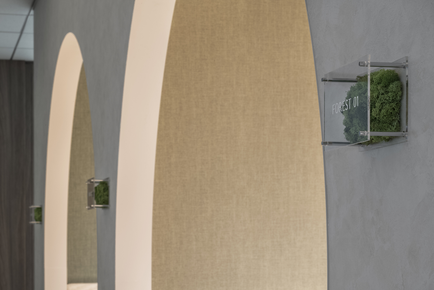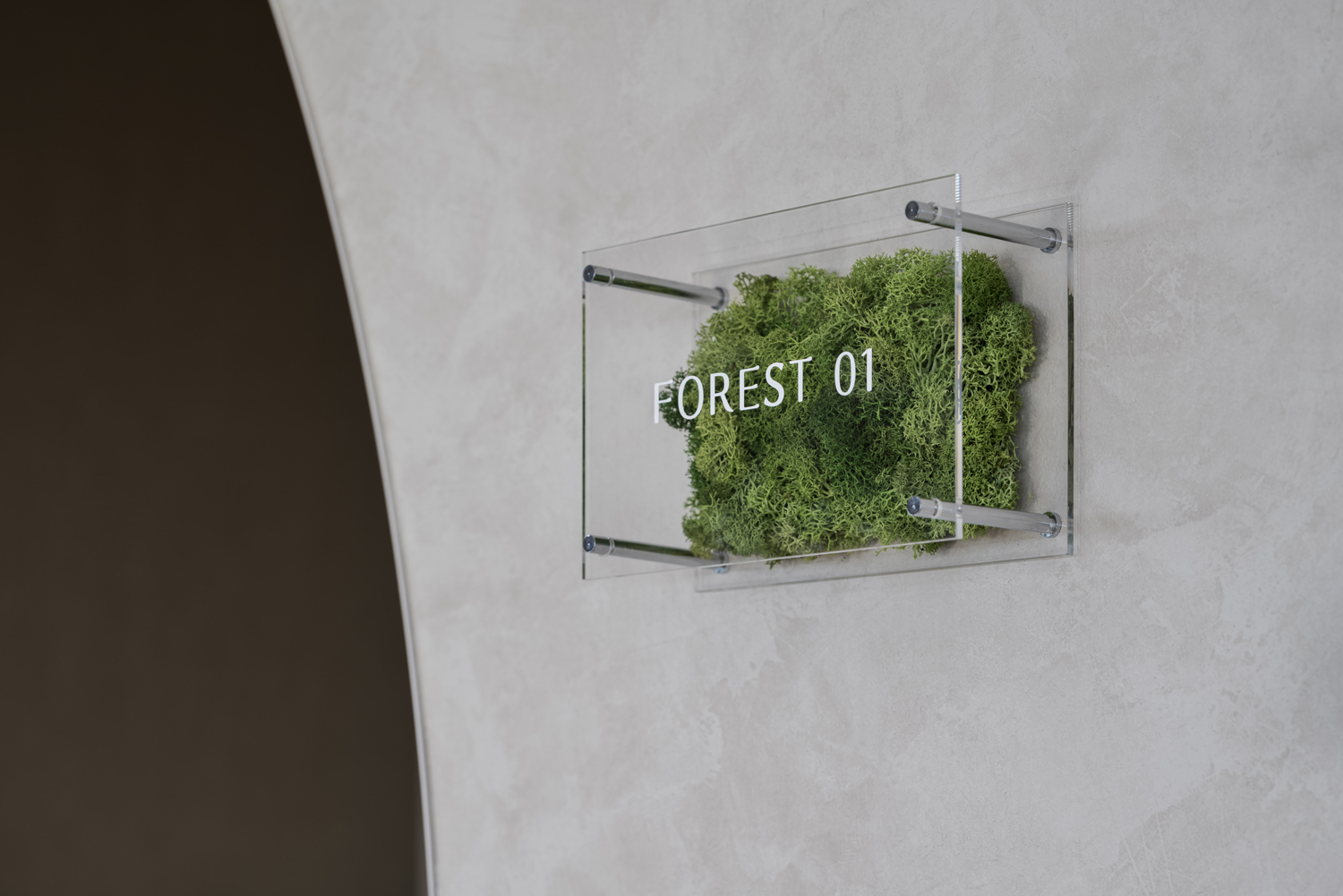 お客様に決めていただいたエリア名や会議室名をイメージ通りに表現するため、その場所を象徴するようなエリアサインやルームサインを制作。「River side」という名の会議室には水滴をイメージした立体的なサインを、「Park area」のサインには花束を使い、花であふれる公園をイメージしました。「Forest」という会議室にはフェイクの苔を使用してより空間のイメージを深めるようなサインをデザインしました。