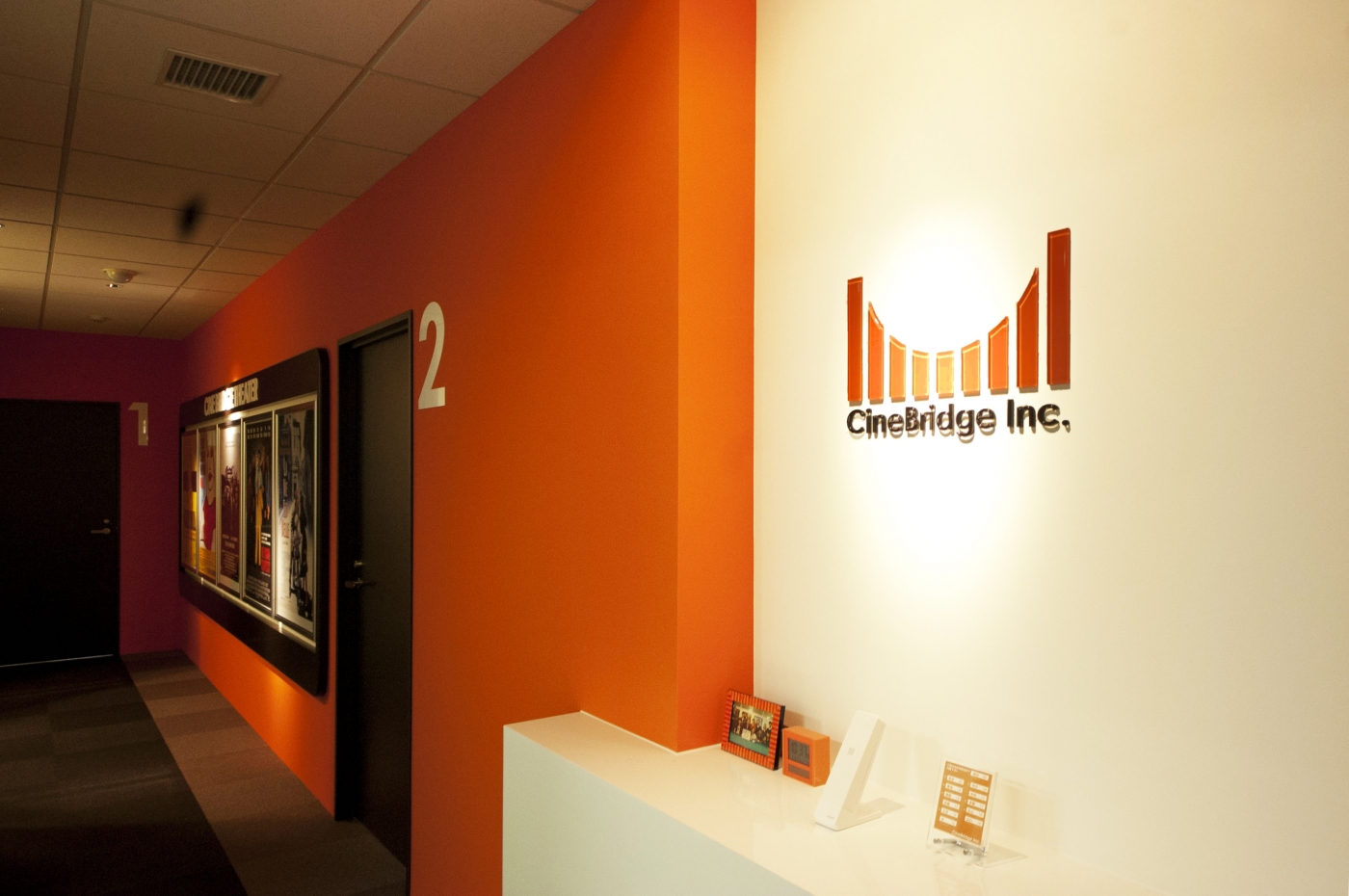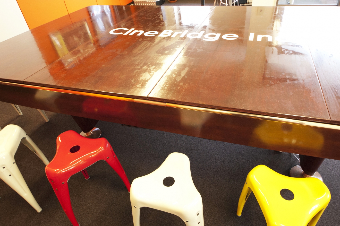 スタッフの一番好きな映画のポスターを一人ずつパネルに入れて飾る文化のあるシネブリッジ様。役員セレクションの映画はエントランスの-CINEBRIDGE THEATER-に展示し、雰囲気はまるでシネコン。空間全体はヴィヴィットなコーポレートカラーのオレンジと落ち着いたブラウンの組合せにし、各部屋の大きなナンバリングもシネコンをイメージしました。訪れる方々にも映画を感じていただけるよう、想いを込めました。また、以前より使用しているビリヤード台には新たに天板を製作し、世界で一つだけのビリヤード兼テーブルに変身しました。