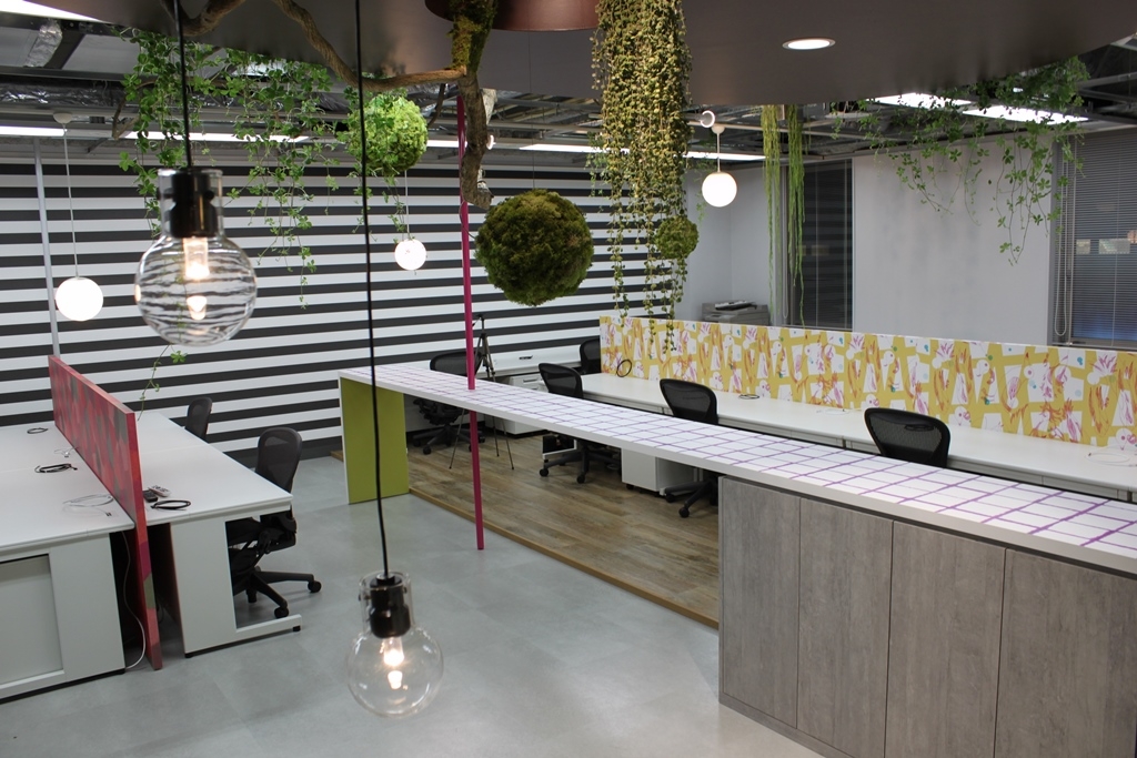 増員に伴う館内増床のプロジェクト。別フロアで作った「秘密基地」のようなオフィスとは一変、明るいオフィスで働けるような空間デザインをしました。働くスタッフにとって最高の開発環境を整えるという大きなコンセプトを継承し、より働きやすさを追求したオフィス設計をしています。当初酸素カプセルの設置を検討しましたが、そこに遊びゴコロをプラスして、今回は部屋全体がまるで酸素カプセルになるように、本物の植栽を万遍なく配置することになりました。明るい空間で自然と共に成長する。そんな酸素濃度の高いオフィスができあがりました。