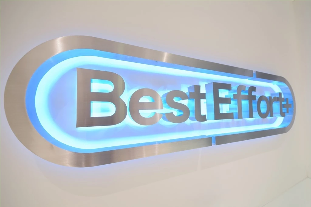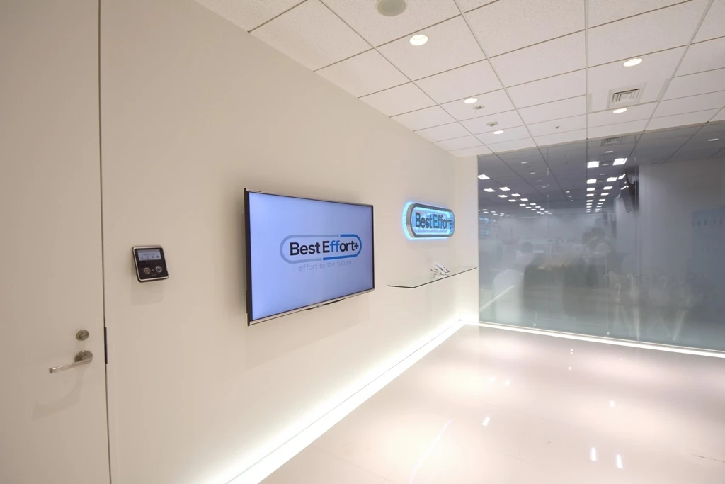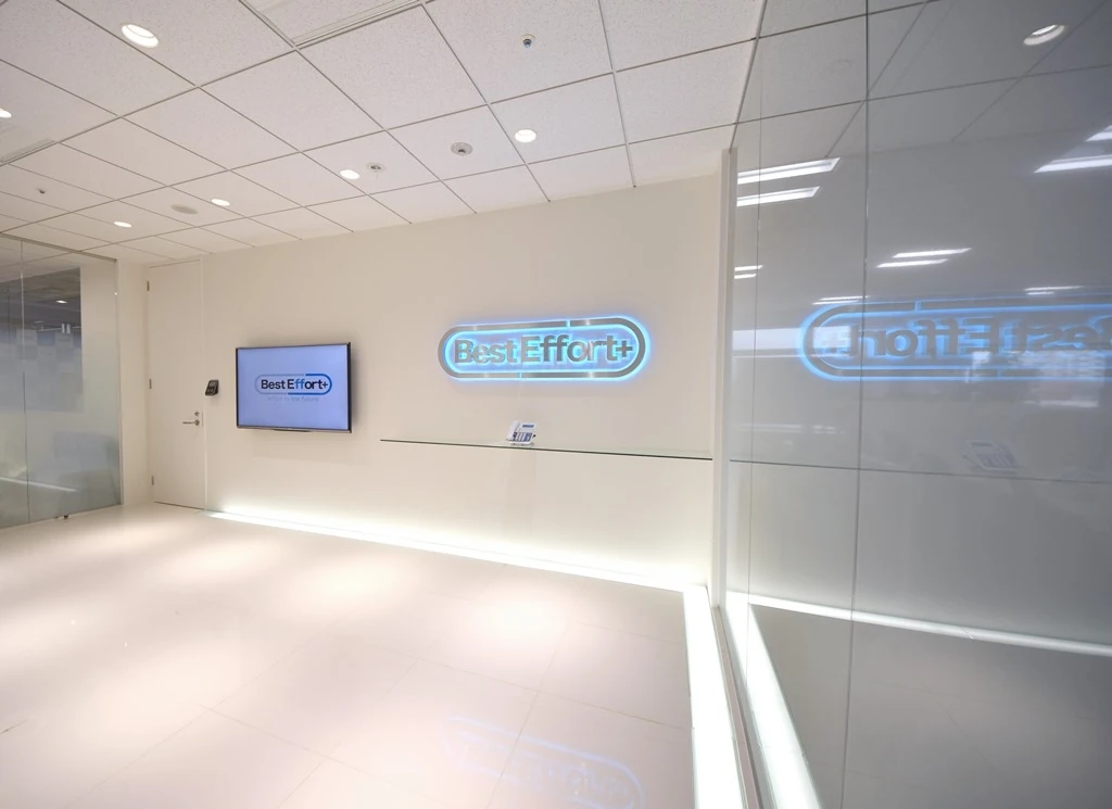 「他にはないコールセンターを。」というところから「近未来」をコンセプトにオフィス設計デザインをご提案させていただきました。ホワイトのタイルに間接照明やダウンライトの光を当てることで、近未来的な空間を演出しています。また、ブルーの照明が入ったアルミのサインがエントランスでの存在感を放ちます。その他にも「はたらく人を第一に」との考えから、今回初めて導入したバーチャルゴルフやペリカウンターを転用したベンチが、オフィスを楽しい空間にしています。