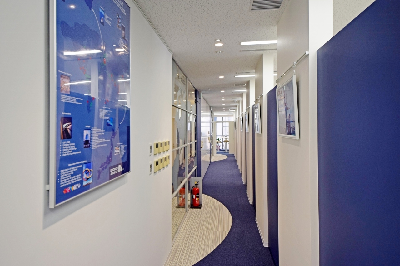 エレベーターを降りると、思わず背筋が伸びるダイナミックなエントランスが待ち構えます。共用部と専有部を仕切る既存のパーティションはレシャコブルーに色を変え、ガラスには世界地図を。間仕切りの向こう側まで続く床には、事業内容である「海運」をイメージした波の流線的なデザインが、躍動感をもたらす爽やかな空間に生まれ変わりました。会議室へ続く廊下の壁は、高さを段違いにして既存の照明を避けるとともに、荷受けカウンターを造作。機能面も十分に配慮しています。また、ワークスペースではガラス間仕切りを採用し、社員の皆様が東京タワーの眺望を共有できるレイアウトに。ビルが持つ魅力をさりげなく、かつ最大限に活かした、グローバルオフィスです。
