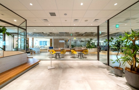 光が降り注ぐエントランスに入ってまず目を惹かれるのが、ウッドパネルを惜しみなく使用したエントランス。 そして一本の道で事務所スペースまで続く奥行き感のある通路です。 通路の先には「ONE FOR ALL, ALL FOR ONE」社訓が掲げられ、毎日出社する際に必ず意識できるような仕組みです。 会議室にはBGMを流し聴覚に働きかけ、リラックスできるような工夫を取り入れています。 ウッドパネルで木の手触りを感じたり、カフェスペースを設けることでコーヒーの匂いを感じたり、仲間との美味しい食事をオフィスで共有することができる、そんな五感を楽しませるナチュラルオフィスが完成しました。