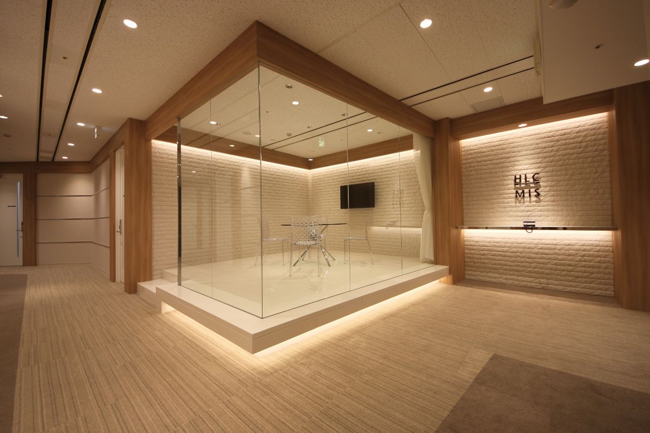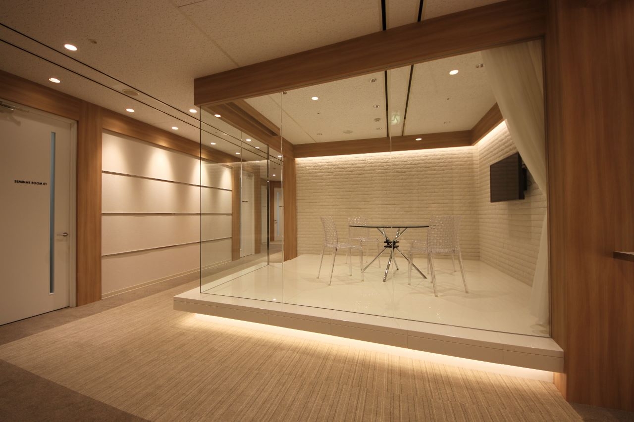 エントランスにはガラス張りのミーティングスペースと豊富な間接照明の光をデザインし、配置する家具も光を綺麗に反映するデザイン家具を提案しました。一番最後までこだわりぬいたエントランスは大きなインパクトを与えられる空間となりました。 明るく落ち着きのある廊下を抜けると大きな窓に面した場所に、重厚感とスタイリッシュを兼ね備えたレセプションルームが広がります。 どのエリアもデザインや家具までこだわりぬいてご一緒に選定させて頂き、それぞれ印象の異なる空間を創ることができました。状況に応じて空間を選んで頂ける、バリエーション豊富なオフィスです。