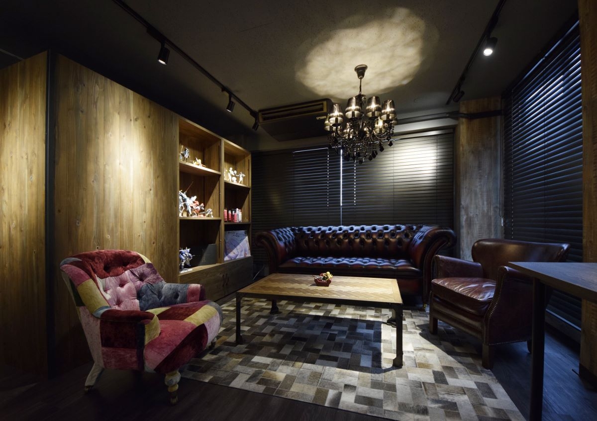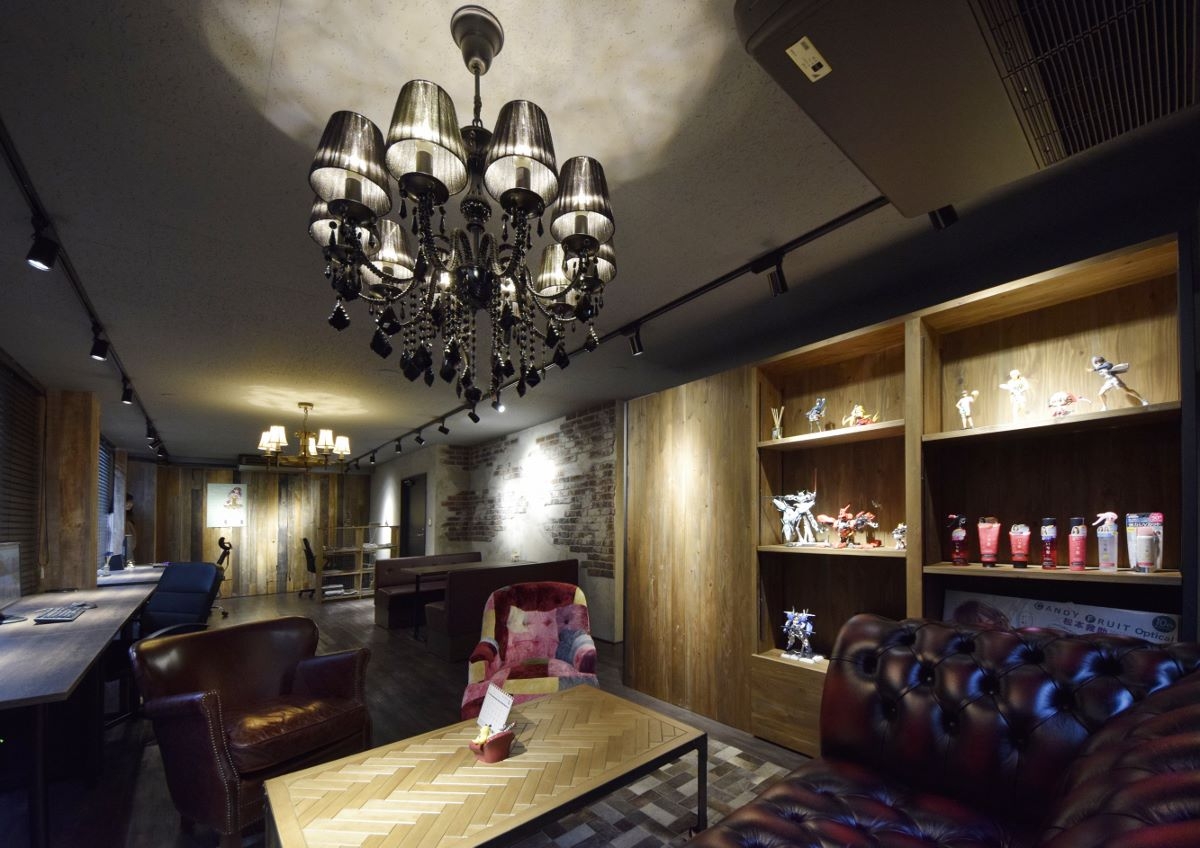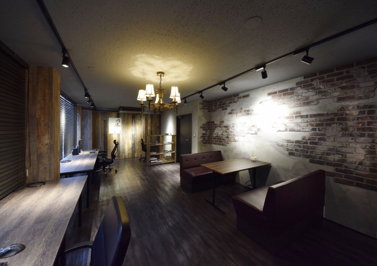 「アメリカのBarに来た様な空間創り」をコンセプトに木とブラックカラーを基調にデザインしました。エレベーターを降りた正面のドアからコンセプトを感じていただけるよう、型板ガラス入りの既存建具から鉄扉に変更。敢えて部屋内は見せず、ドアを開けた瞬間にシャビーシックbarに入り込む世界観を演出しました。家具へのこだわりはもちろん、表装素材も壁ごとに様々な別素材を使用するなどの工夫を施しました。自然に使い込んだシャビーシックな印象を持たせるため、塗装した古材木を用いたり、自然と剥がれ落ちたかのようなレンガ壁を演出する為、割れたブリックタイルや左官を施しました。家具は全体の雰囲気に合わせ、スマートに且つ機能的に配置し、全体的にバランス良いオフィス空間となりました。