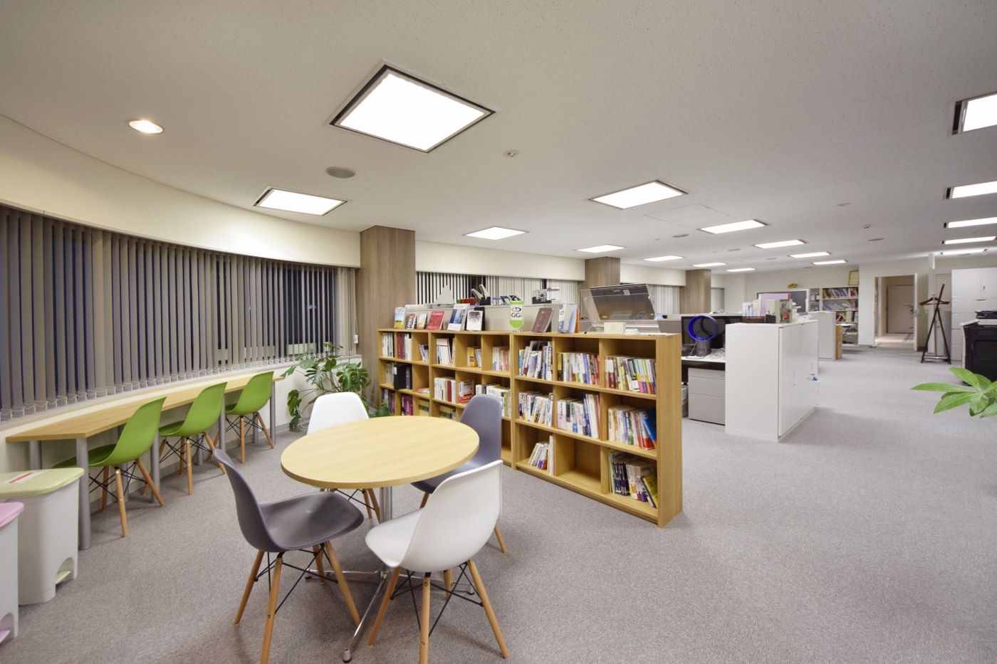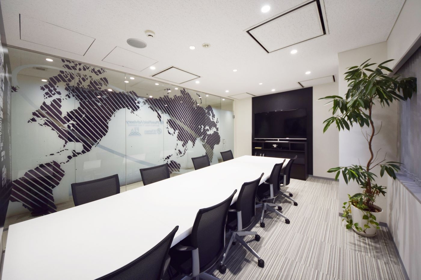 エレベーターを降りるとすぐに、ガラス全面に施されたグラフィックが目に飛び込んでくるインパクトのあるエントランスを作りました。世界地図のグラフィックはグローバルに展開しているプラムフィールドアドバイザリー様の企業イメージを反映させたものです。こちらで働かれる社員様のイメージから連想される、洗練された印象を表現する為、タイルカーペットの貼り分け等、ポイントでデザインを施しながらも白を基調としたシンプルで明るい空間を作り上げました。