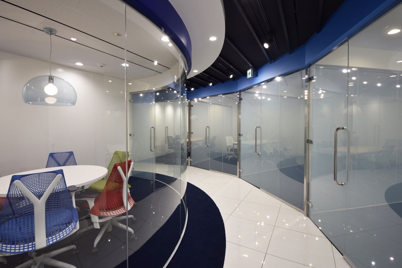 エントランスと会議スペースの改装プロジェクトに携わらせていただきました。ブランドイメージを全面に感じられるように、コーポレートカラーの2色の青が映えるデザインにしました。コーポレートカラーであるネイビーとライトブルー2色の青が奥へと続いていくことでコンセプトの"TSU・NA・GA・RU"を表現し、ガラスと白色、そして曲線を用いることで、未来へと"TSU・NA・GA・RU"、近未来感を表現しました。各ミーティングルームにはそれぞれ異なるテーマを設けたデザインにしており、気分に合わせて選ぶことができます。
