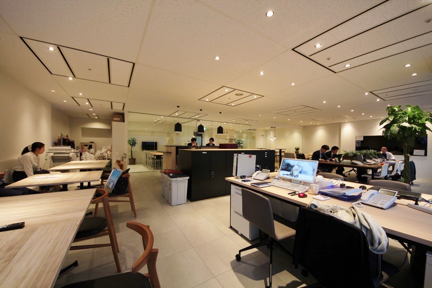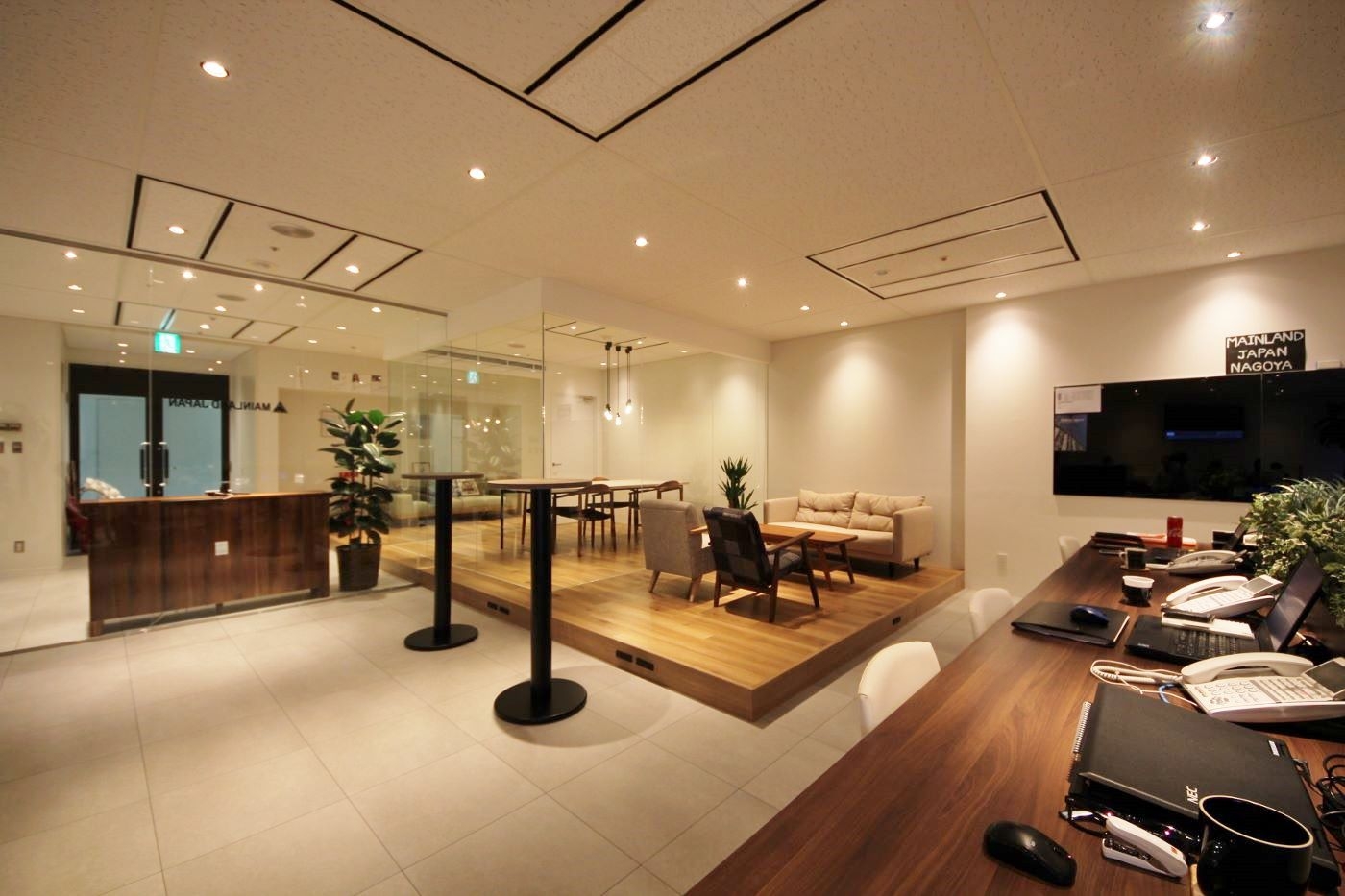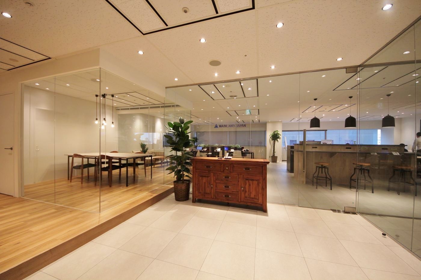 ガラスに囲まれたエントランスは、中に入った瞬間に会議室やワークスペースまで全てを見渡せる程開放感に溢れる空間になっています。 全体的に様々な色味の木目を使い、シンプルの中にもたくさんの遊び心が詰まっています。 ワークスペースはタスクチェアを導入せず、状況に合わせて様々なシチュエーションで働ける空間になり、コミュニケーションが生まれる仕組みが盛り込まれています。一段上がった会議室とソファスペースでは、目線も少し上がり特別な空間を演出しています。