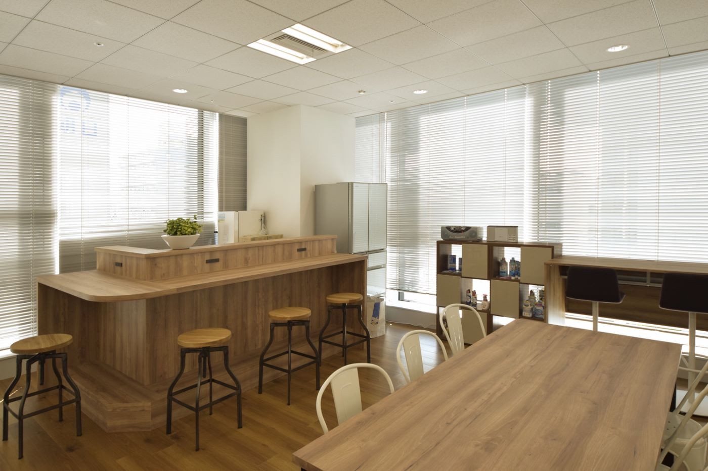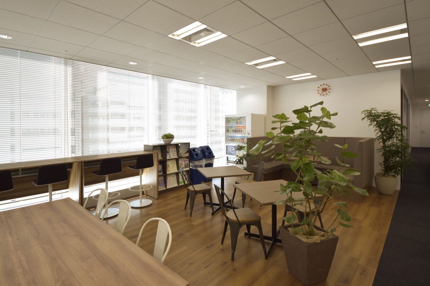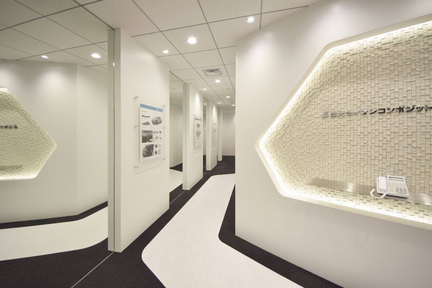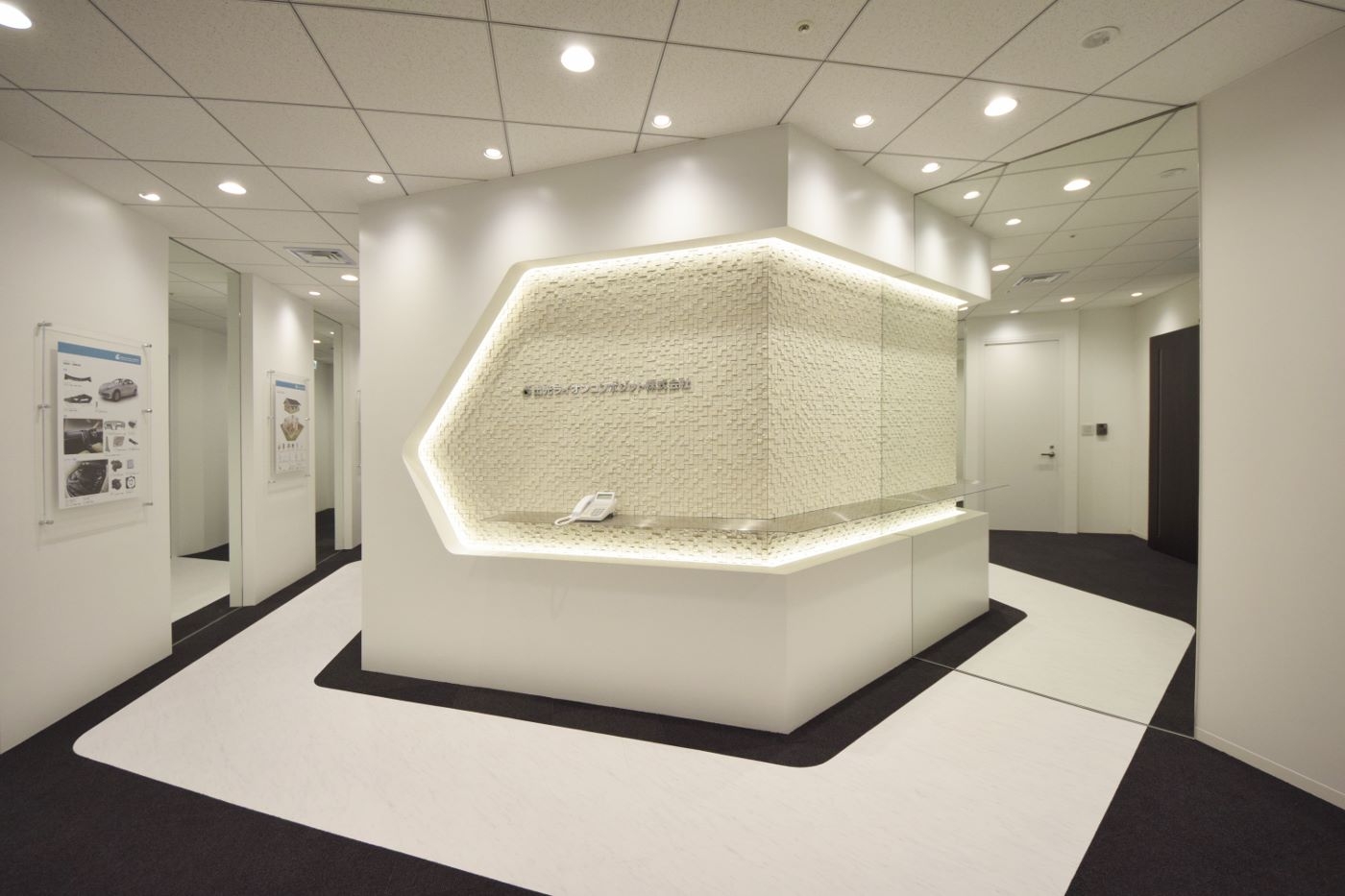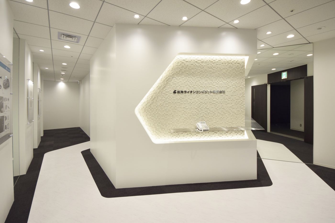 出光ライオンコンポジットさまの企業のブランド力に着目し、そのブランド性や業界としてのパイオニア的存在であることから働く場であるオフィスから企業ブランディングを発信したいと考えました。敢えて余計な装飾は施さず、ロゴの形状からインスパイアーしたスクエアの形をした壁をエントランスとし、シンプルかつ存在感のある空間を実現しました。界壁側にミラーを用いることで空間に広がりと奥行感をだし、壁や床が続いているような演出にしております。凹凸のある磁器質タイルに間接照明の光をあてることで、より洗練された印象を与え企業のブランド性を感じていただける様なデザインを目指しました。リフレッシュスペースはあえて壁で区切ることなく、自然と人が集まれるような工夫をしました。