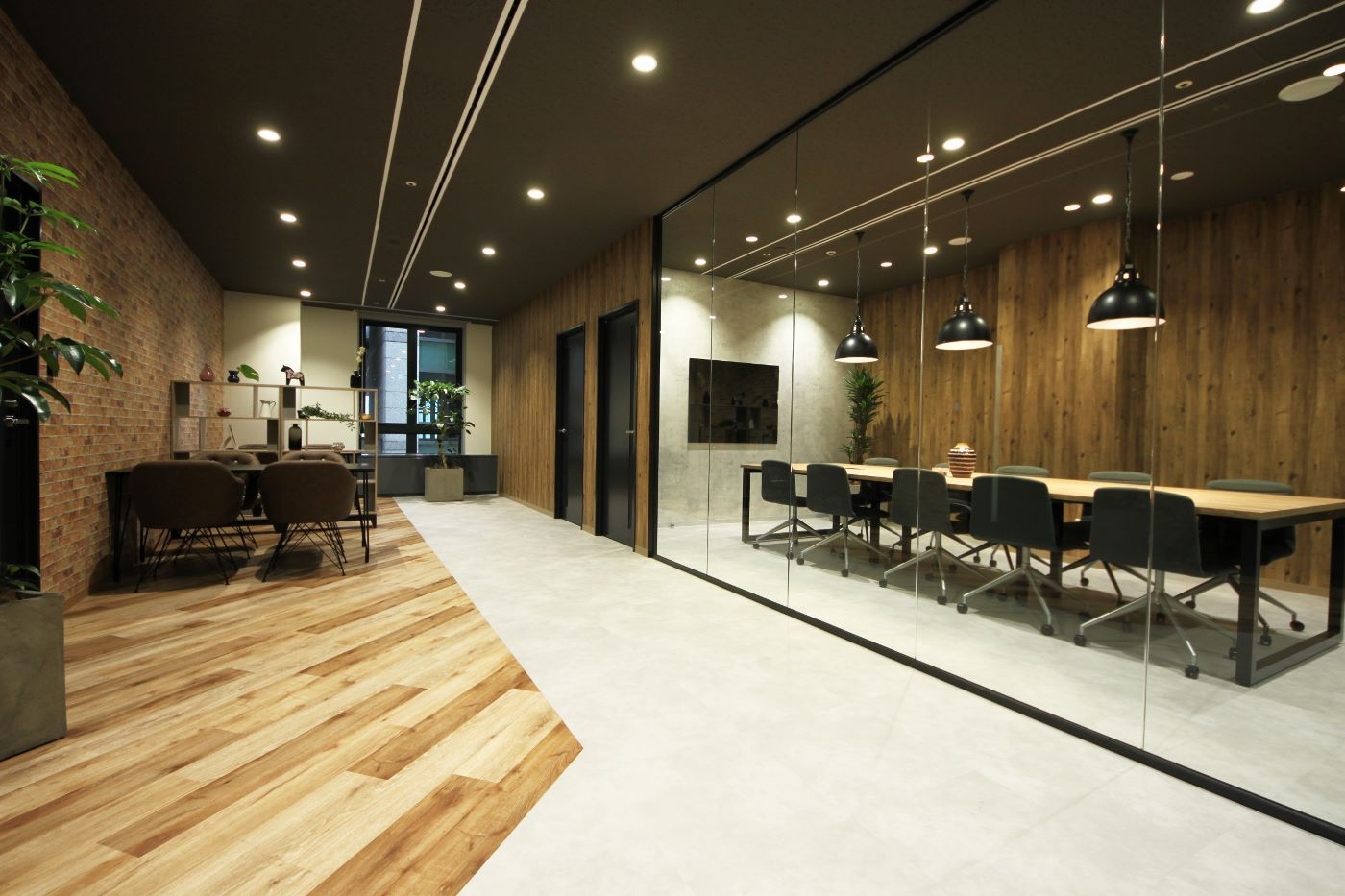 人材派遣事業をされているアクセル様。「派遣の登録や面接にいらした方に居心地の良さを感じていただける空間を。」という想いから、「Be My Guest」をコンセプトにオフィス空間を提案しました。共用部廊下との壁を取り除き、壁をガラスにすることでエントランス空間は広々と開放的な空間となり、より気軽に立ち寄れるような印象に。来客エリアには木目やレンガ調のマテリアルを用い、家具ひとつにしても、素材感を感じるものを採用することで、まるでカフェに居るかのような落ち着きと安らぎのある雰囲気を演出しています。お客様がご購入された小物の数々もオフィス空間のデザインと非常にマッチングしており、まさにお客様と一緒に創りあげたと言える、思い入れのあるオフィスとなりました。