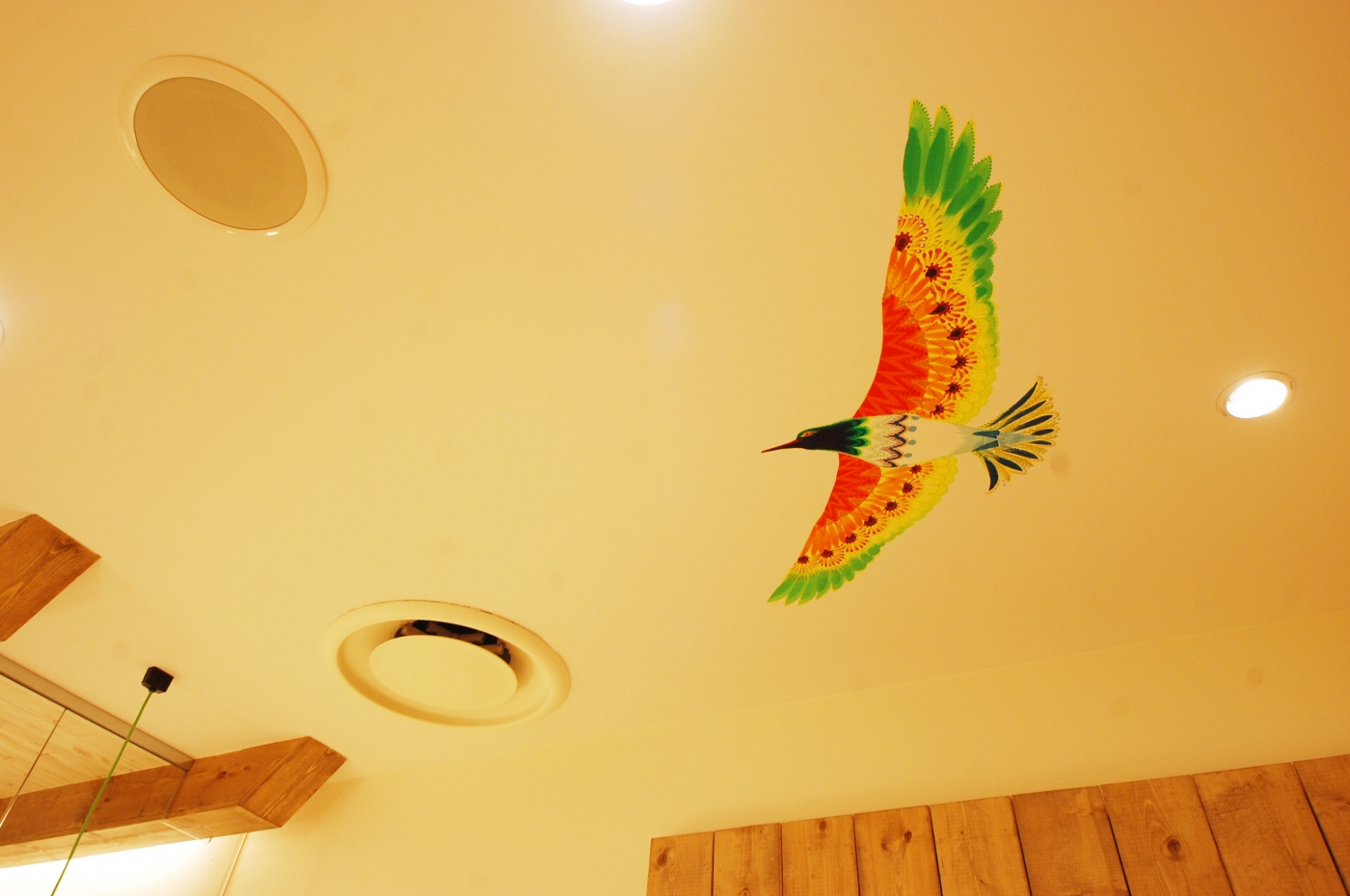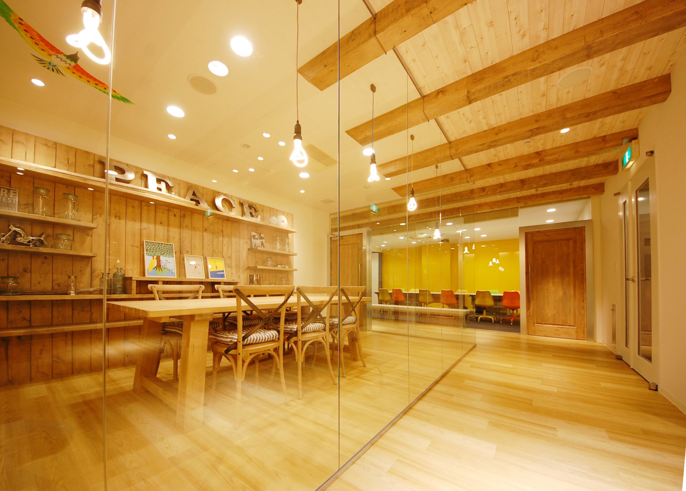 たくさんのアイデアを詰め込みました! エントランスからガラス張りでディスプレイが見えるPEACEミーティングルーム、少し女の子風なディスプレイにしたLOVEミーティングルーム。セミナールームはカラフルなチェアを使用しPOPに、磁器タイルの会議室はシックに。各ミーティングルームの在空表示のプレートを、アイモバイル様で使用されているアイコンを元にオリジナルで作成したり、ワークスペース壁面にそのアイコンで作った壁紙を貼ったり、アーティストの谷村友さんに天井の鳥の絵を描いていただいたり、全面ホワイトボード塗装の壁を作ったり、アイモバイル様と一緒にアイデアを出し合い作り上げました。 自由で、刺激的で、楽しくて、愛があって、気持ちいい。それぞれの「場所」を体感できるオフィスです。