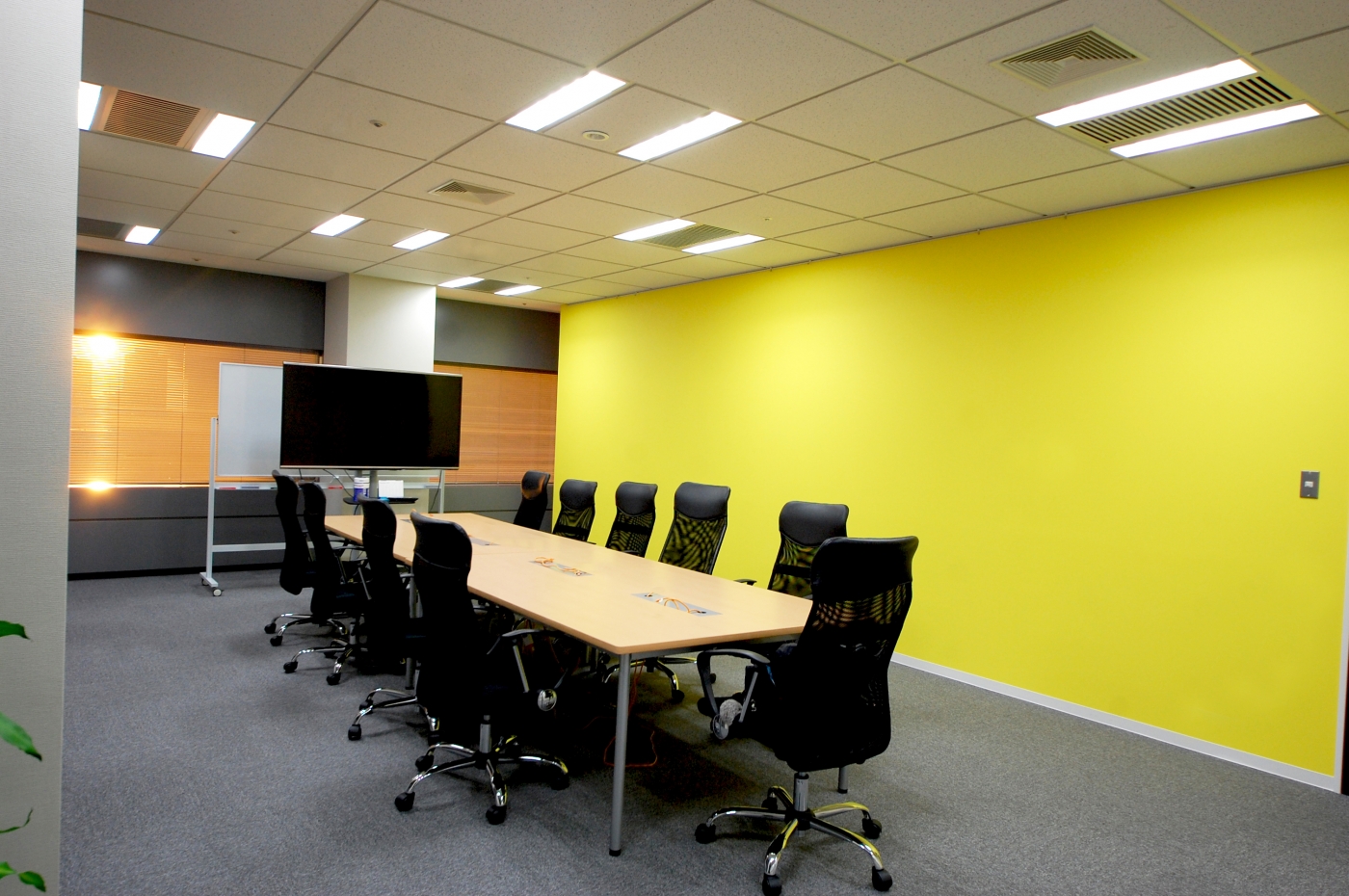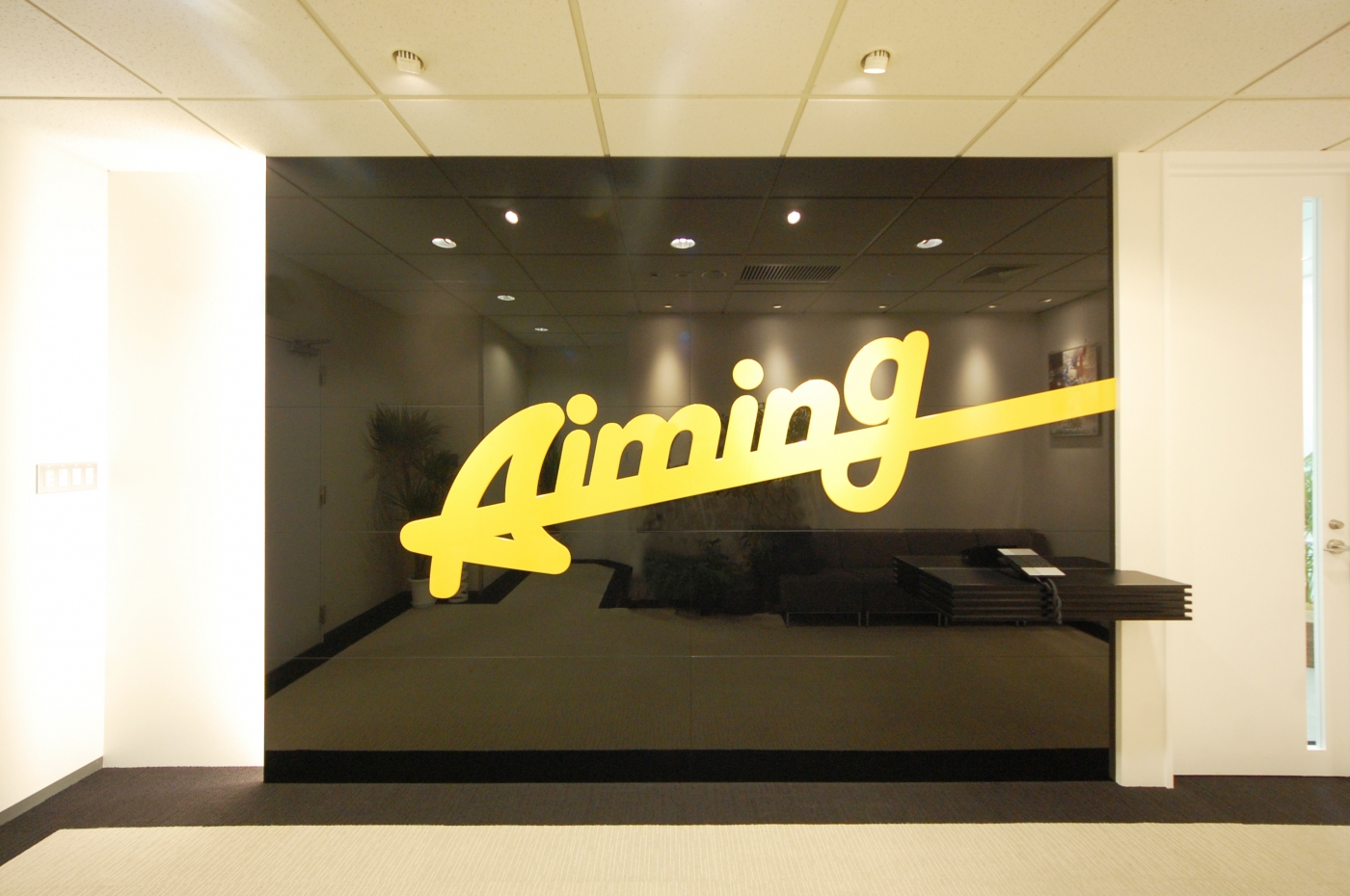 3mものサインが迎えてくれるエントランス。Aiming様の名刺のイメージをそのままエントランスにご提案させていただきました。全体的に落ち着いた空間ですが、黒のカラーガラスにAimingカラーのイエローのサインがかなりのインパンクトになっています。また、レイアウトは打ち合わせが重なってもいいように、会議室を多くとりました。一つ一つの会議室の壁紙を違う色にしているため、「今日は何色だろう?」と訪れる人も楽しめるオフィスができました。