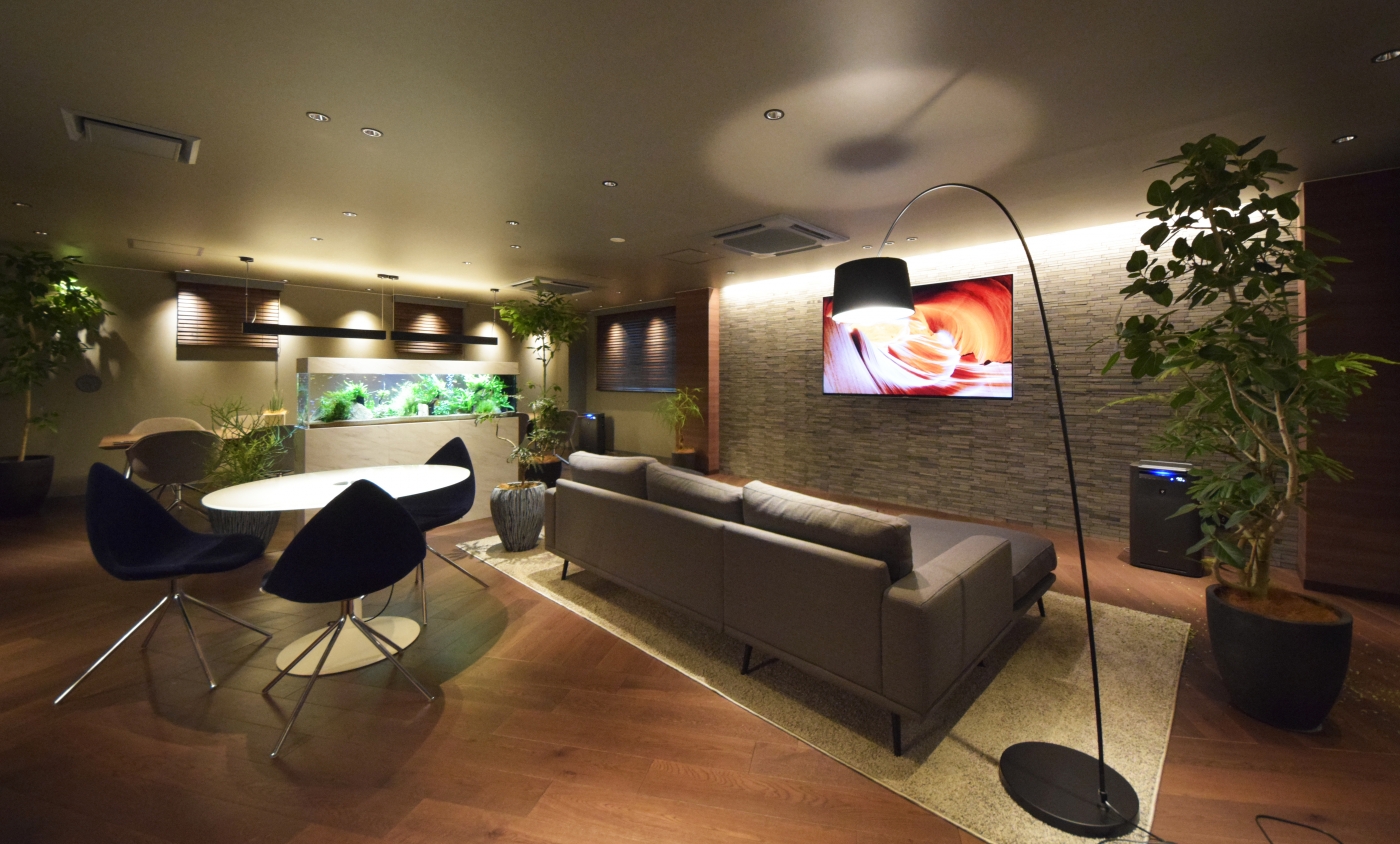 落ち着きと品を感じられるラウンジのようなオフィスです。素材・家具・照明など全てにこだわりました。サテライトオフィスでありながらも、採用セミナーや来客用として使用し、いらっしゃる方にも喜んで頂けるような空間となっております。ハイカウンタースペースではコーヒータイムを、ソファスペースでは80インチモニターを利用して打合せが可能です。ビックテーブルは打合せはもちろん、ランチや会議、普段の仕事場としてもお使いいただけます。状況に合わて使うという目的はもちろん、いるだけで満足感が得られるような贅沢な空間です。