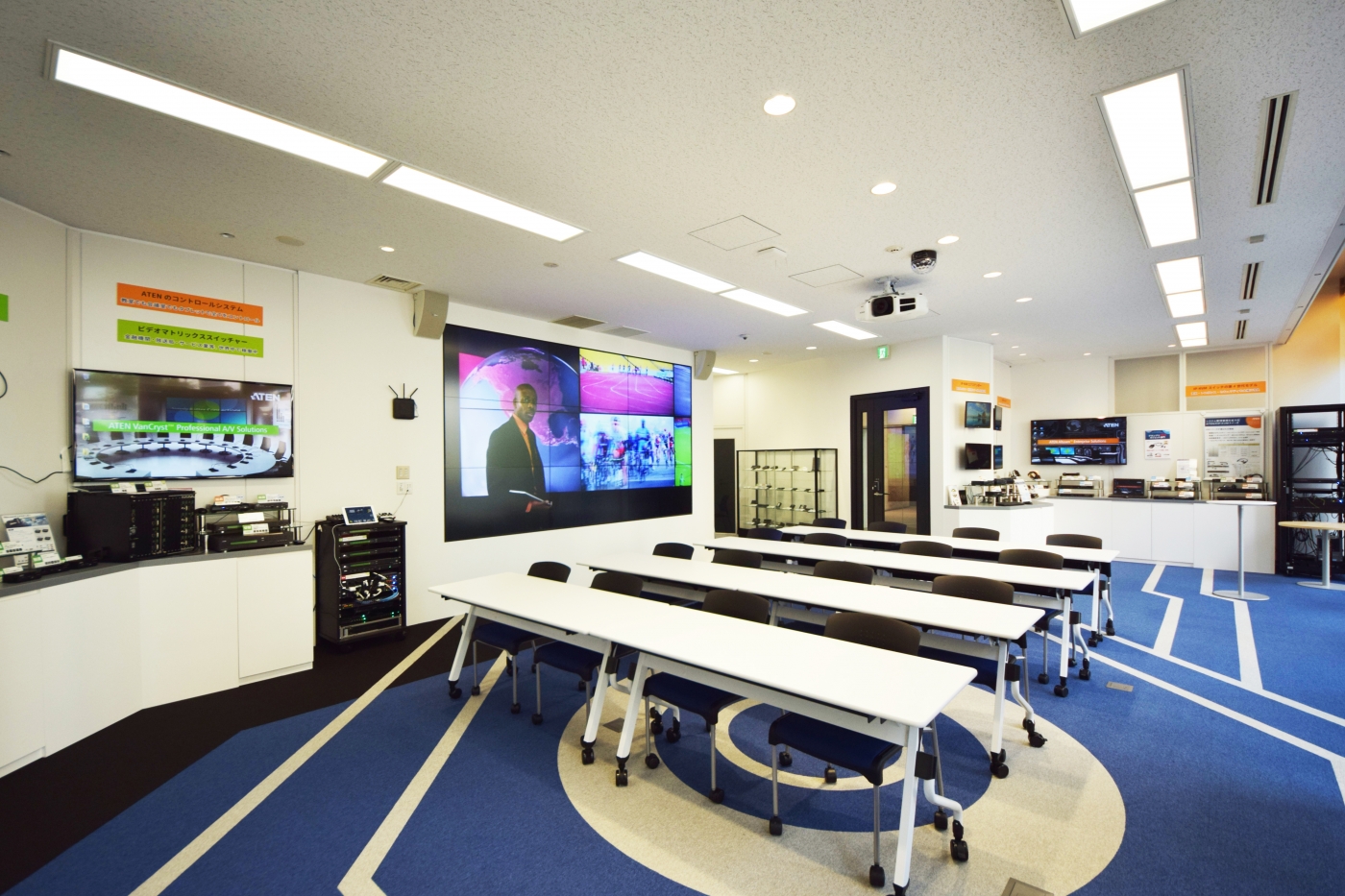 「営業エリア拡充のための神田にショールームを構えたい。」「企業の商品を体感して知ってもらえるセミナーを行える場所にしたい。」というご要望をいただき、ご提案をさせていただきました。コーポレートカラーをふんだんに取り入れ、エントランスにはミラーを設置することで空間を広く見せています。それだけではなく、正面の装飾がミラーに映り込むことによってATENジャパン様の「A」の文字が浮かび上がり、企業のアイデンティティとつながりを演出しています。大通りに面したビルの1階という地を最大限に生かし、外からも思わず覗いてしまうショーウィンドウのような、そんなショールーム・セミナースペースを手掛けさせていただきました。