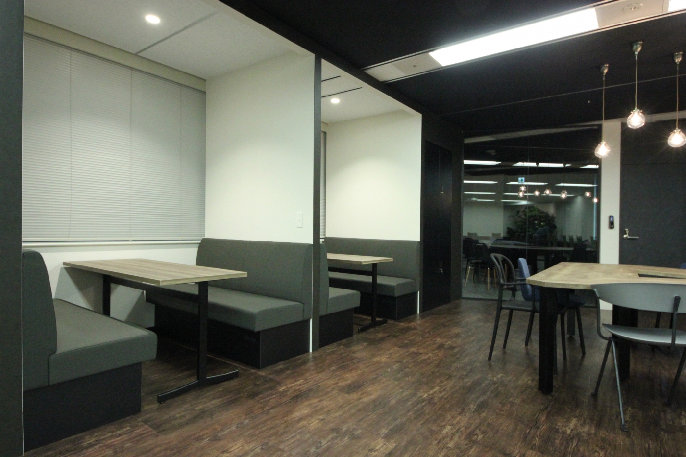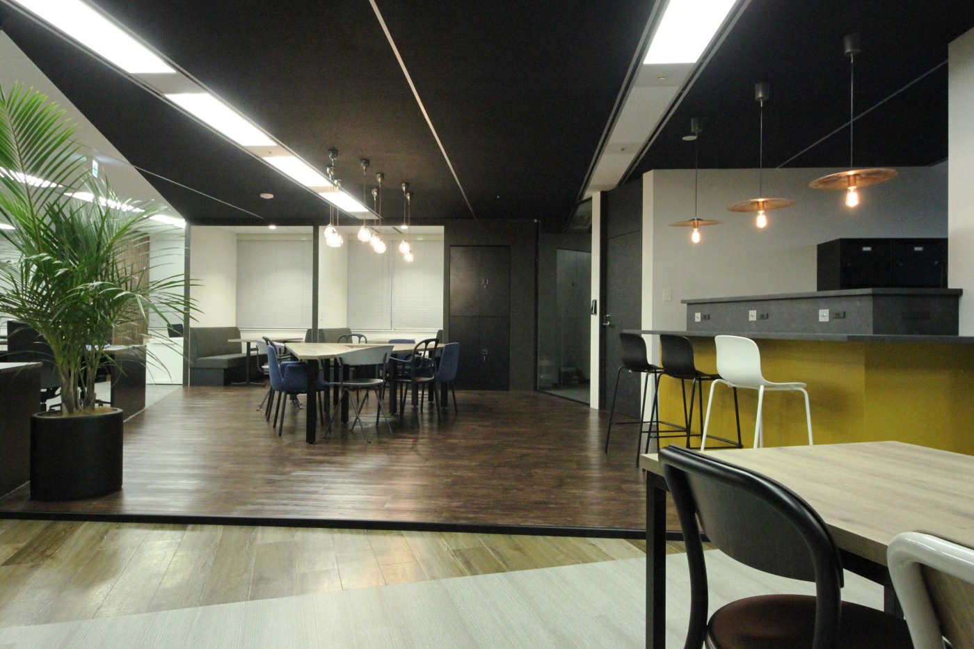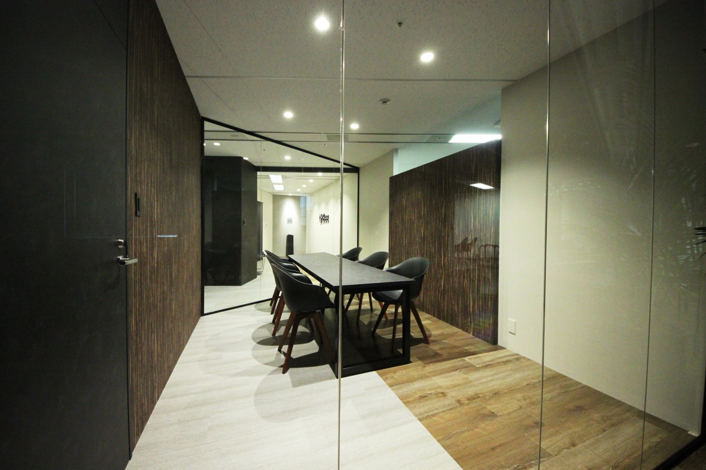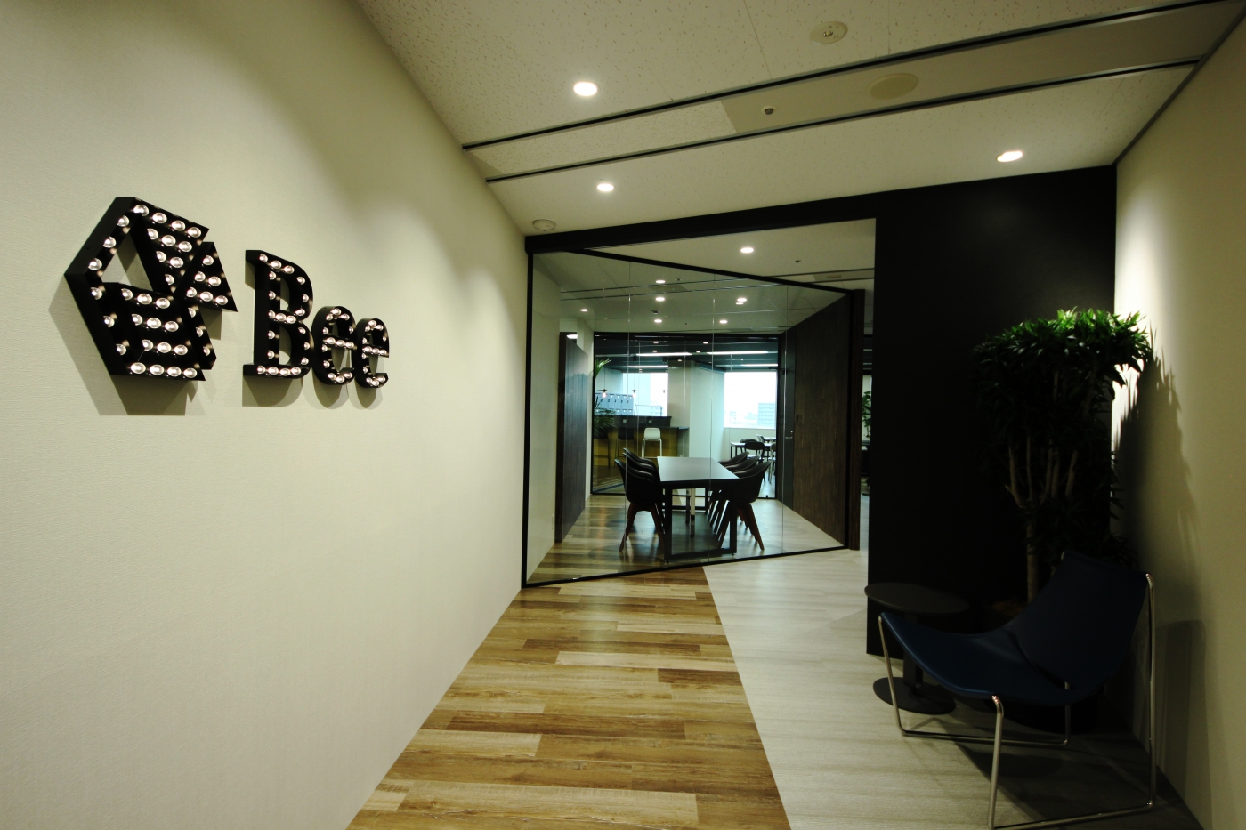 『エントランスに入った瞬間、社員の創造力をかき立てるようなオフィスにしたい』というご要望を頂き、デザインさせて頂きました。シンプルな構成ながらも、インパクトのあるサインで「Bee」ブランドを印象的に魅せています。様々な角度で建てられたガラスの間仕切りは、不規則性と解放感を演出。ワークスペースの中にも、平行な直線や直角の壁面はほとんどなく、天井の塗装の塗り分けや、床の段差・貼り分けなどでブロッキングをし、様々な遊びを取り入れました。男性的な「かっこよさ」をデザインの中心に置きながらも、木目や植栽を随所に取り入れることで、温かみを感じさせる唯一無二のオフィスとなりました。