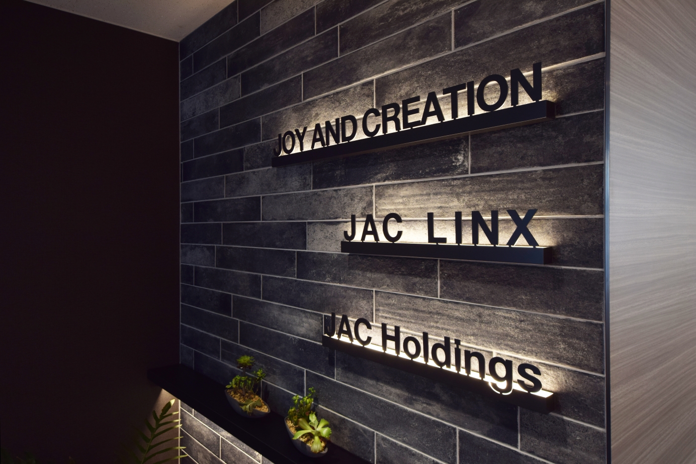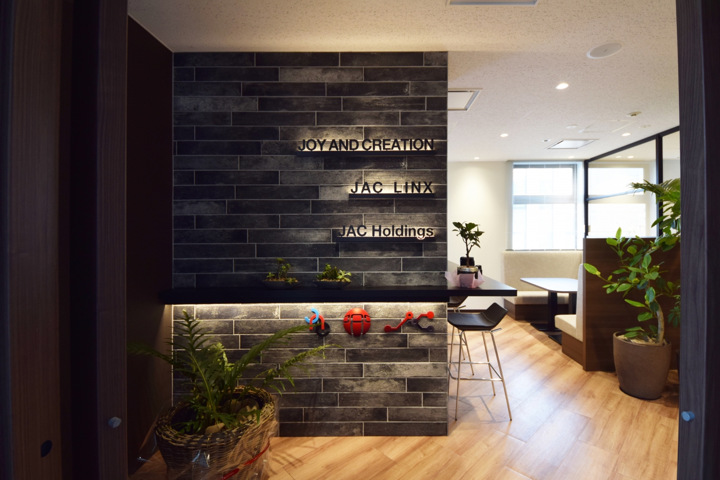 事業拡大を進める中で「女性が働きやすいオフィスにしていきたい!働く環境を見直していきたい!」というご要望をお伺いし、オフィスをデザインさせて頂きました。オフィスの構成は、「繋がる」「癒す」「ふれあう」「働く」の4つのキーワードをもとにレイアウトしています。エントランスにはブリックタイルを使用し、全体的に重厚感のあるデザインに。サインはLEDの発光サインを採用し、ジョイ・エンド・クリエーション様らしさをアピールしています。ワークスペース内は、グリーンを設置し癒しの空間を創ったり、様々なコミュニケーションスペースを設けるなどの工夫をしています。また、家具は全て新調し、全体的に統一感のあるオフィスができあがりました。全体を通して、落ち着きのあるデザイナーズオフィスとなりました。