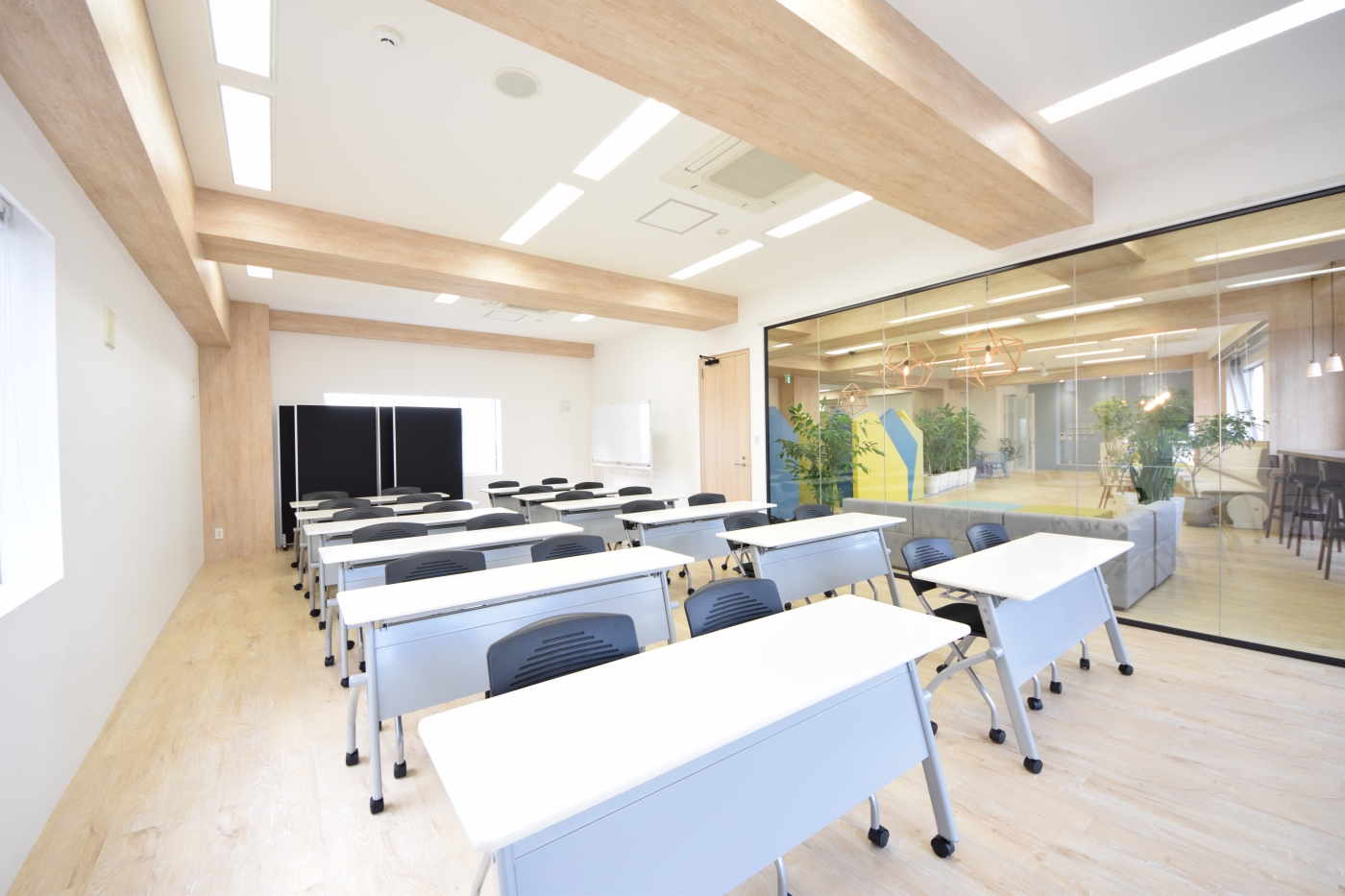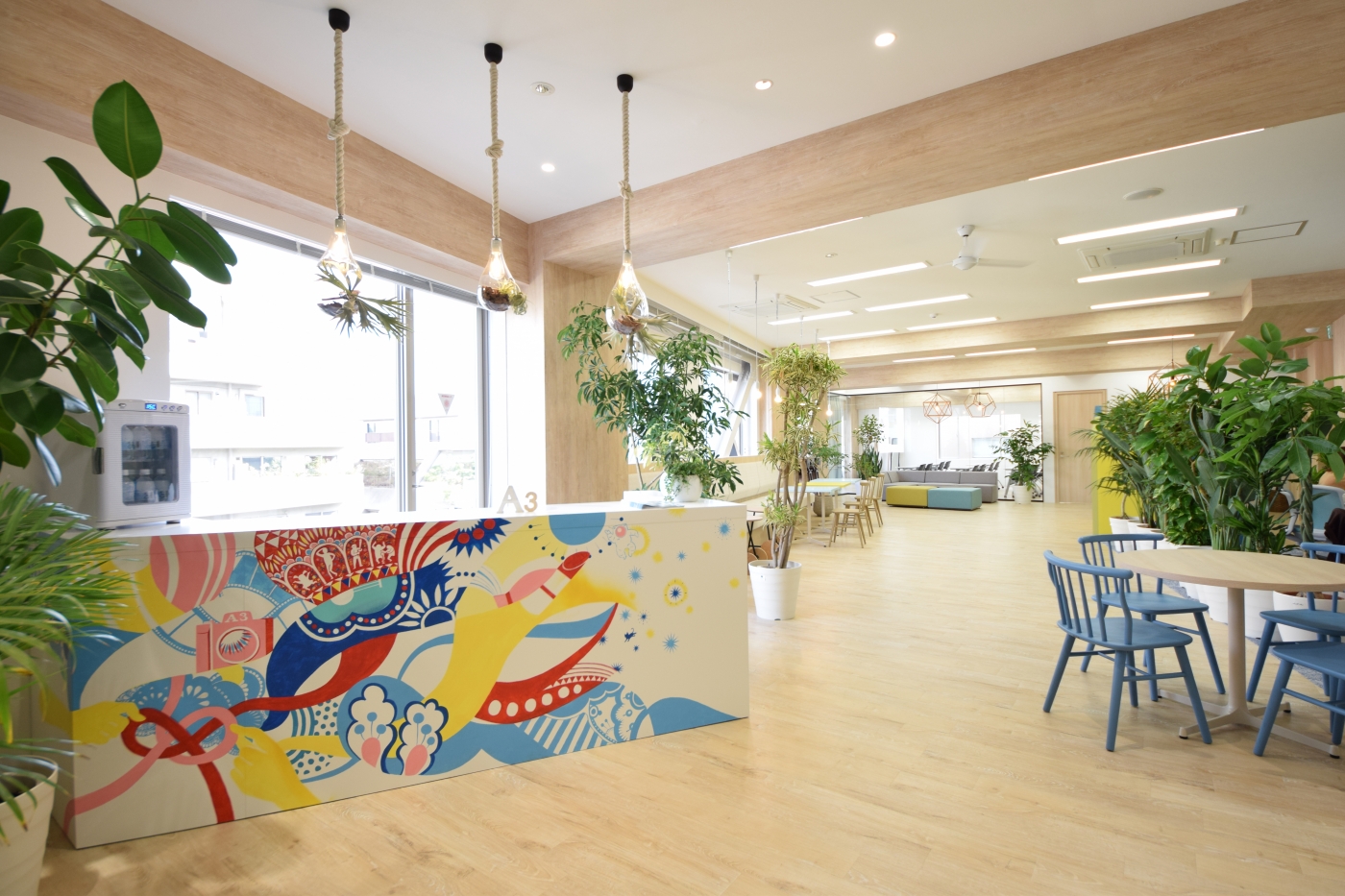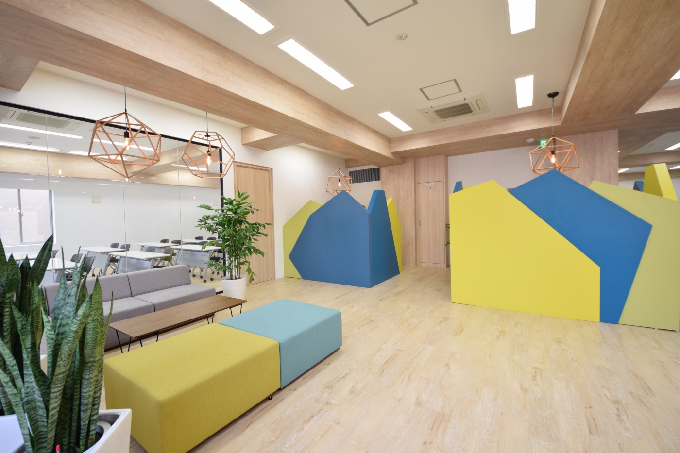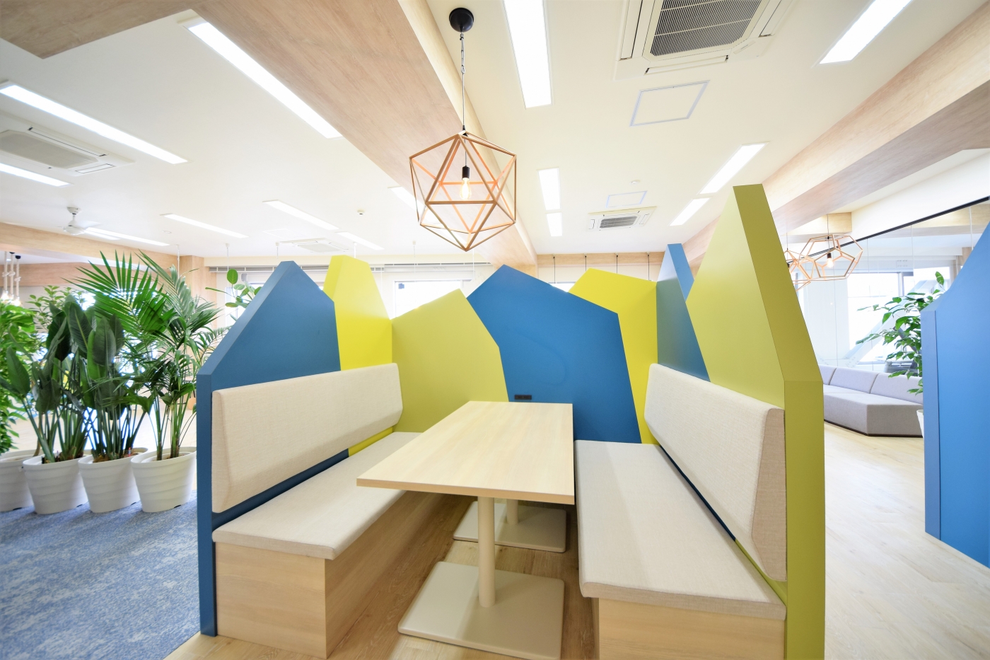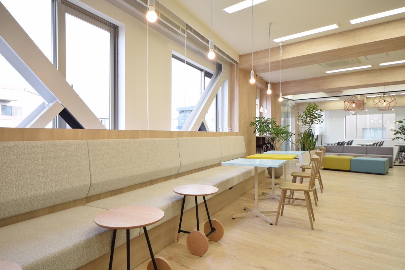 繋がりや広がりを表現したアートがオフィスに迎え入れてくれる、そんな開放感あふれるオフィスが出来上がりました。天井が高く、窓一面がガラス張りの採光が豊かな空間であったため、もともとの開放感や明るさを保つよう、全体的には木目を基調にしています。アクセントとして色彩豊かなランダムパネルを取り入れ、オフィス感をあまり出さないようなデザインを演出しました。 構造上取り払うことができない梁(はり)には木目のクロスを貼り有効的に活用。アートで表現した広がりがオフィス全体にも繋がる居心地のいいオフィスとなりました。フリーエリアにはファミレスブースやソファースペースなど、各ブースを設置することで自分に合った働き方も選べ、社員の皆様の笑顔が溢れています。